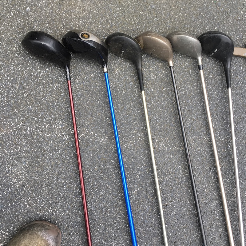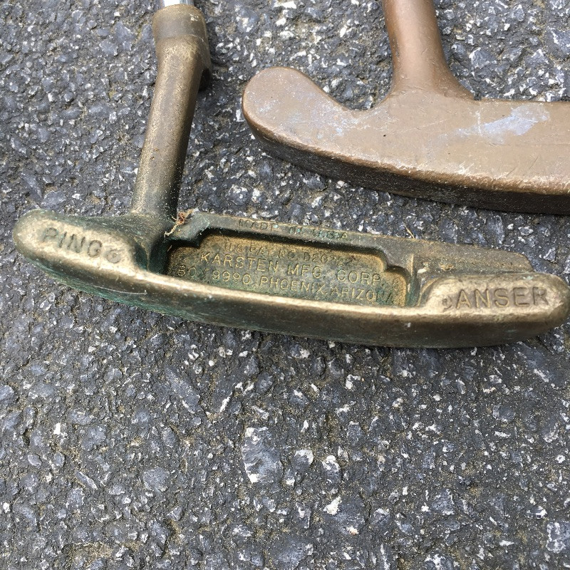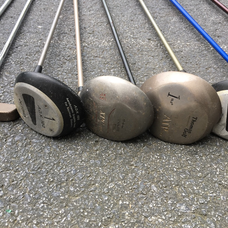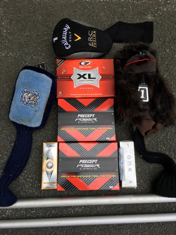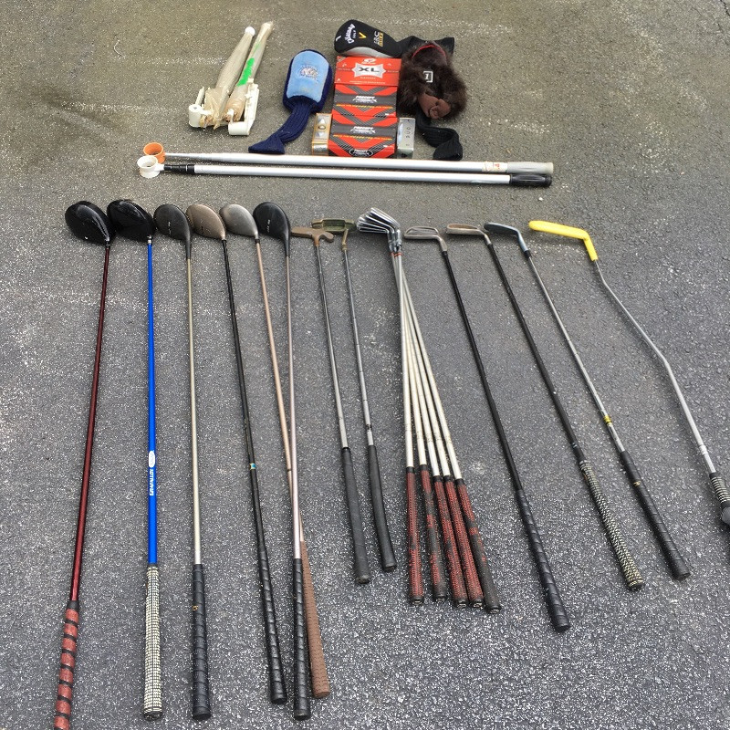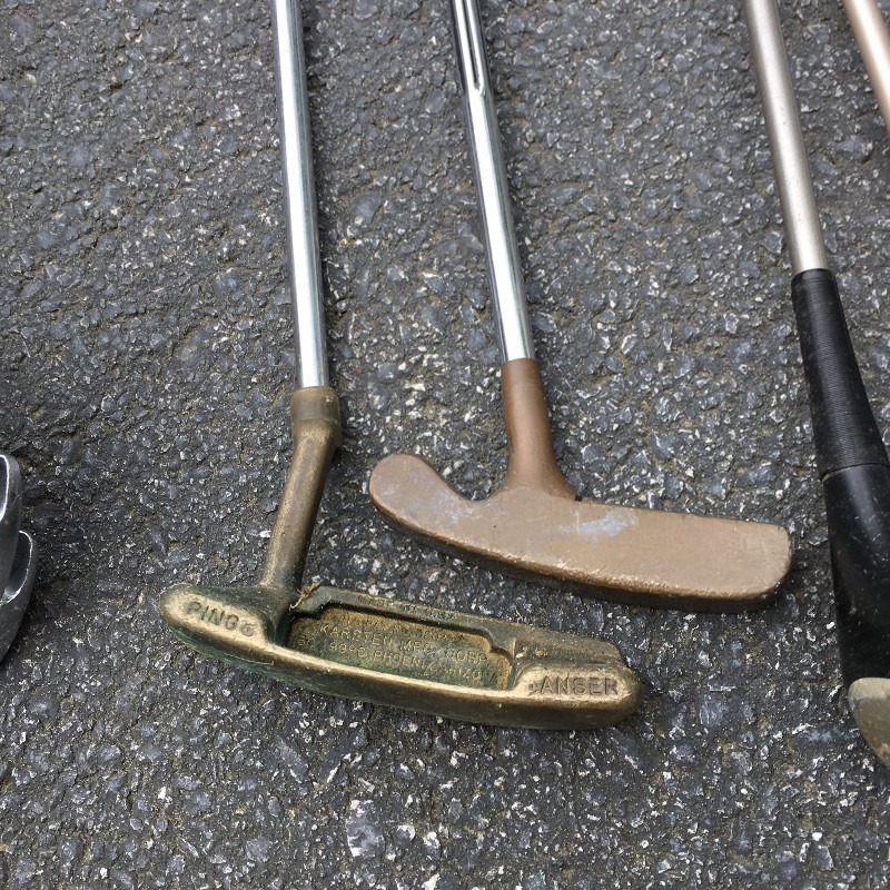 Ping Anser putter with six woods, eight irons, one practice club golf balls, two club brellas, two ball pick-ups and three wood covers. Longest wood measures 49”.