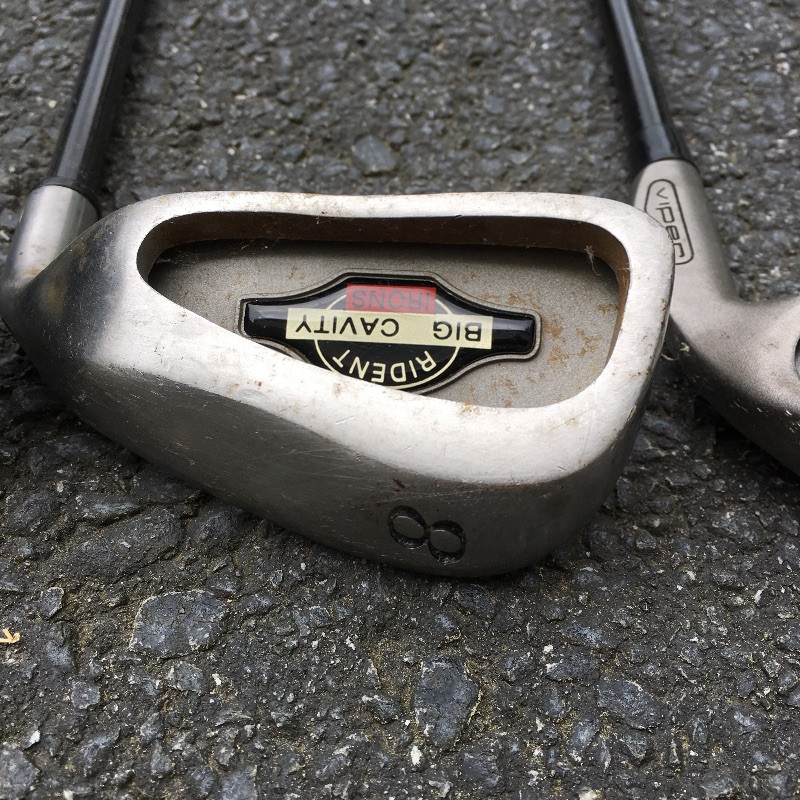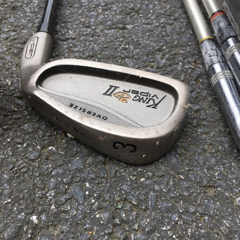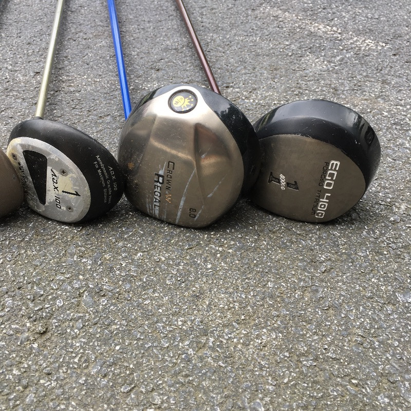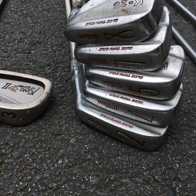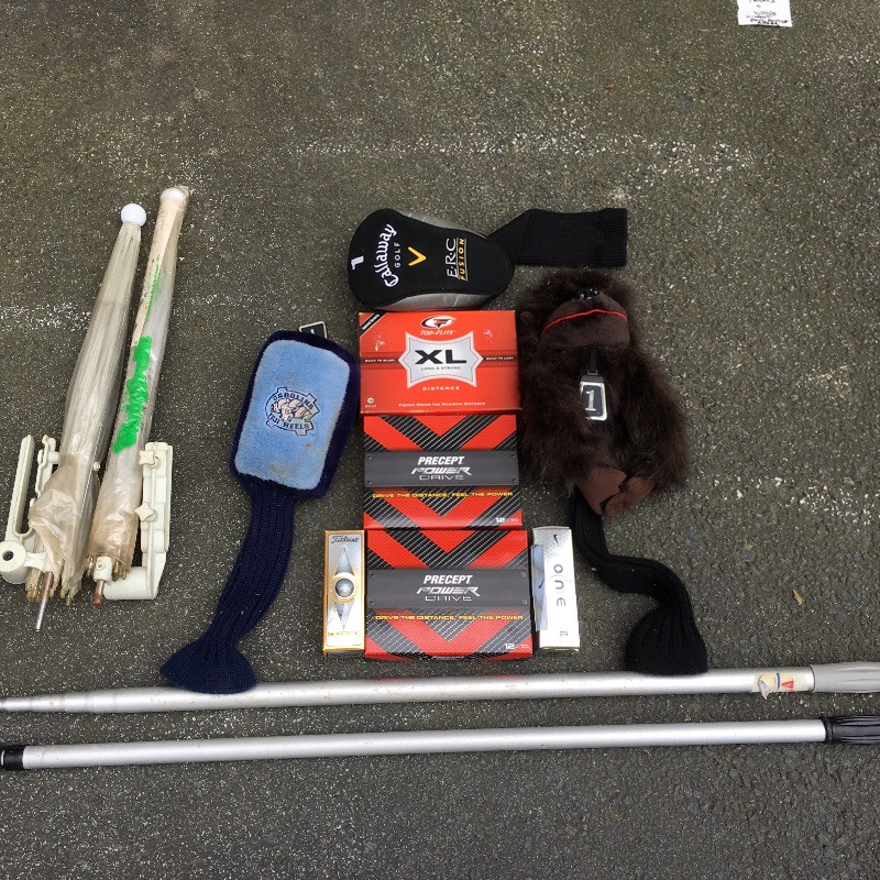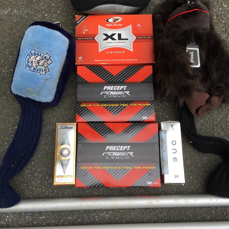 Ping Anser putter with six woods, eight irons, one practice club golf balls, two club brellas, two ball pick-ups and three wood covers. Longest wood measures 49”.