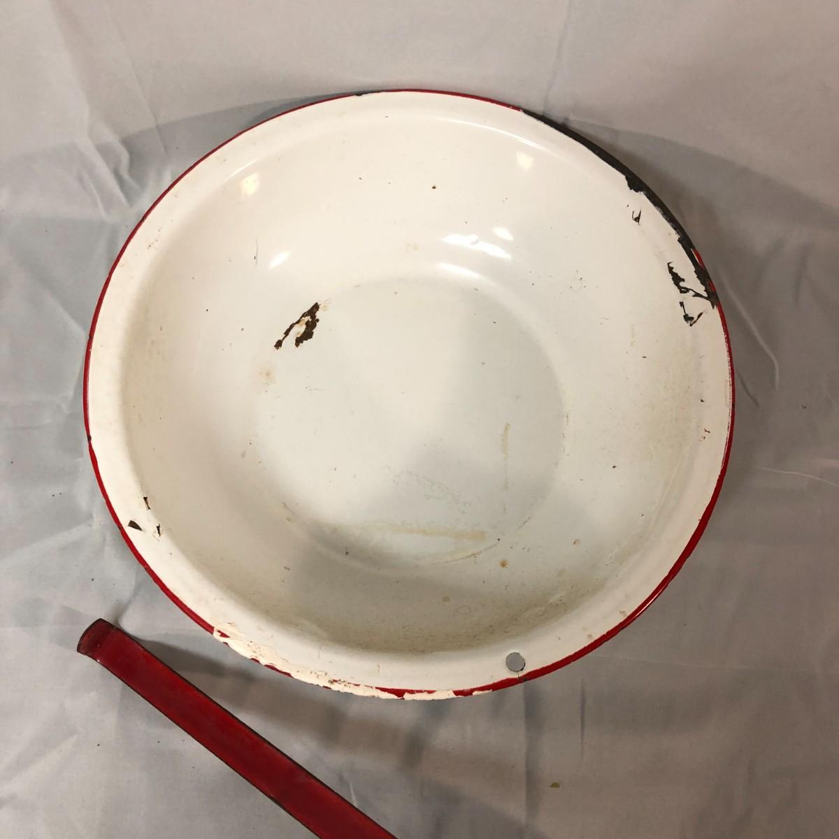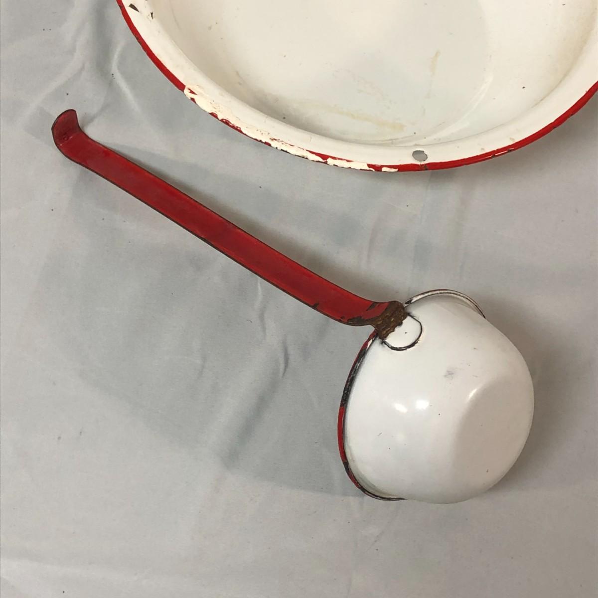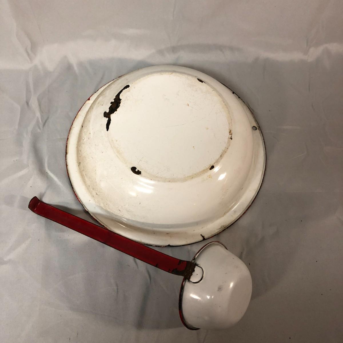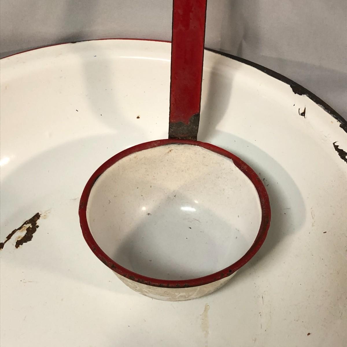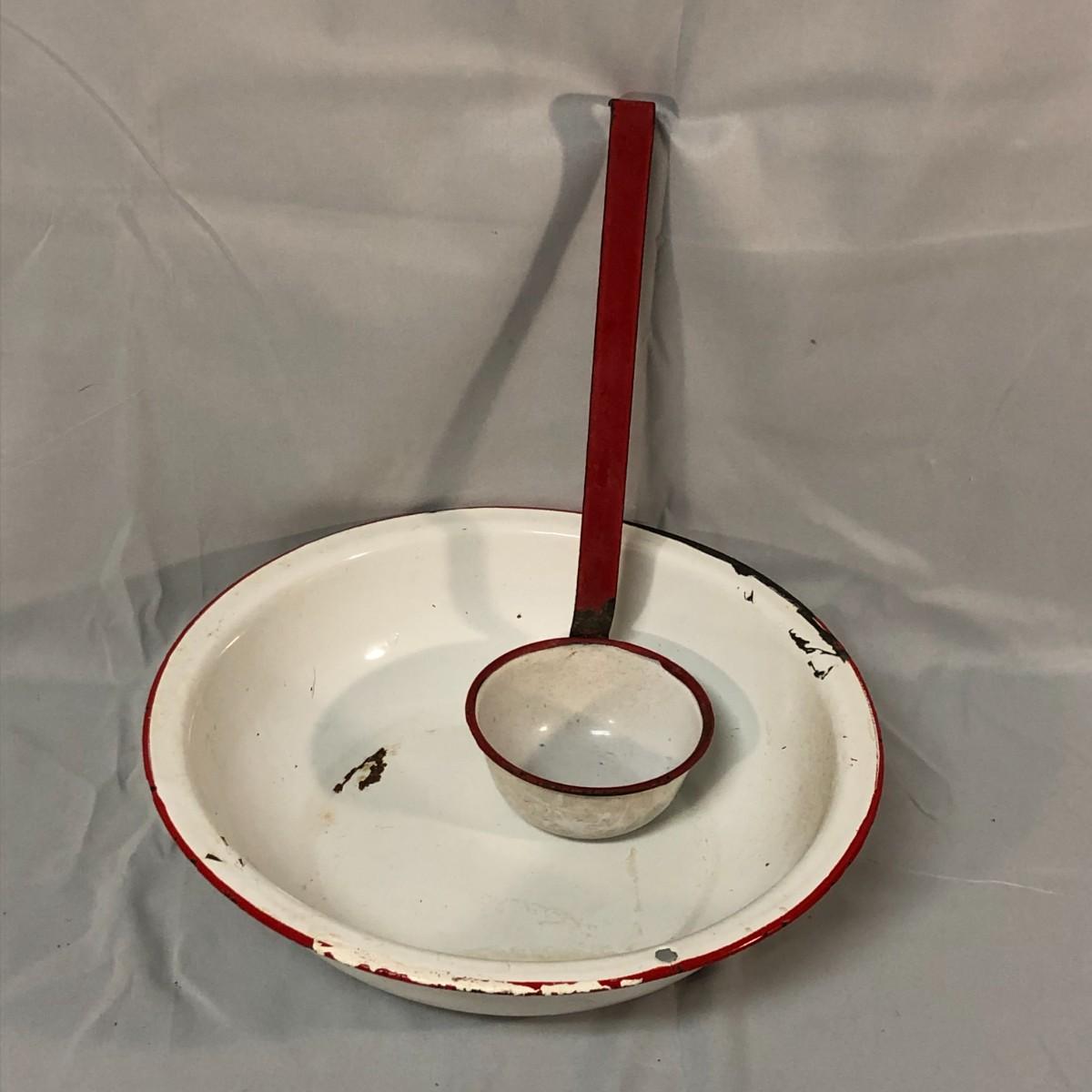 The pan is about 12.25" in diameter and the ladle is about 12" long. There is some enamel paint loss, but after cleaning these two, they will make great additions to your cabin or camper!