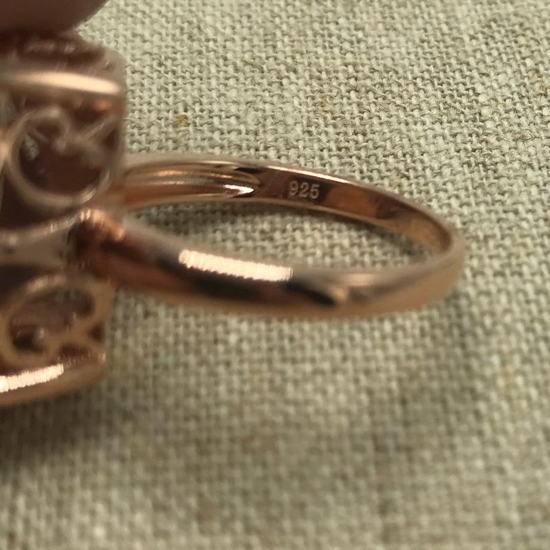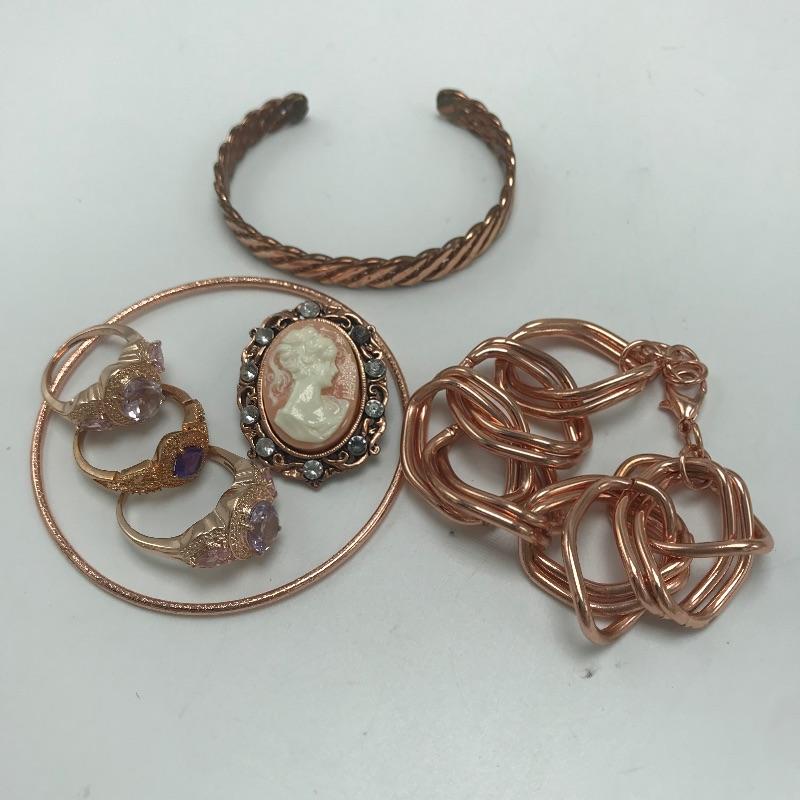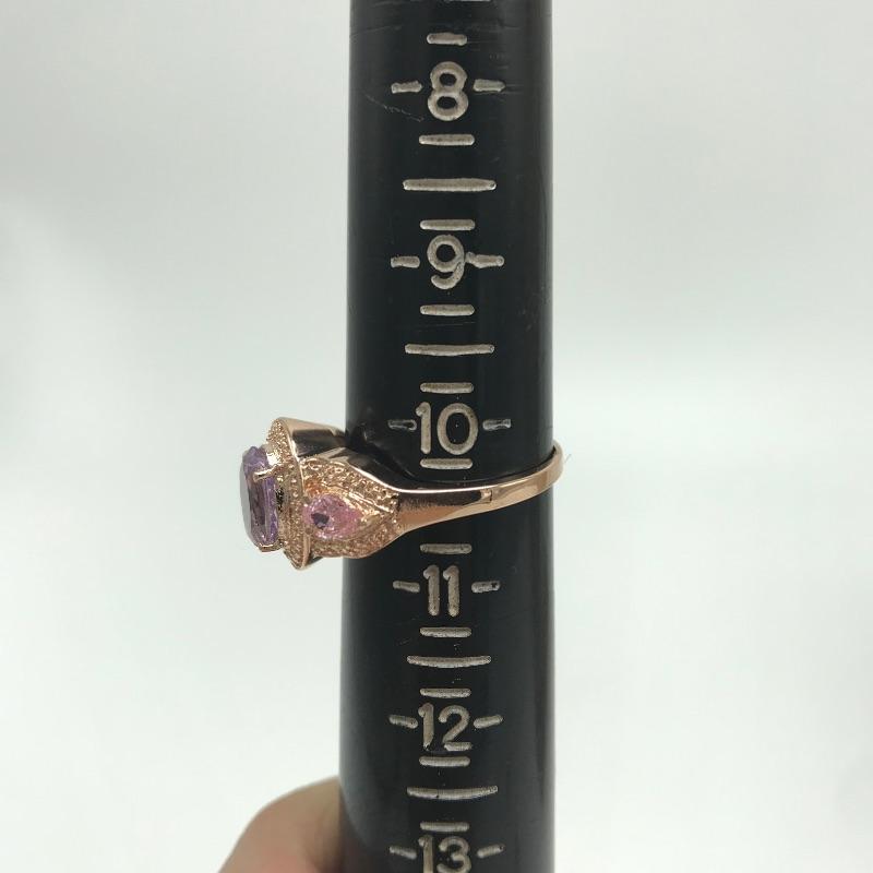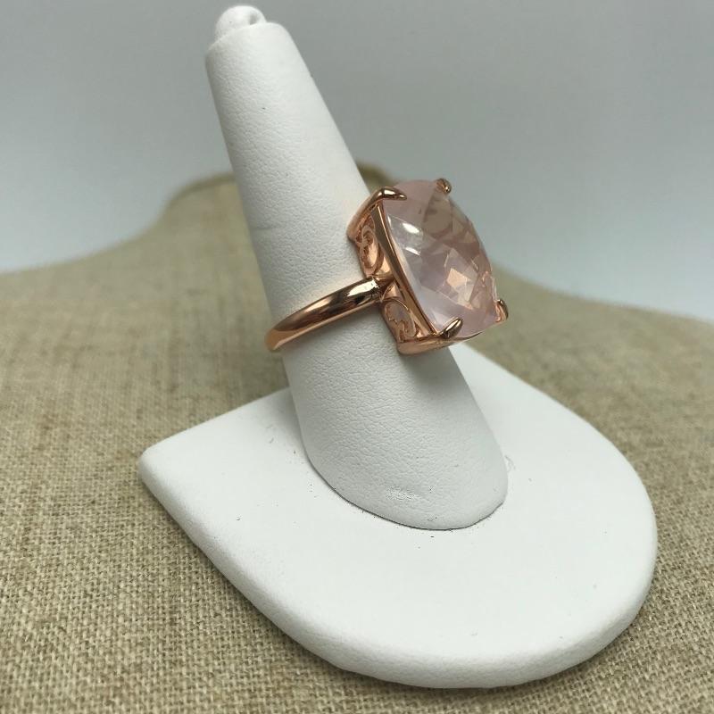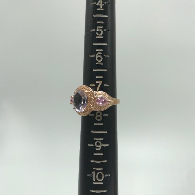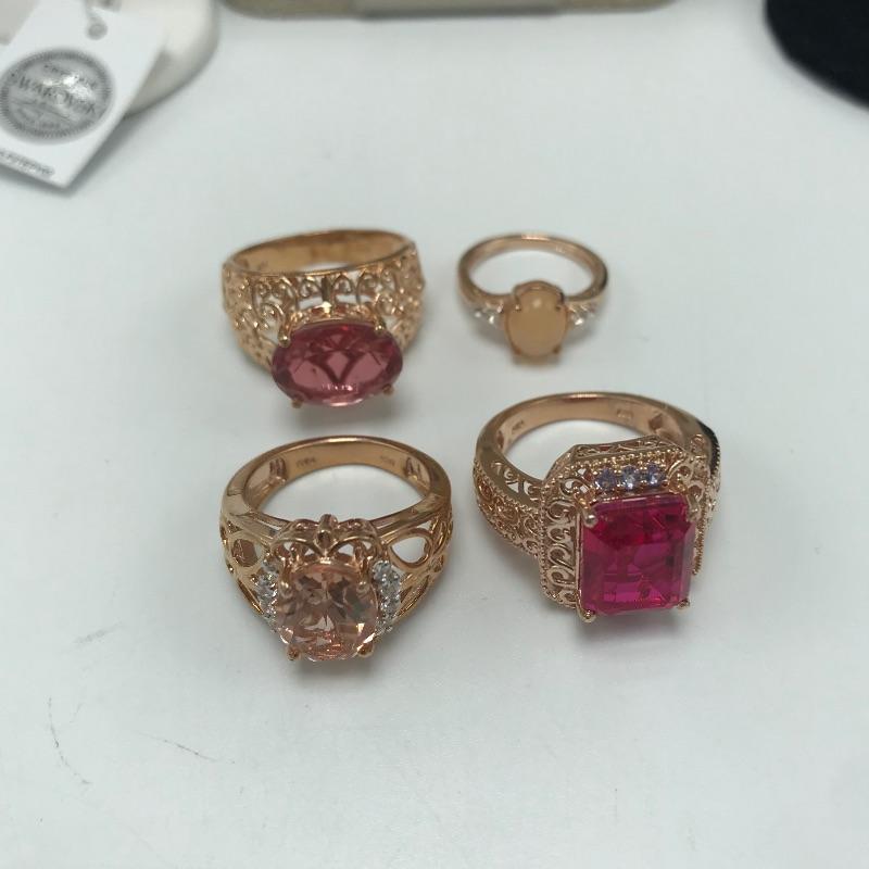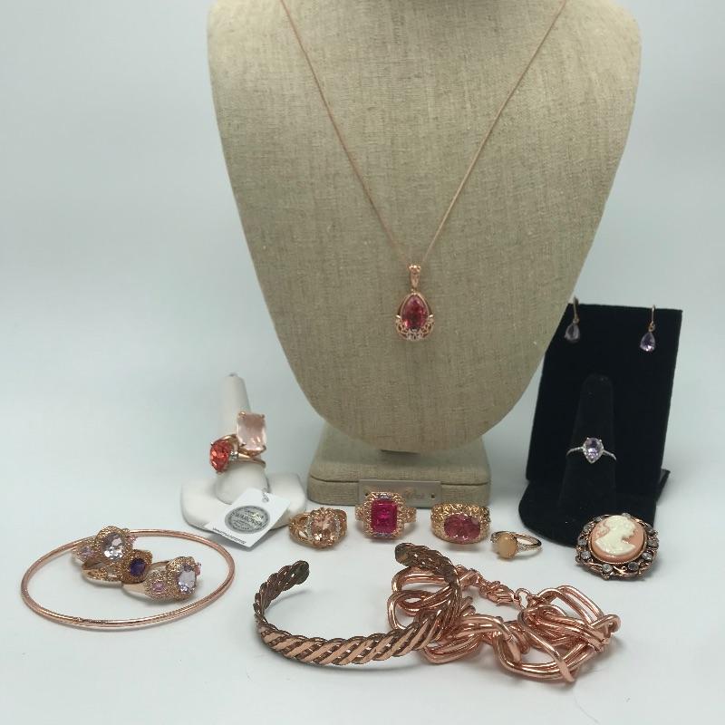 Stunning collection of rose colored jewelry with many pieces marked 925 and STS. Lot features a Swarovski ring with a decadent stone sure to dazzle any onlooker. The three rings photographed with the brooch appear to have Stainless Steel marks, the photo of four rings photographed together, the necklace and the earring/ring set are all marked STS and 925. All other markings and ring sizes are shown in photos.