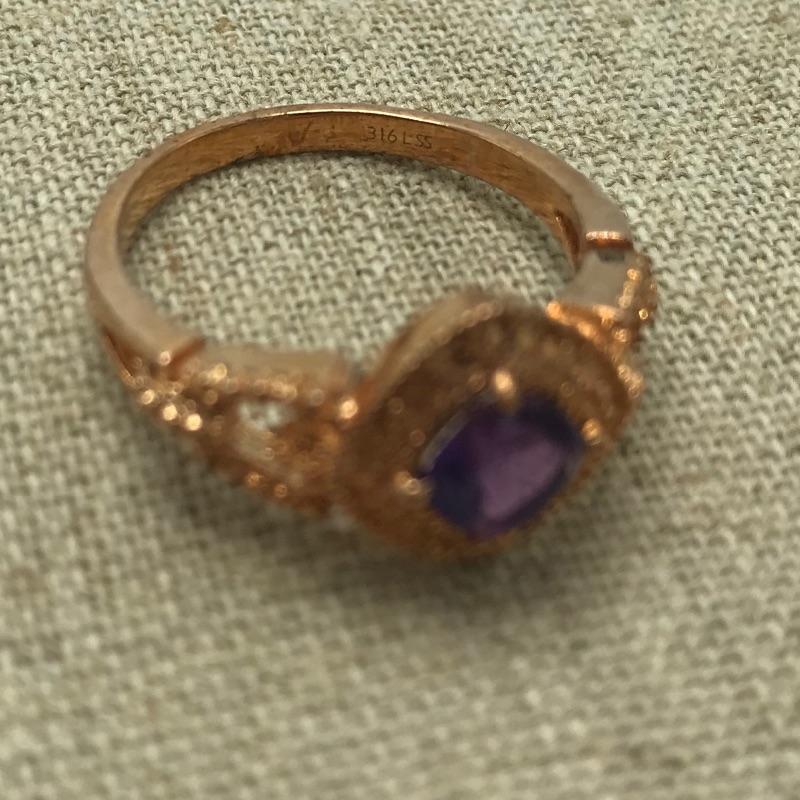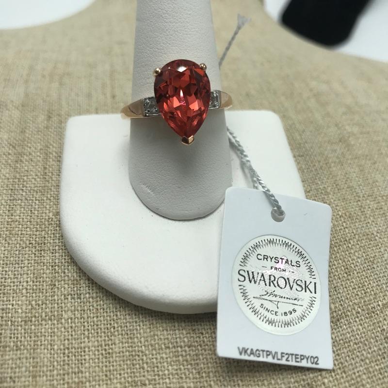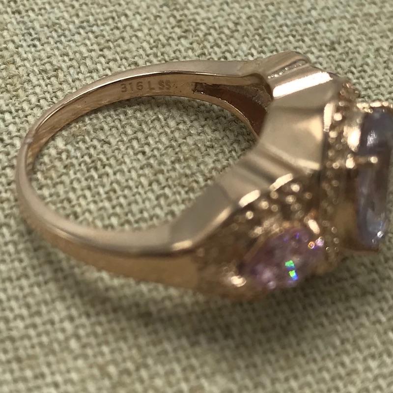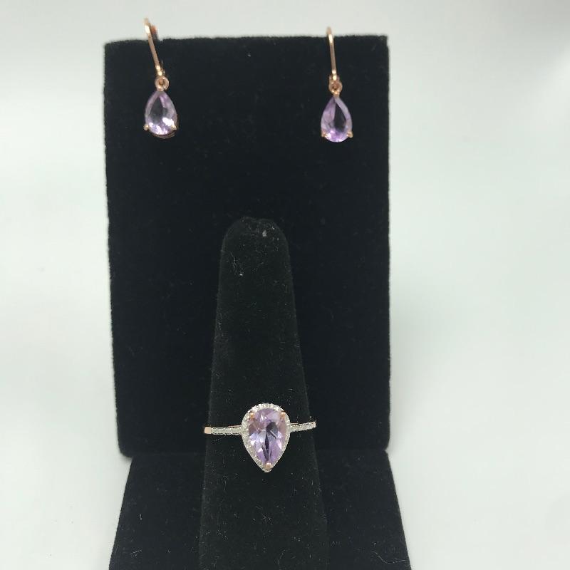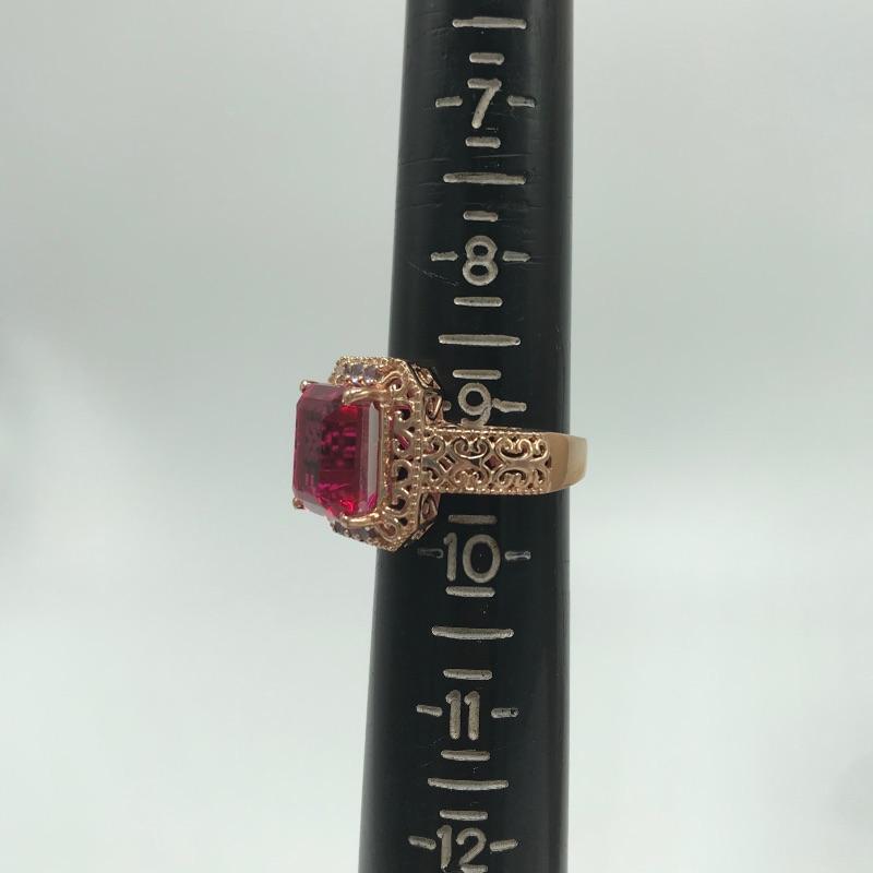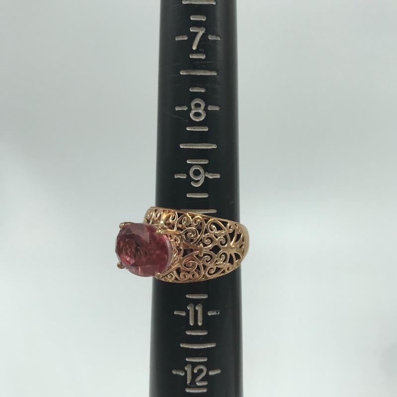 Stunning collection of rose colored jewelry with many pieces marked 925 and STS. Lot features a Swarovski ring with a decadent stone sure to dazzle any onlooker. The three rings photographed with the brooch appear to have Stainless Steel marks, the photo of four rings photographed together, the necklace and the earring/ring set are all marked STS and 925. All other markings and ring sizes are shown in photos.