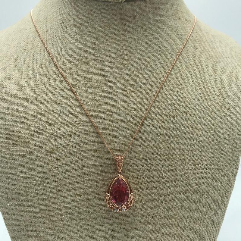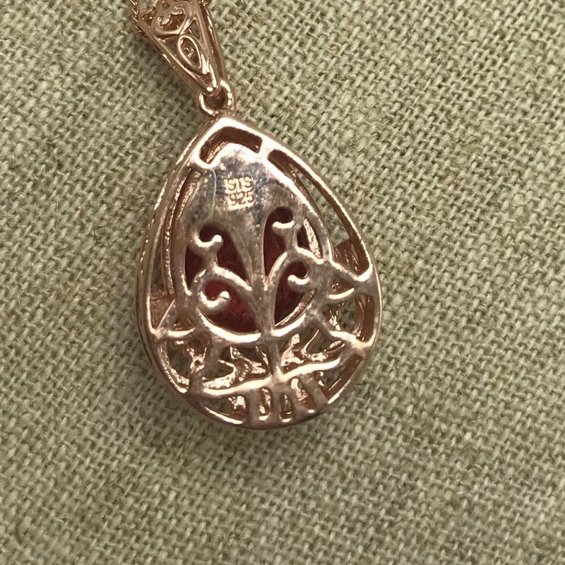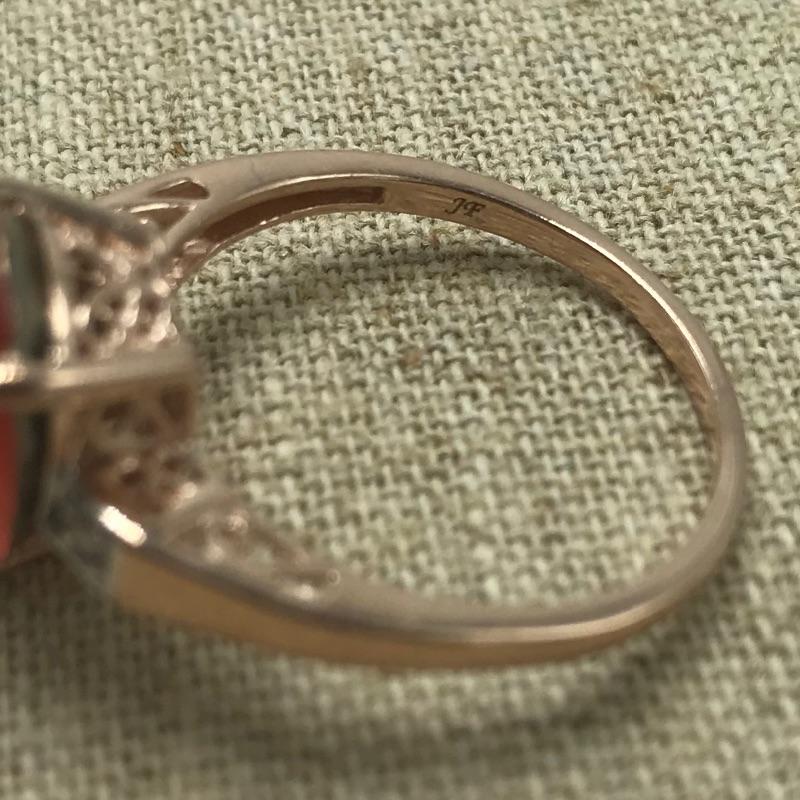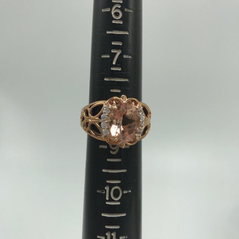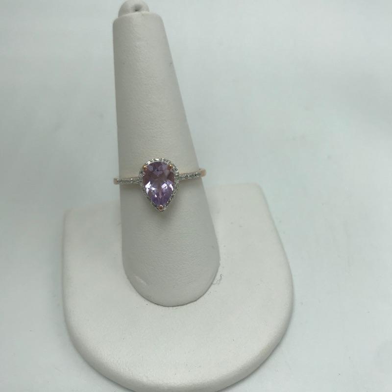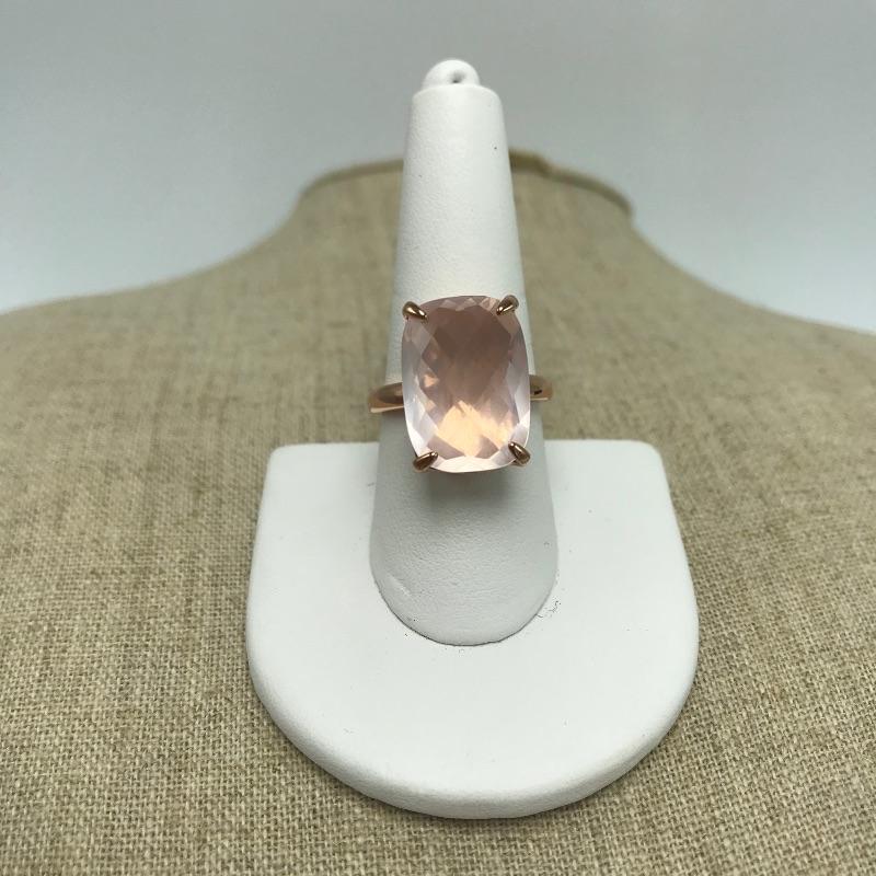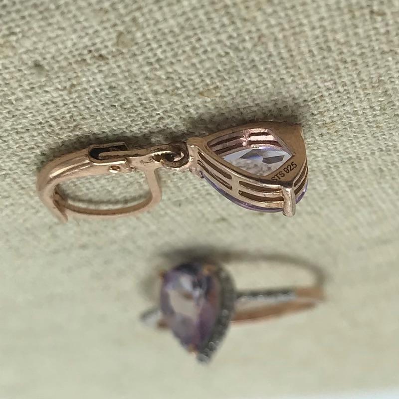 Stunning collection of rose colored jewelry with many pieces marked 925 and STS. Lot features a Swarovski ring with a decadent stone sure to dazzle any onlooker. The three rings photographed with the brooch appear to have Stainless Steel marks, the photo of four rings photographed together, the necklace and the earring/ring set are all marked STS and 925. All other markings and ring sizes are shown in photos.