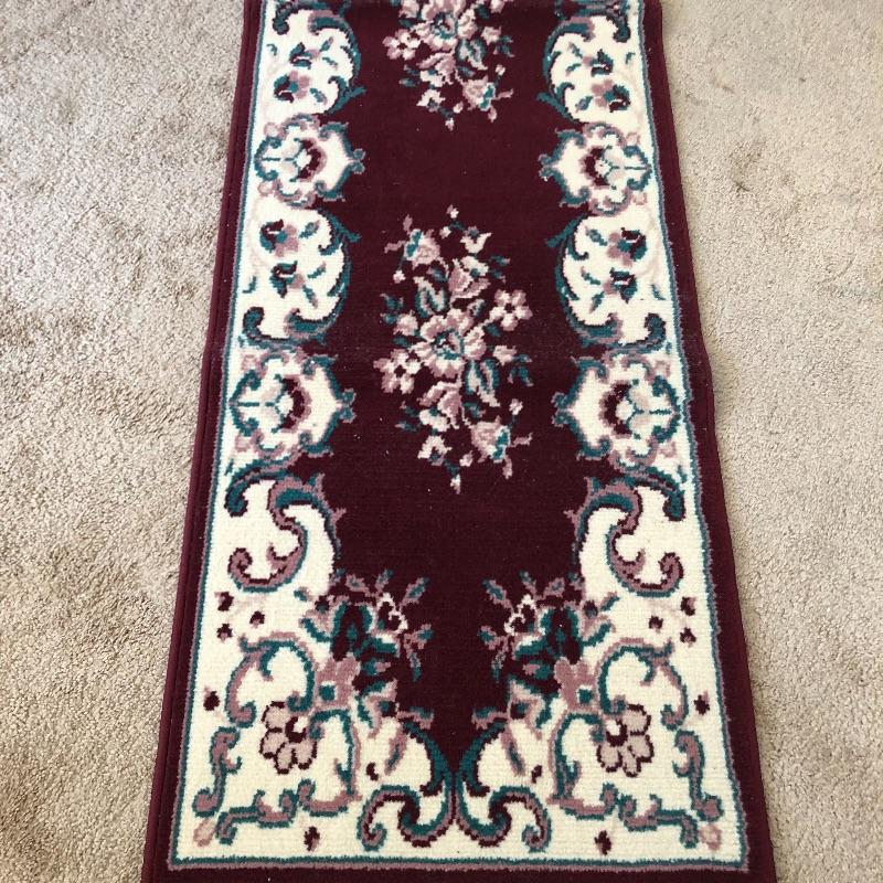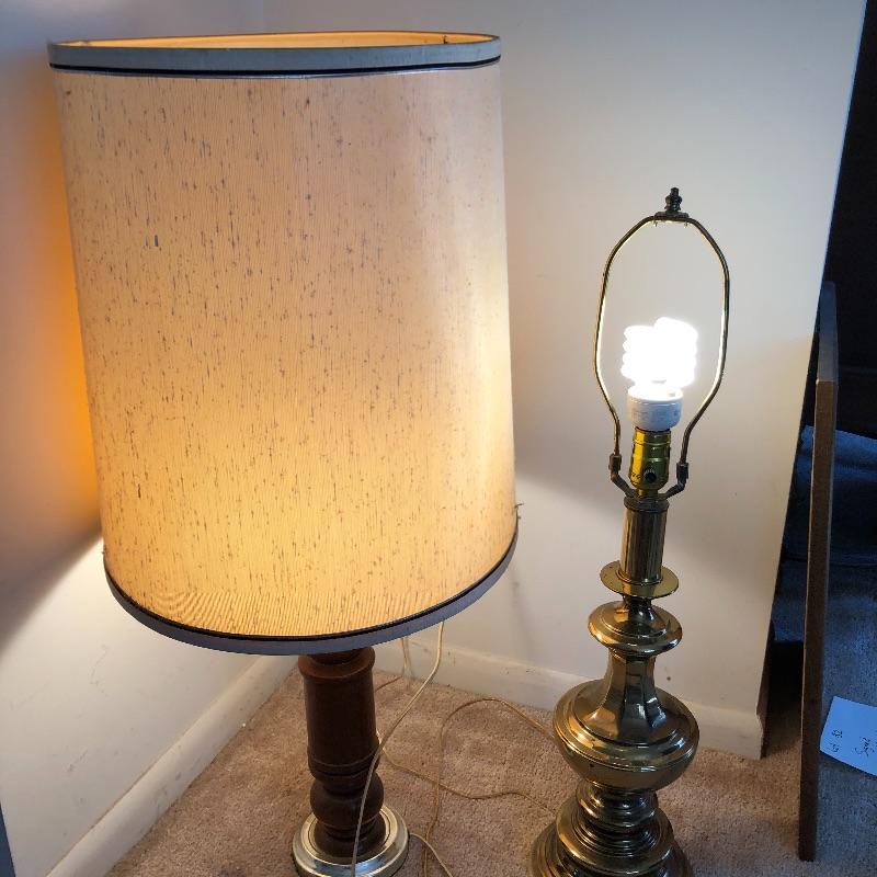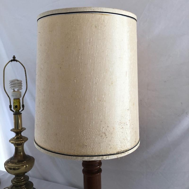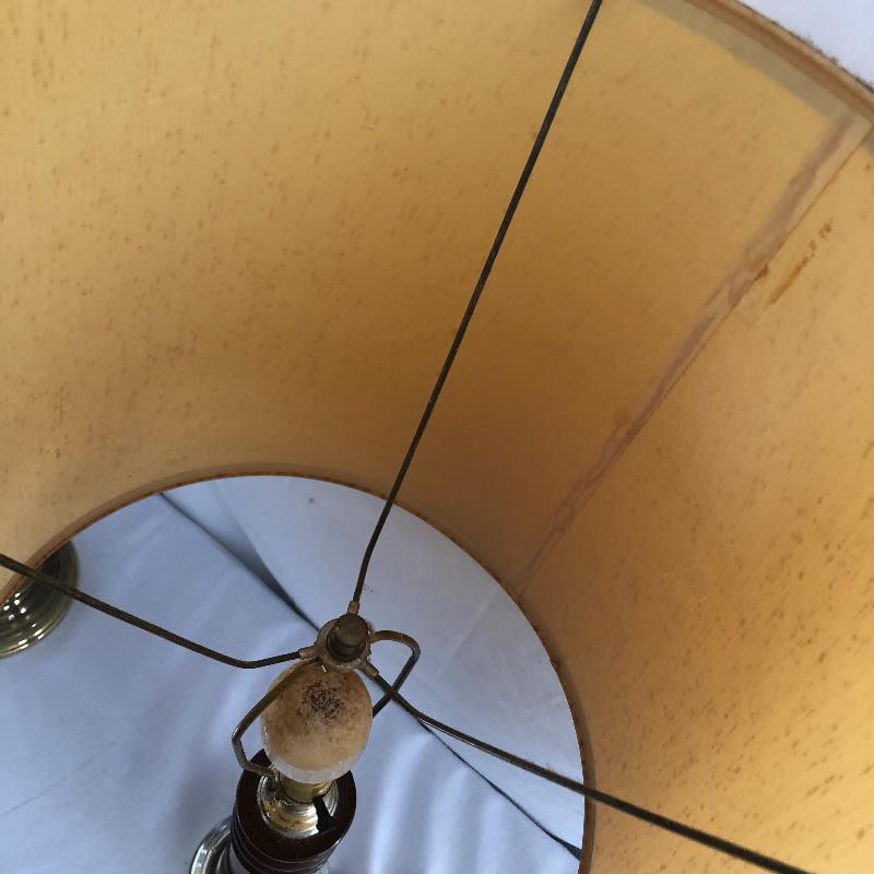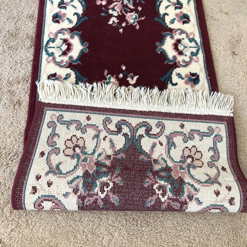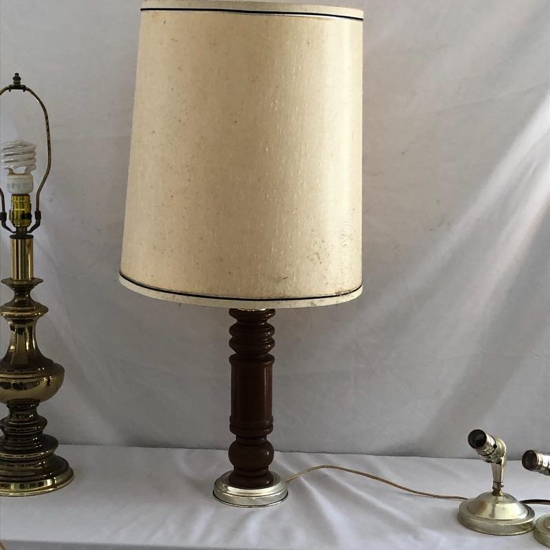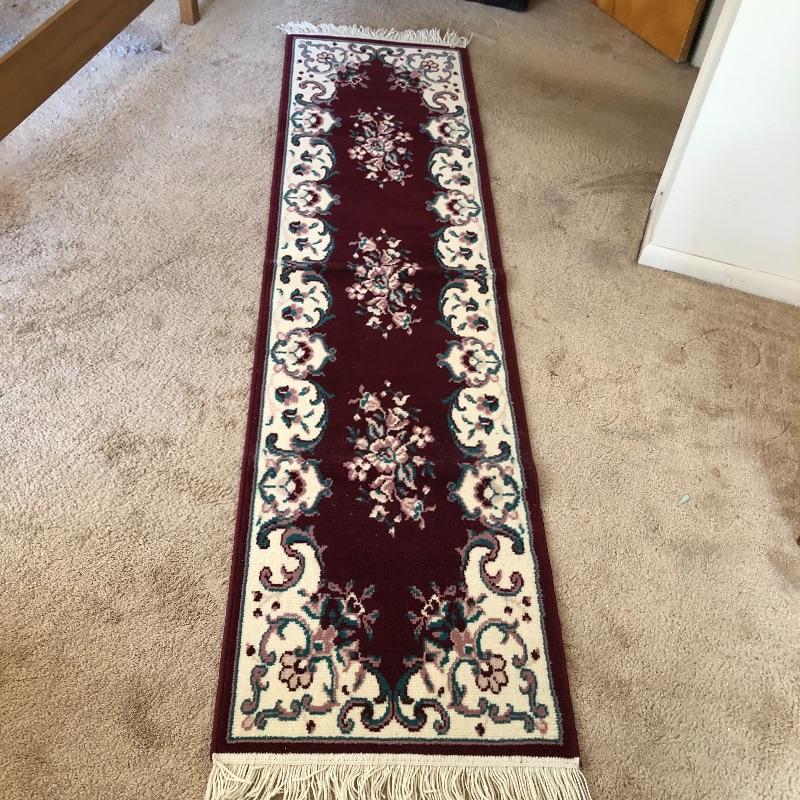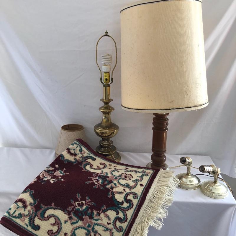 Four lamps altogether in this lot; tallest lamp is wood with brass colored base and a vintage cream shade. Also included is a brass table lamp and a pair of brass colored wall lamps, all worked when tested. The wall lamps’ socket and be adjusted 180°. The runner rug is white and dark red and is in good condition.