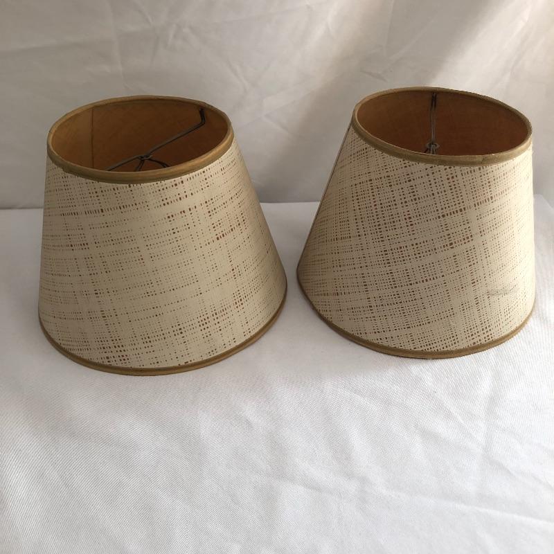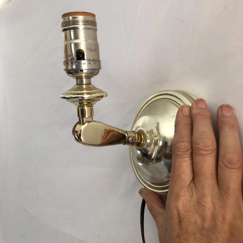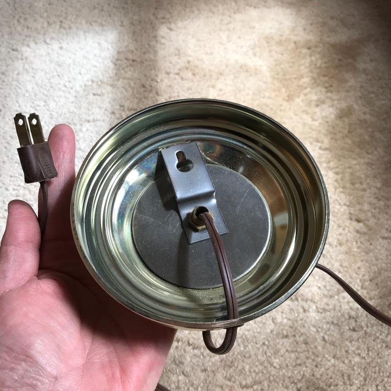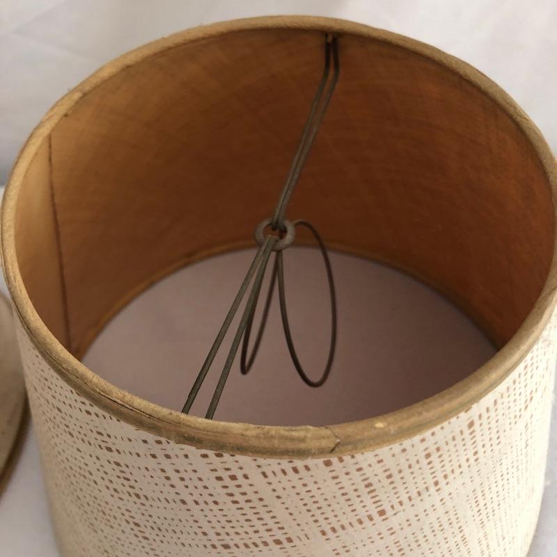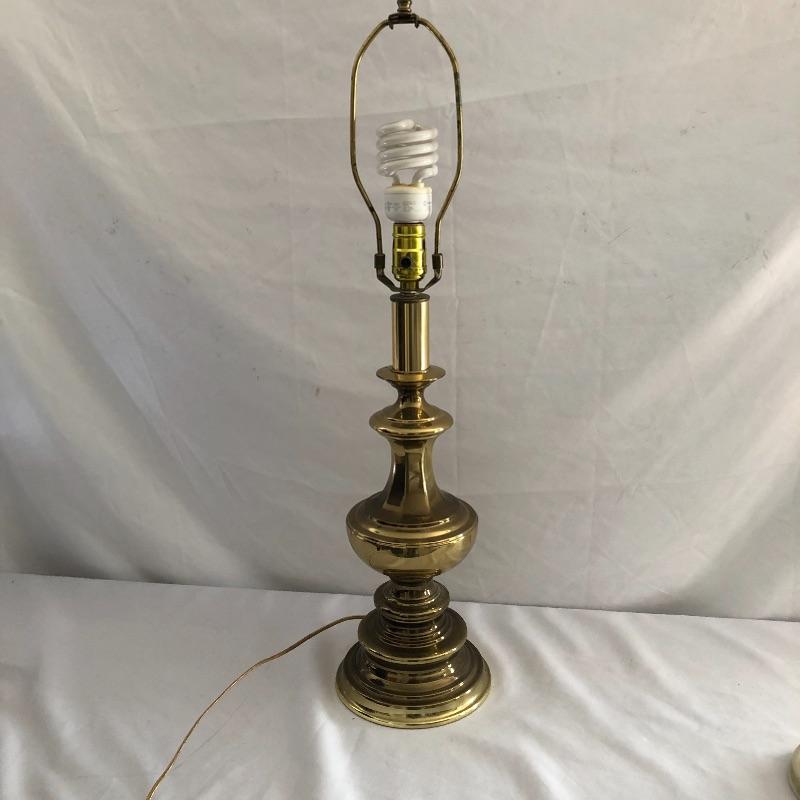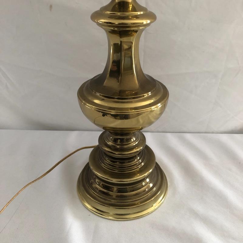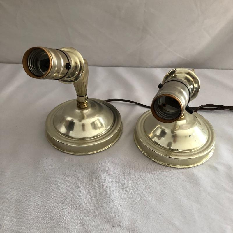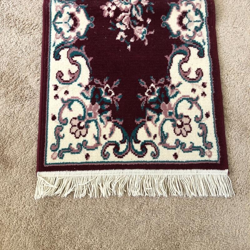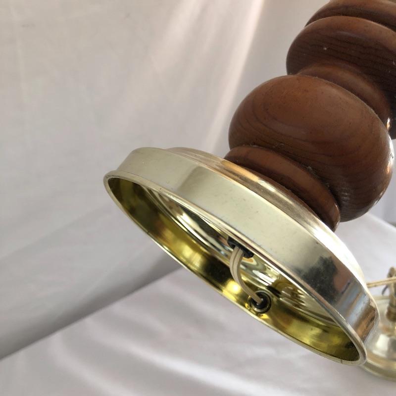 Four lamps altogether in this lot; tallest lamp is wood with brass colored base and a vintage cream shade. Also included is a brass table lamp and a pair of brass colored wall lamps, all worked when tested. The wall lamps’ socket and be adjusted 180°. The runner rug is white and dark red and is in good condition.