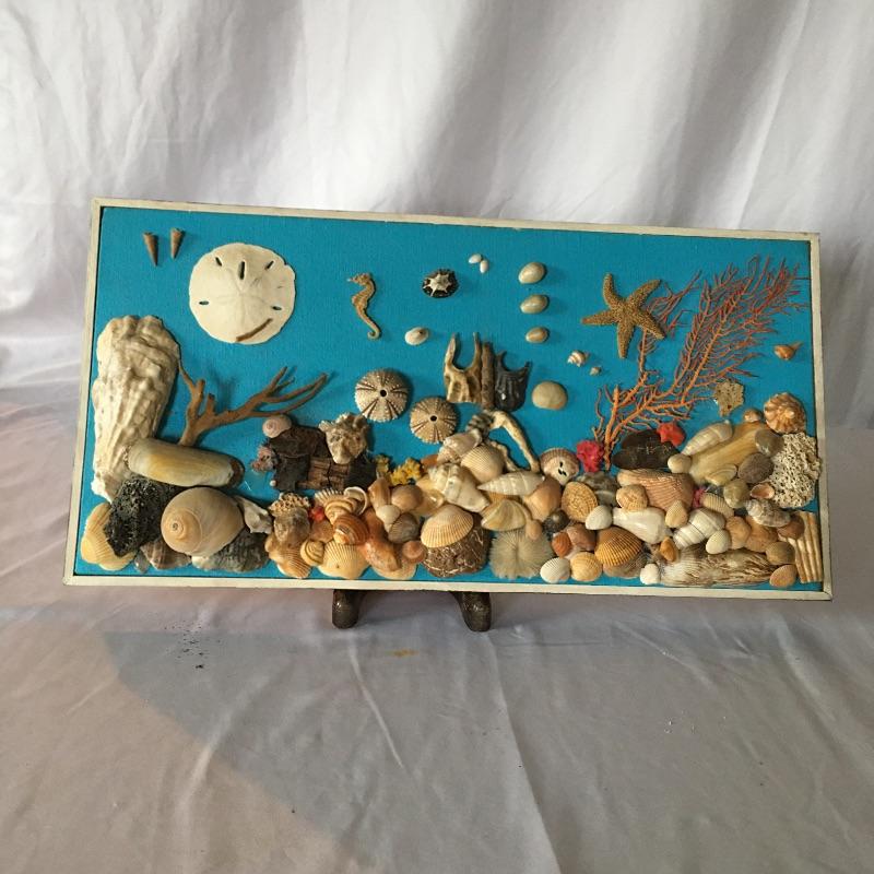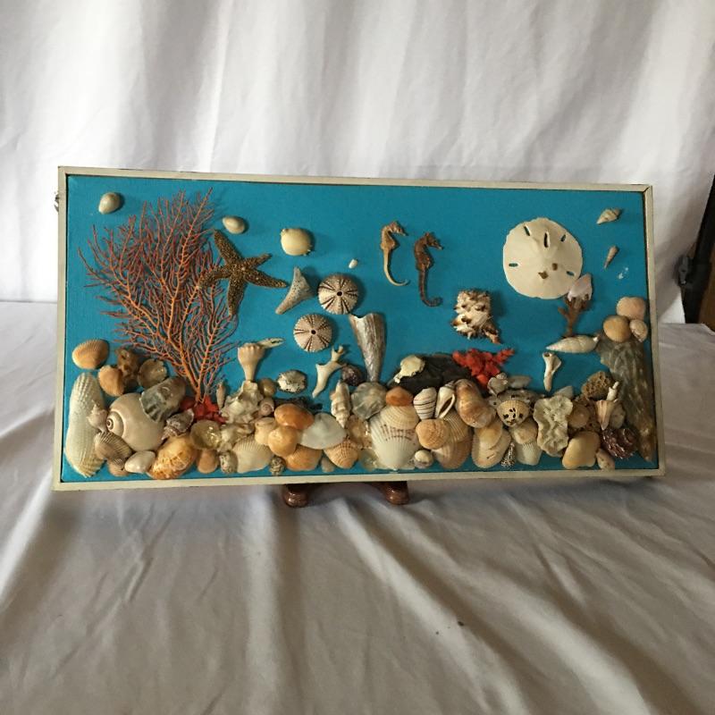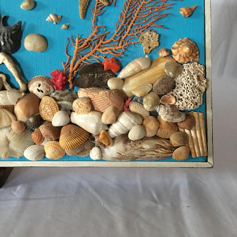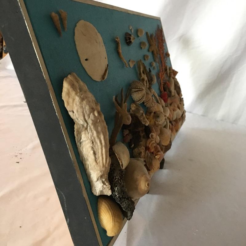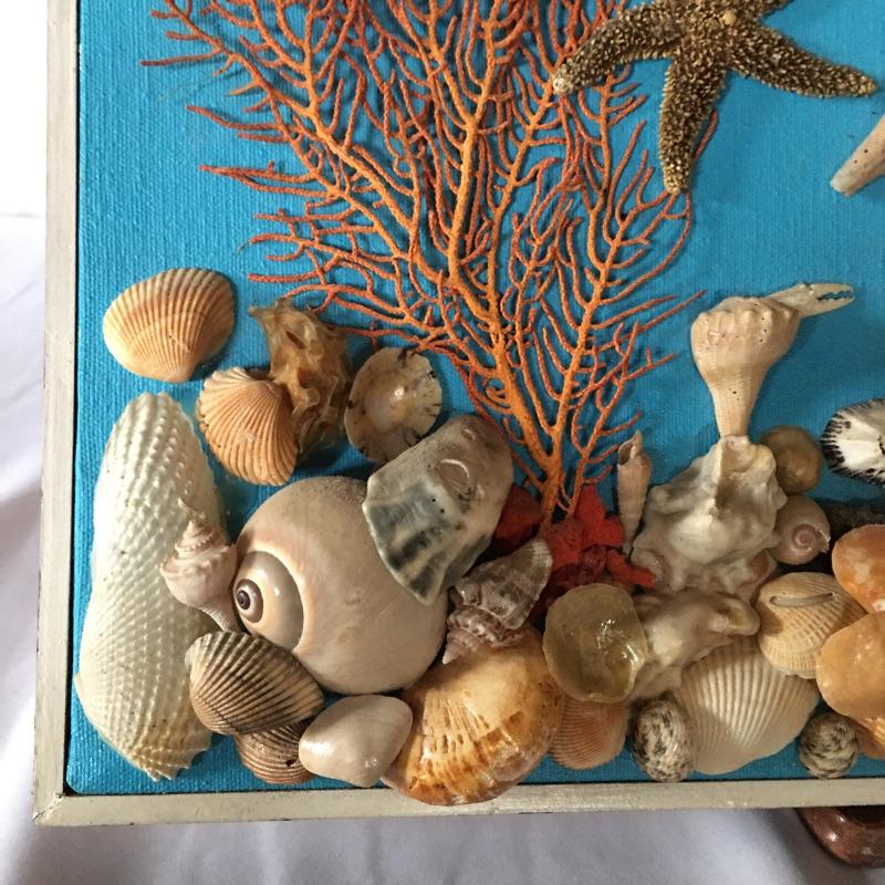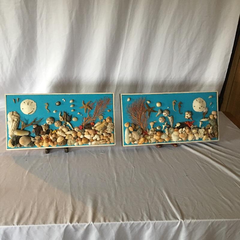 Bring the ocean indoors with these two pieces of artwork that have shells, sea horses, starfish, sand dollars and more attached to a framed canvas. Frames measures 10.5” x 20.5” and have torn paper on the back, see pictures.