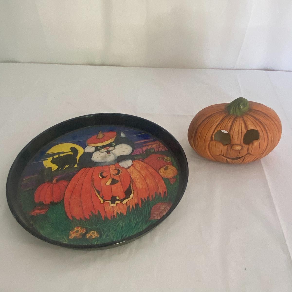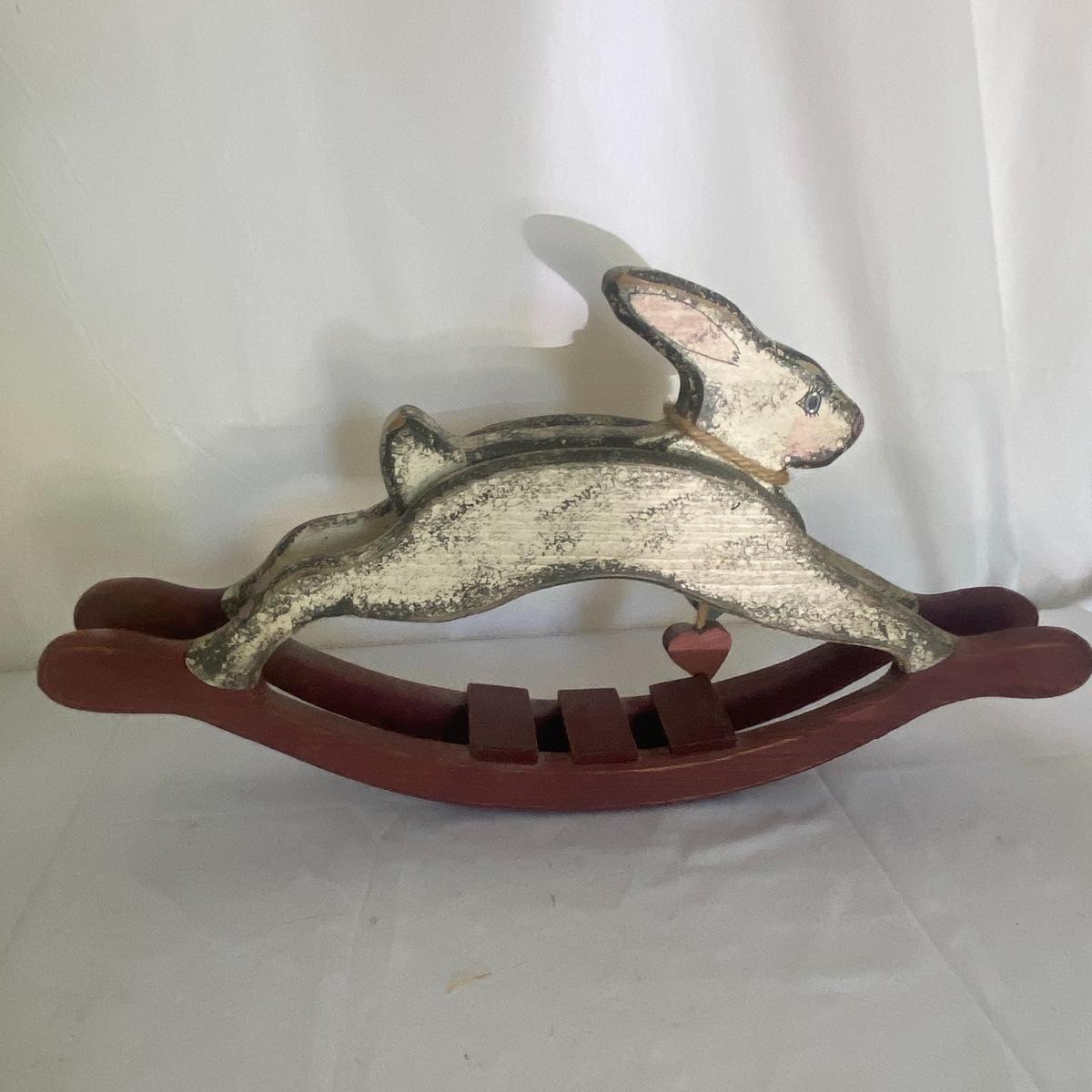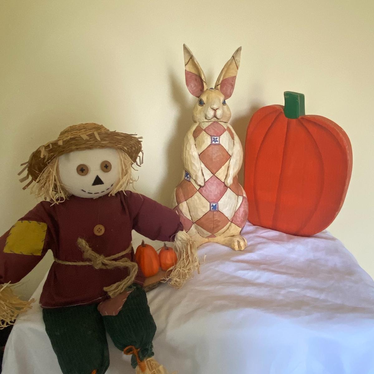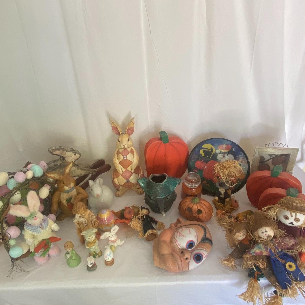 Large seasonal decor lot to have your space ready for multiple seasons! This lot primarily carters to the fall and spring seasons as well as the holidays Halloween and Easter. The shelf scarecrow sits 12” high. The tall bunny stand 16” tall. The largest wooden pumpkin has measurements of 12.5”x9”. Rocking bunny is 22” long. See photos for details. Local pickup only.