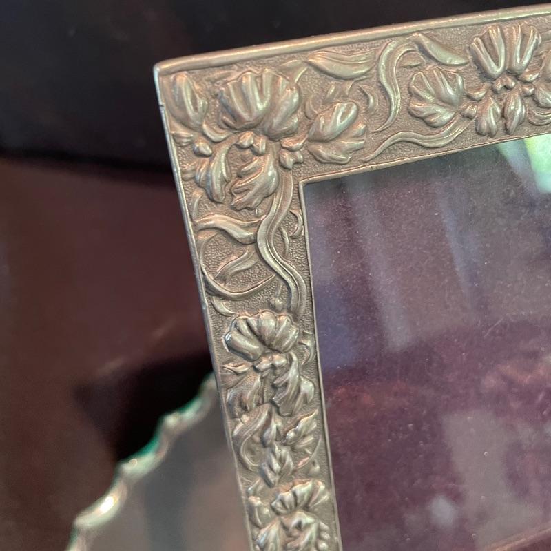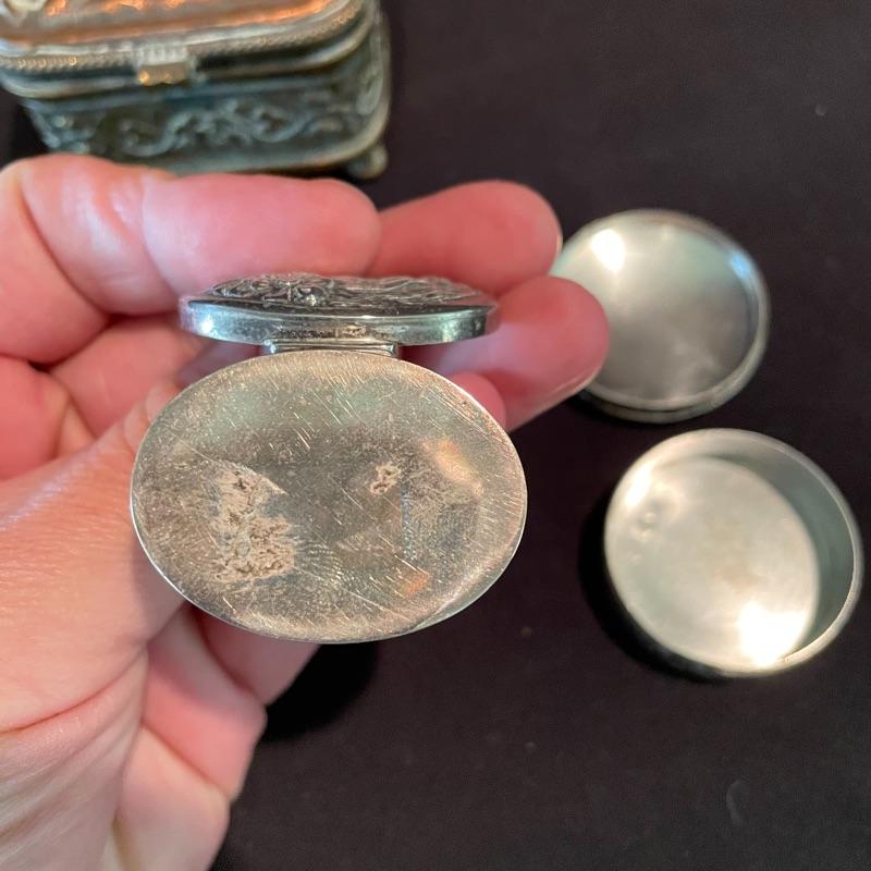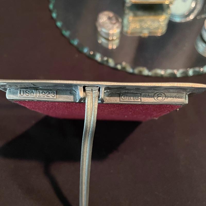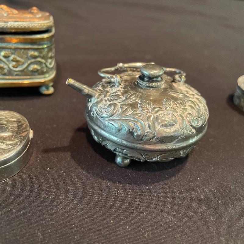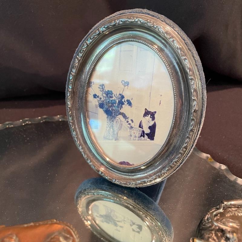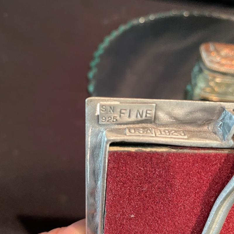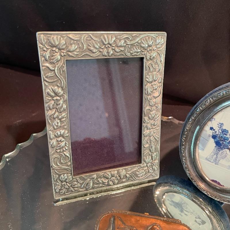 Shiny silver colored boxes with two frames, one marked 925 FINE, USA 1923 and also E Pewter. The other frames is complete with an adorable cat photo and felt lining. Lot also features a circular box marked 800 and two other unmarked boxes with intricate designs. Lastly, we’re offering a display mirror and what appears to be a miniature teapot. The frame marked 925 is approximately 3.25” x 5”. See photos. Shipping available