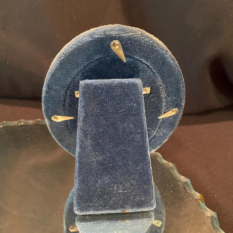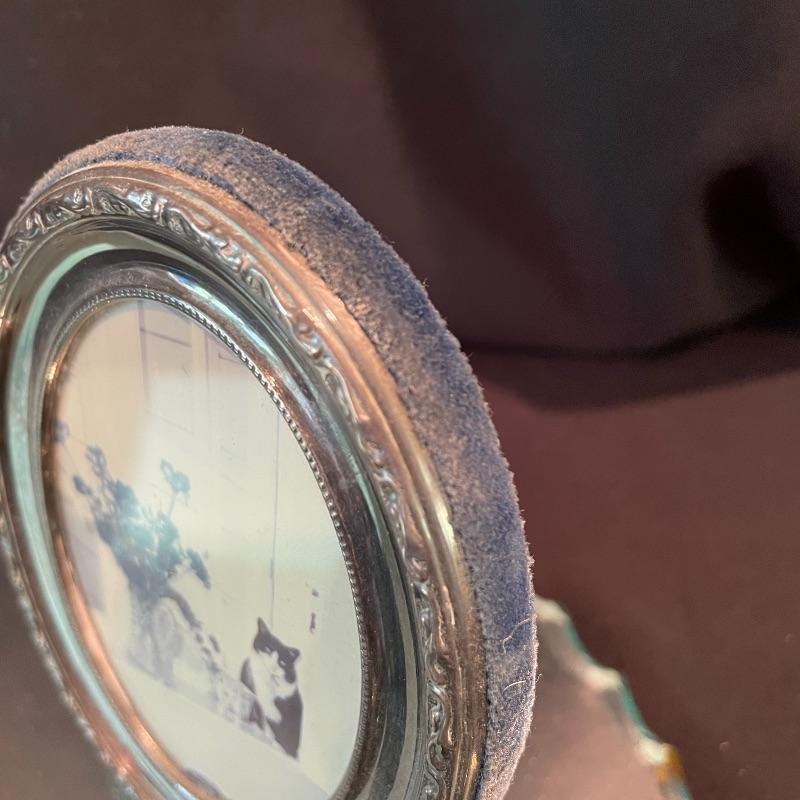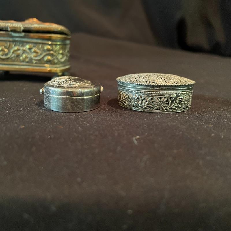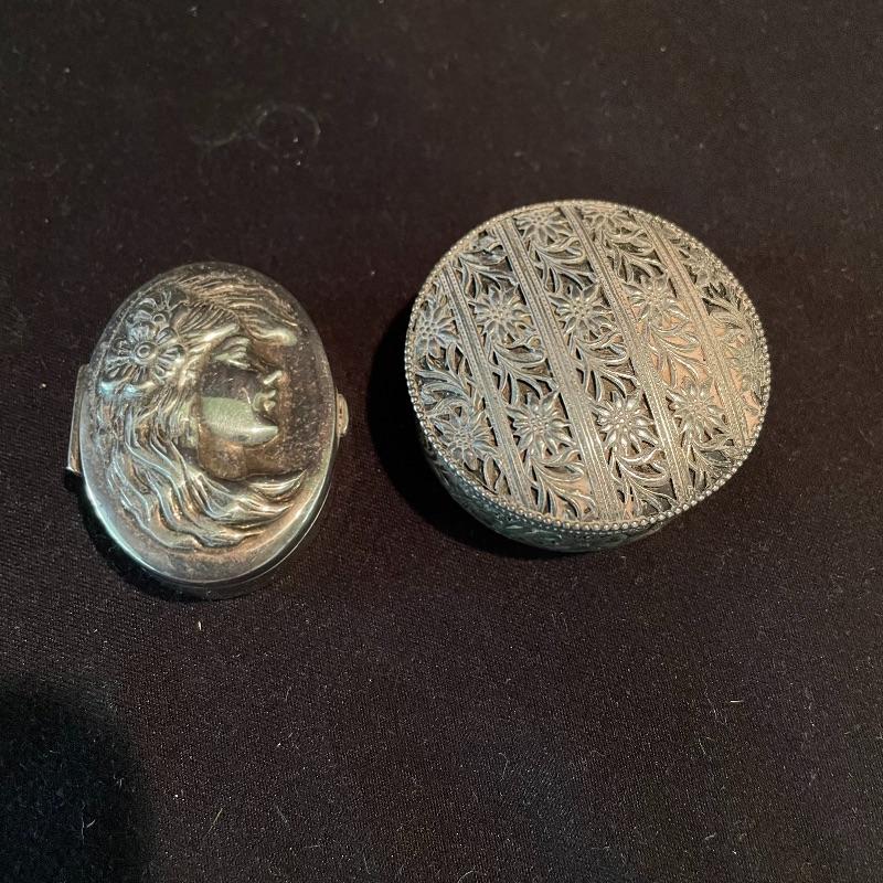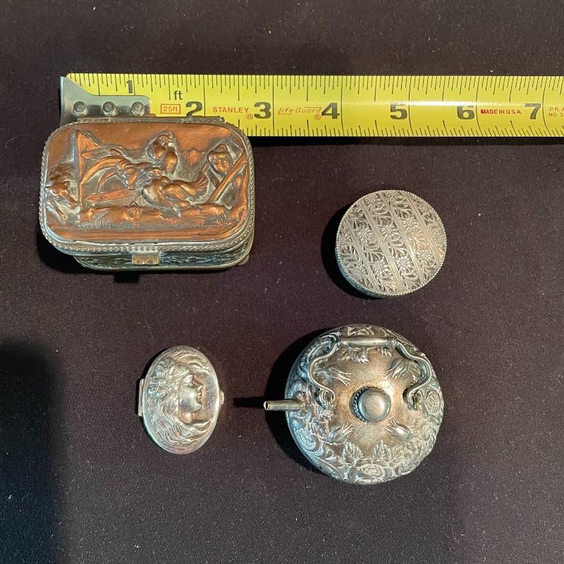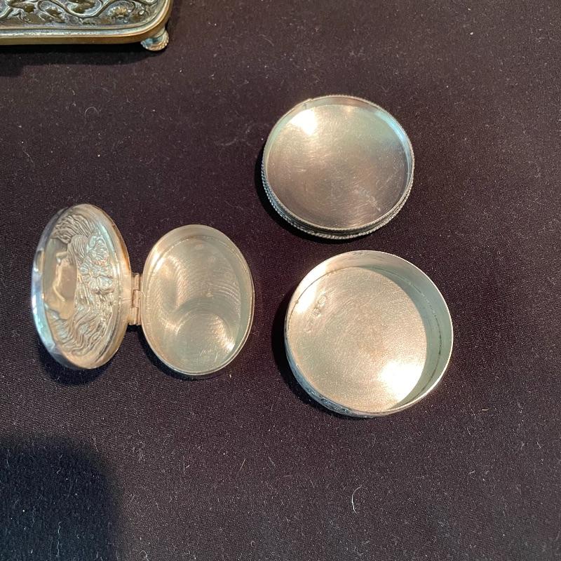 Shiny silver colored boxes with two frames, one marked 925 FINE, USA 1923 and also E Pewter. The other frames is complete with an adorable cat photo and felt lining. Lot also features a circular box marked 800 and two other unmarked boxes with intricate designs. Lastly, we’re offering a display mirror and what appears to be a miniature teapot. The frame marked 925 is approximately 3.25” x 5”. See photos. Shipping available