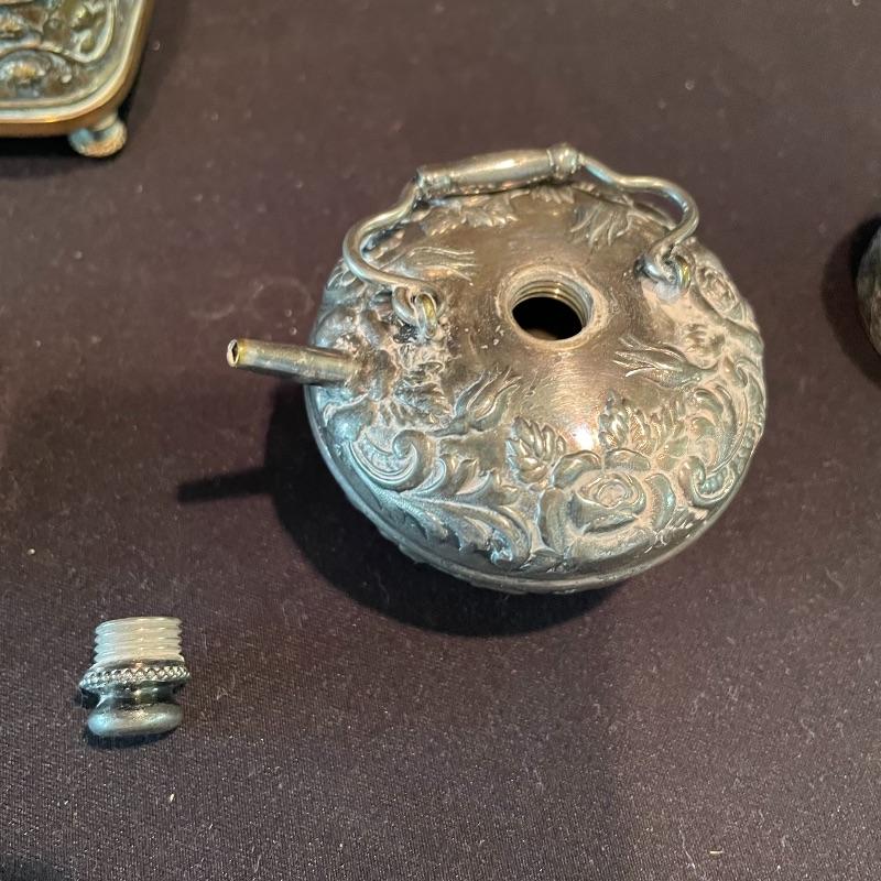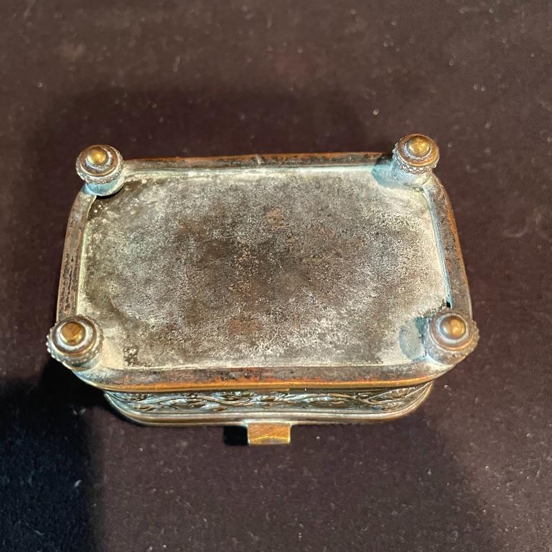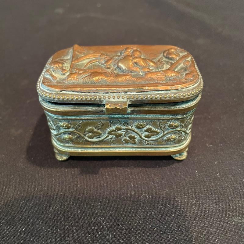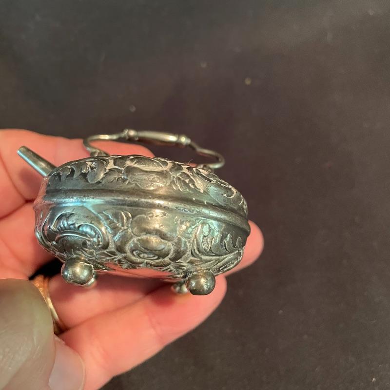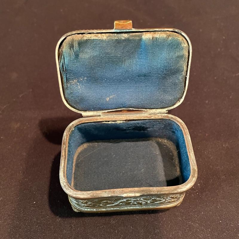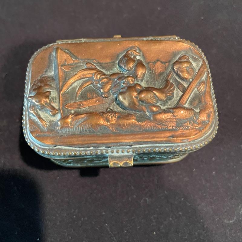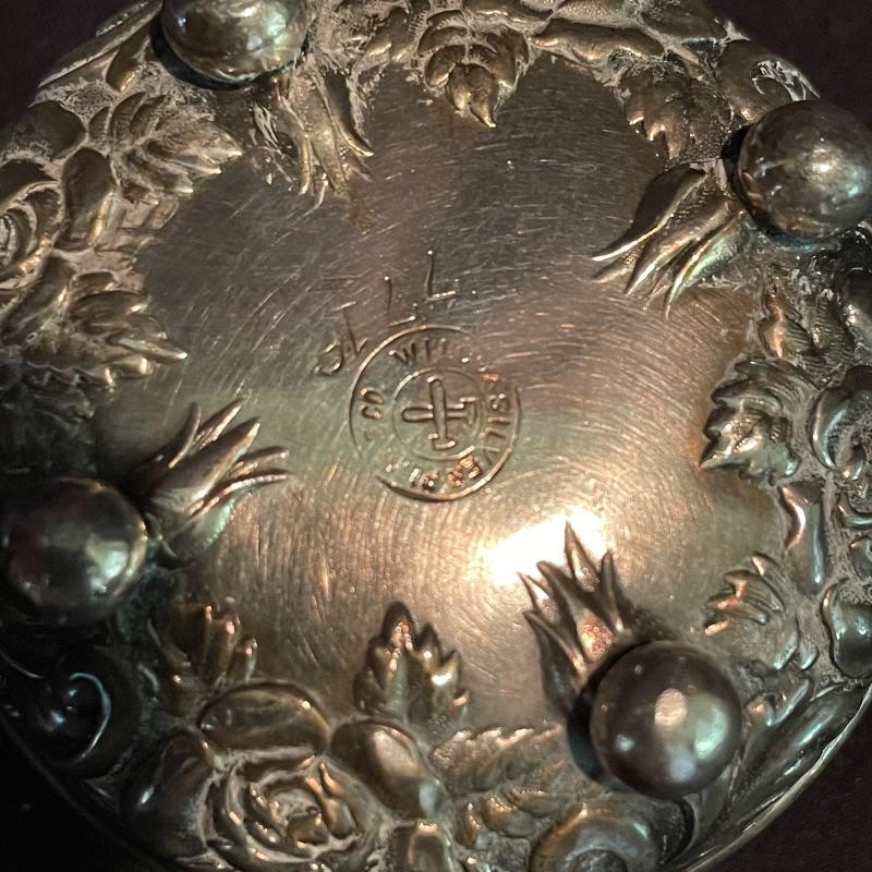 Shiny silver colored boxes with two frames, one marked 925 FINE, USA 1923 and also E Pewter. The other frames is complete with an adorable cat photo and felt lining. Lot also features a circular box marked 800 and two other unmarked boxes with intricate designs. Lastly, we’re offering a display mirror and what appears to be a miniature teapot. The frame marked 925 is approximately 3.25” x 5”. See photos. Shipping available