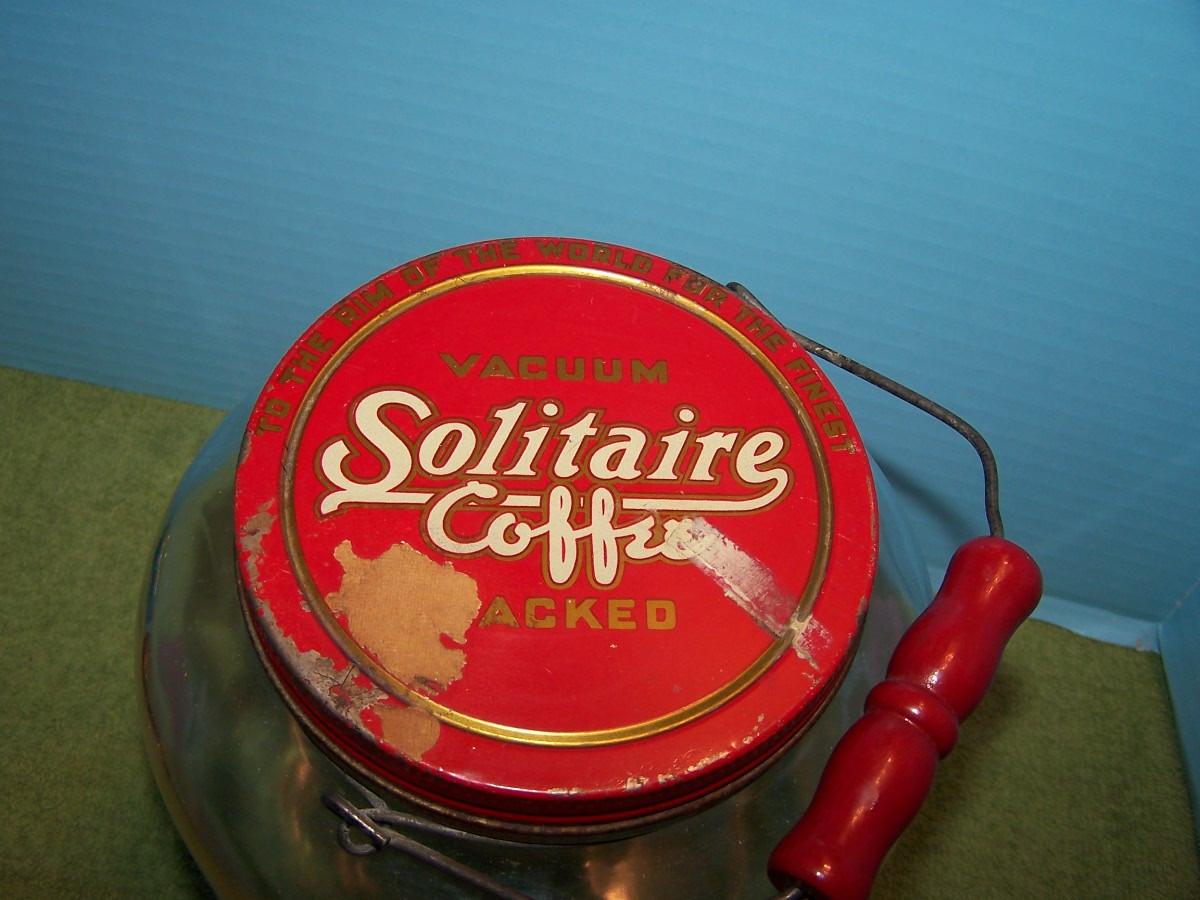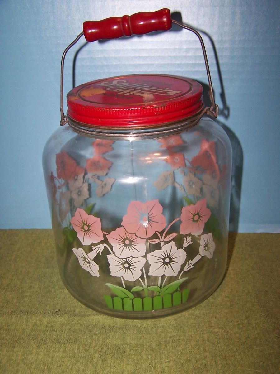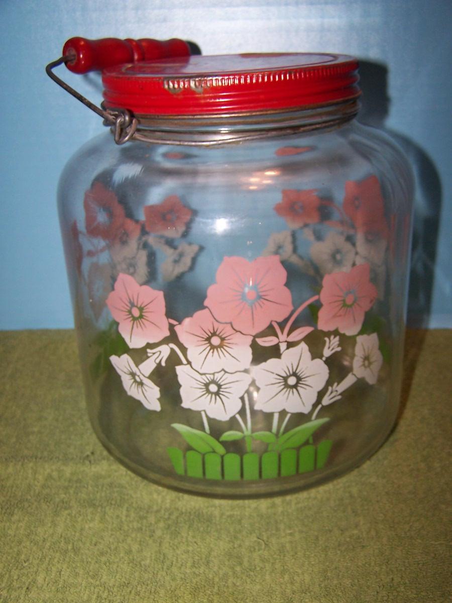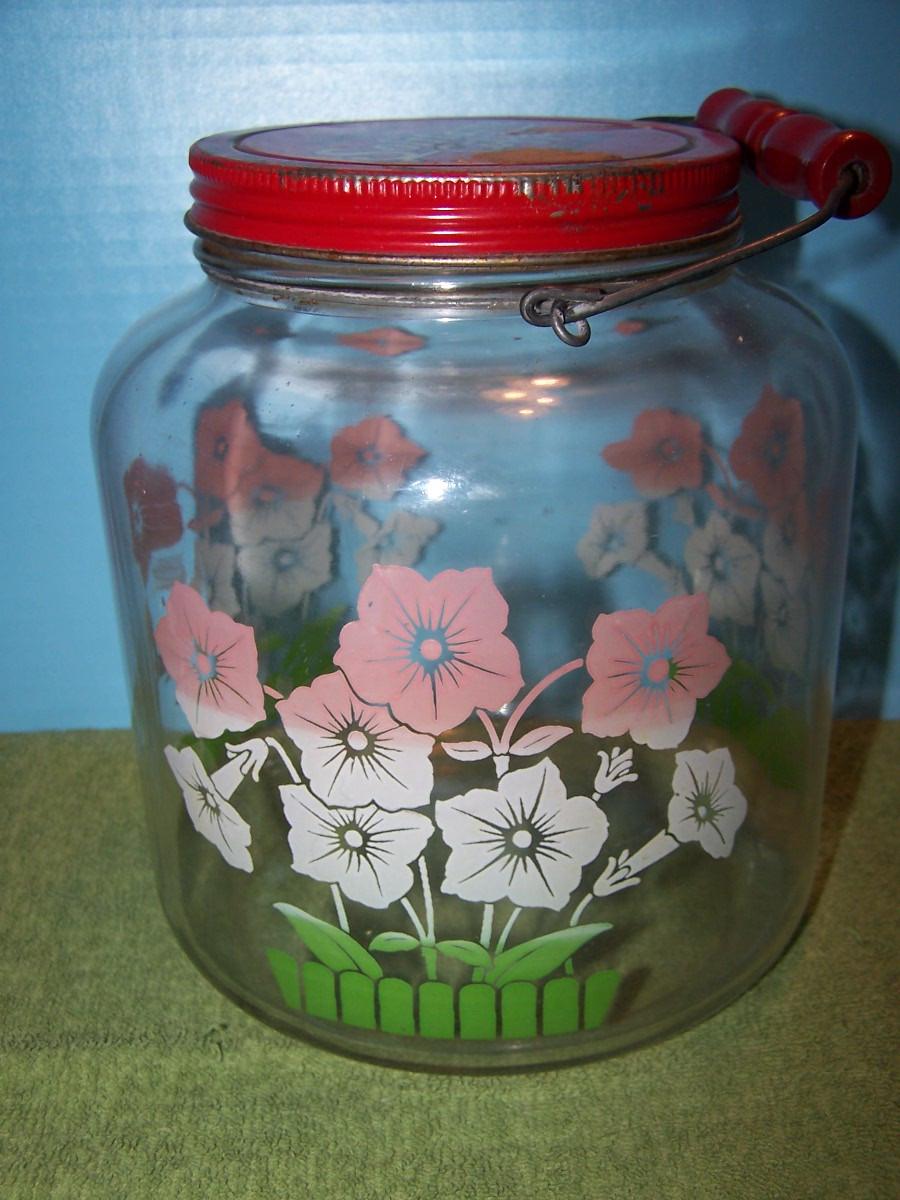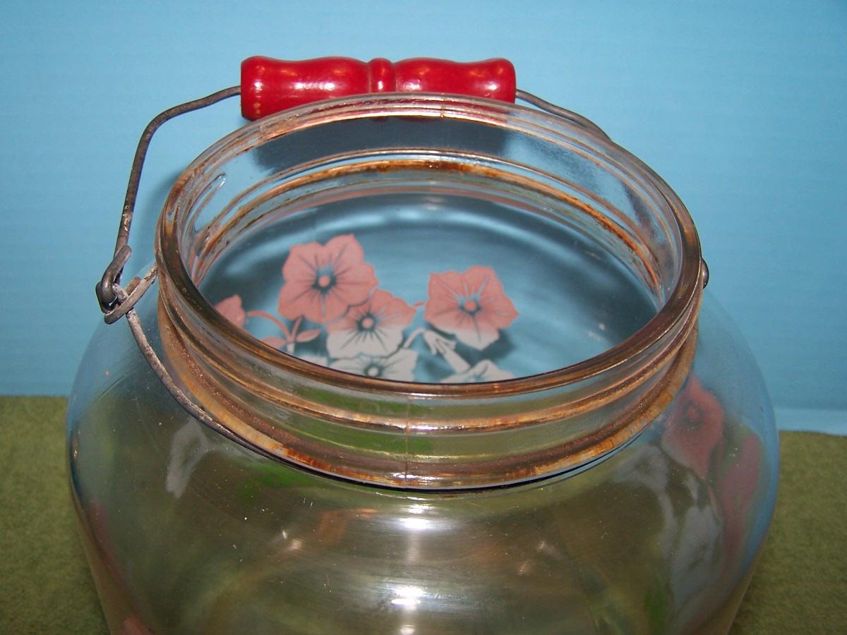 THIS IS A SUPER VINTAGE SOLITAIRE JAR WITH HANDLE!!! IT IS 10 1/4' TALL, WITH HANDLE... UNUSUAL JAR WITH THE FLOWER DECORATION... THE LID HAS SEVERAL PAINT DRIPS, SOME WEAR AND SOME PAINT LOSS, OTHERWISE, GREAT CONDITION...