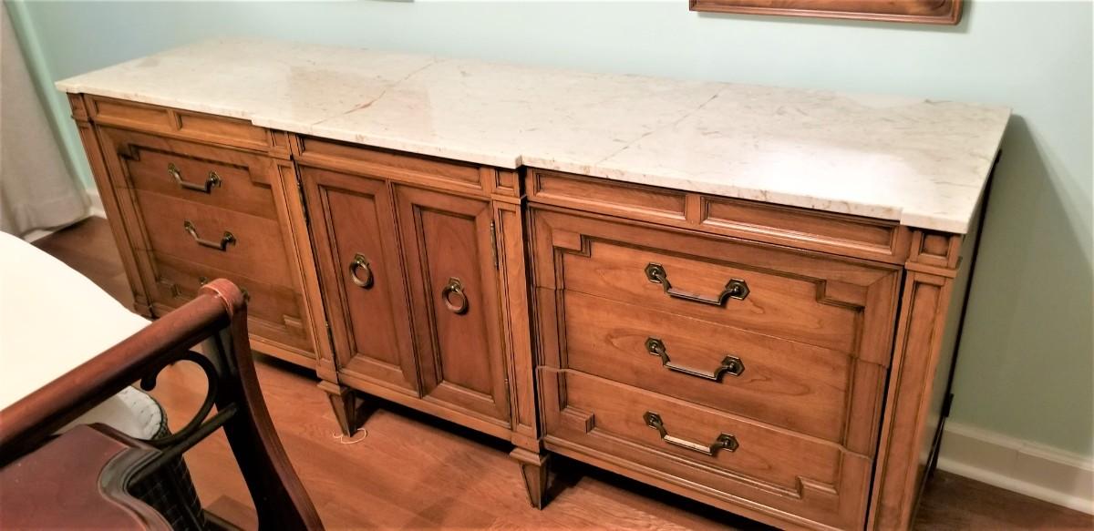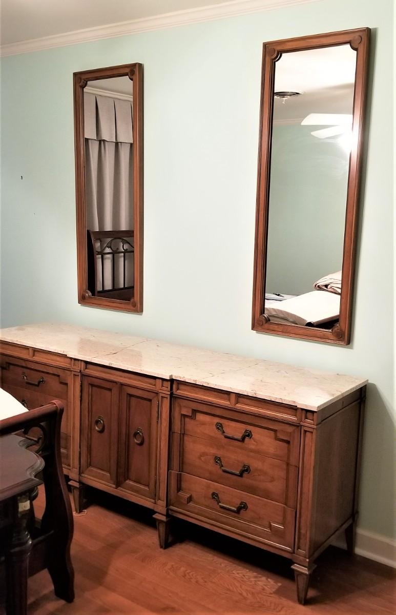 Solid wood, midcentury modern Thomasville bedroom dresser with lots of storage and two matching mirrors. Dresser is 78" across and 20" deep, 32" tall. Mirrors are each 19.25" wide and 51" tall. The cabinet and mirrors are in good condition, but there appears to be 2 cracks in the marble top on the dresser, with an old repair. Please check the photos. Piece is being sold "as is."