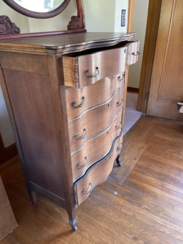 Lot 90. Vintage bow-front highboy, walnut, on wooden casters, 5 drawers, married to a swivel mahogany mirror, all original--$95