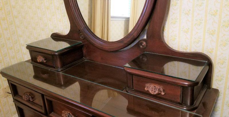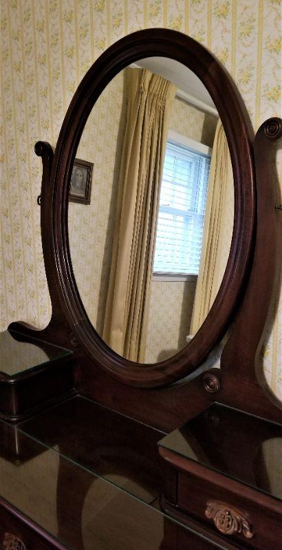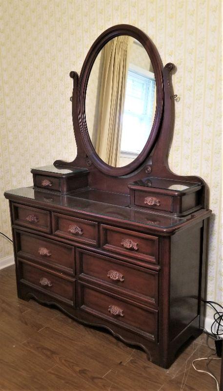Vintage "Dixie" Furniture Company Dresser done in the antique style. Swivel mirror, antique style pulls - 7 drawers. Tempered glass pieces protect the top. 56" across, 18" deep, 75" tall. Solid piece of furniture - vintage condition.