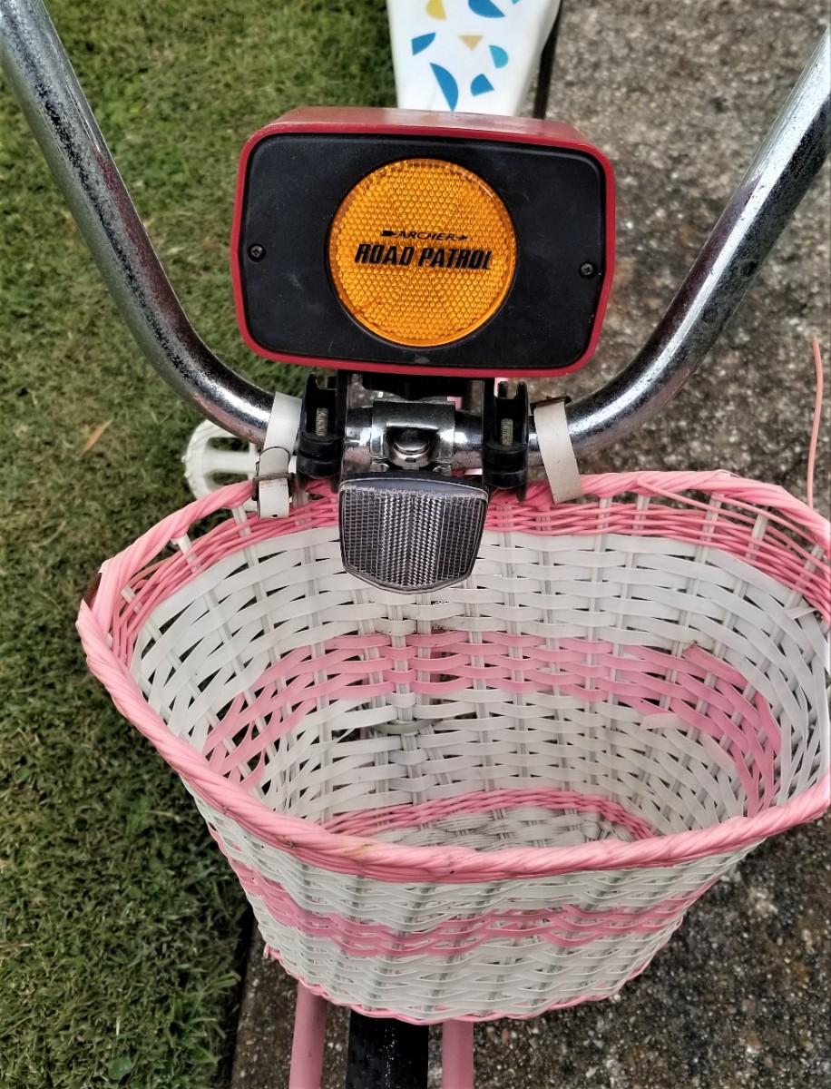 Vintage Lady Schwinn Pink bike - banana seat, vinyl basket, ring bell, Anchor Road Radio (! - needs batteries). Garage kept, but in vintage condition. 56" long, 27.5" tall at the seat. Pedals turn smoothly.