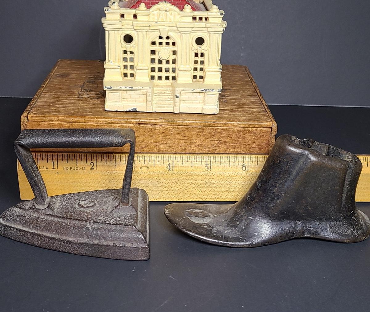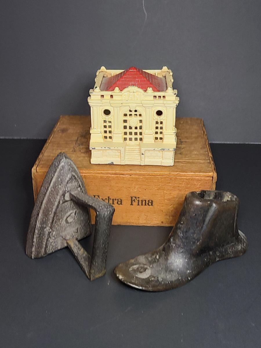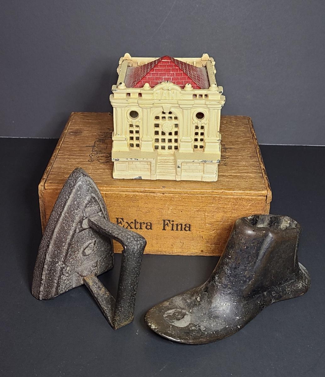 Lot 90: Vintage Metal Bank, Cast Iron/Shoe, and Wood Cigar Box.