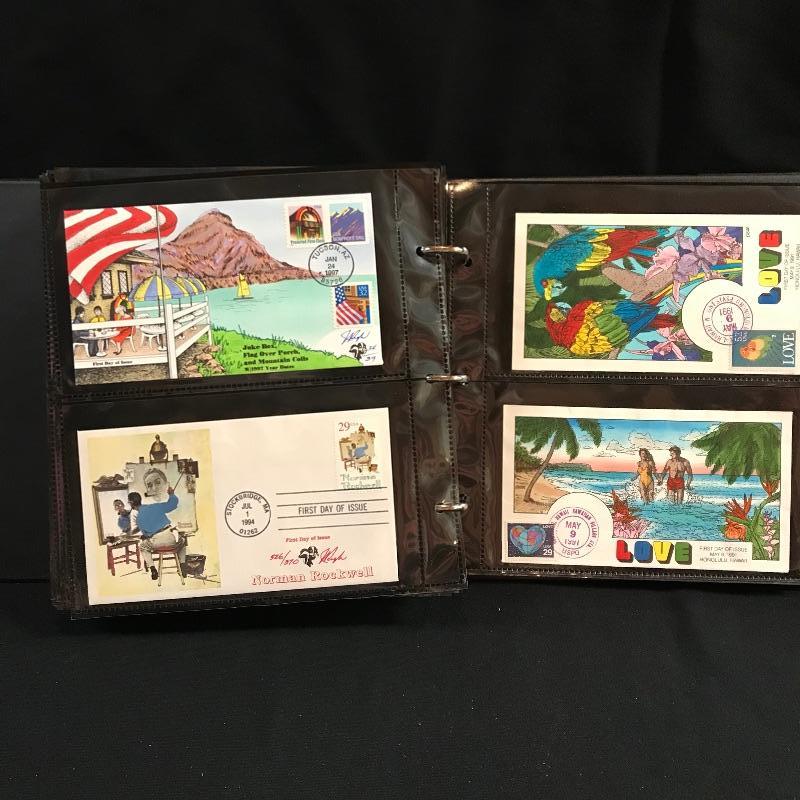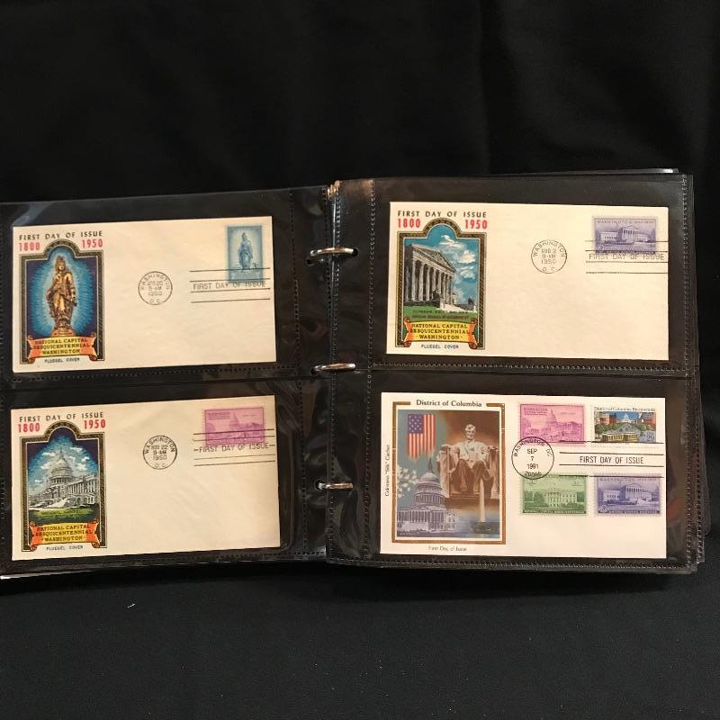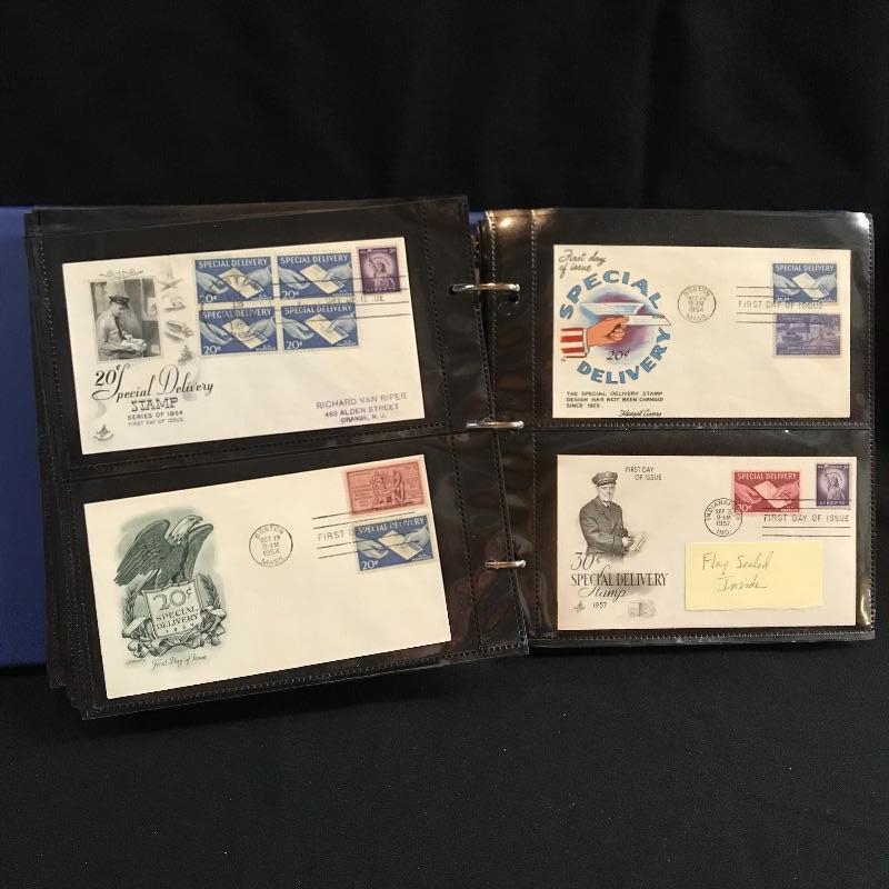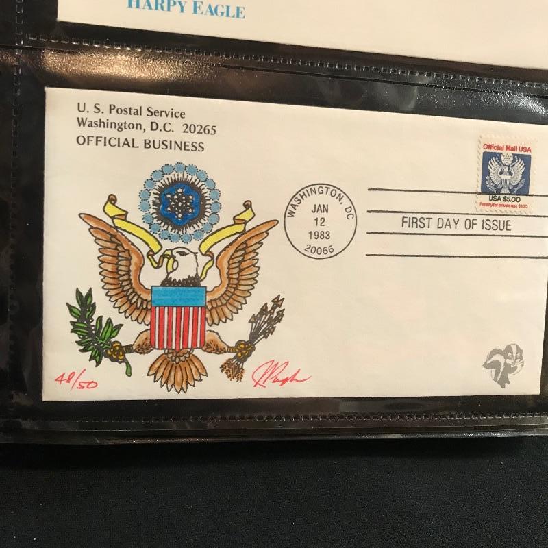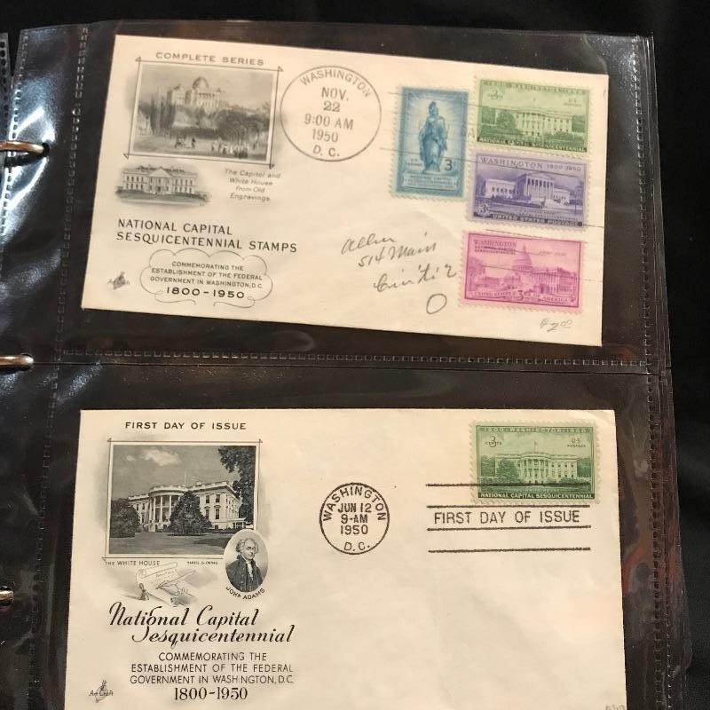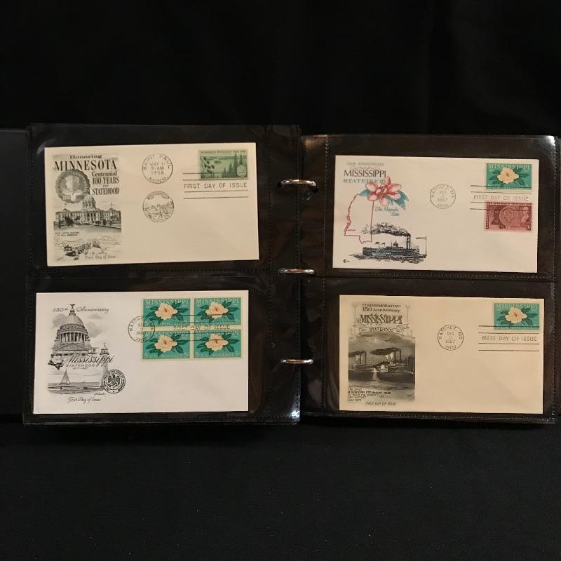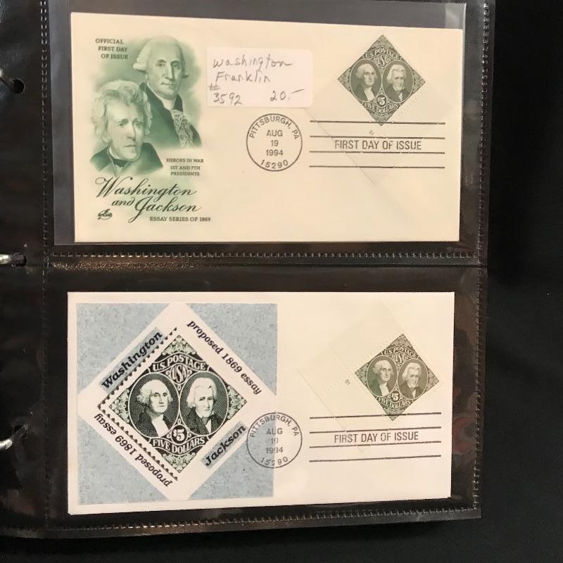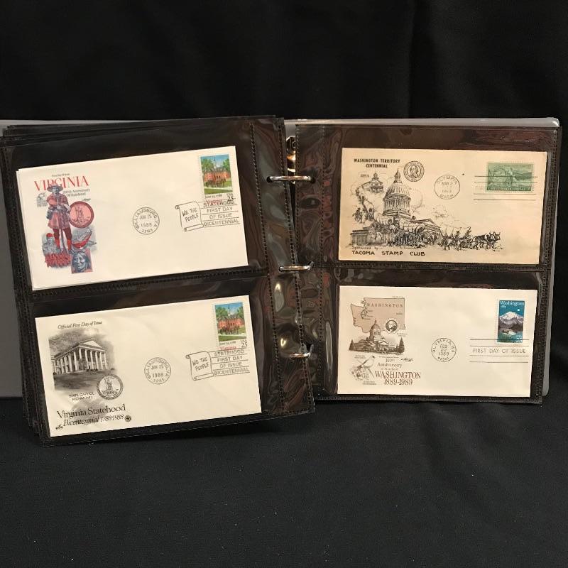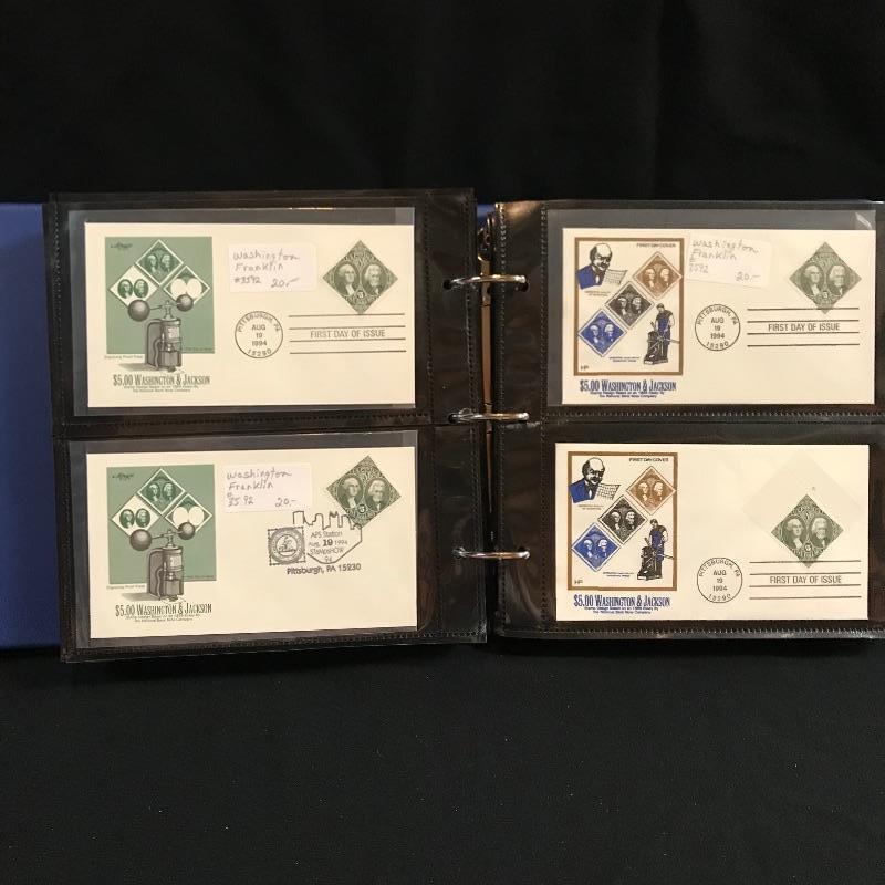 Wow. There’s a lot here. Ten $5 Washington Franklins, a plethora of historical 1st day covers dating back to mid 1900s. Quite a few of first day covers appear to be numbered and signed. You’ll find some in the mix with extra care taken to wrap in paper before being placed in SuperSafe sleeves. Genres include aviation, US history, Olympics, famous Americans, wildlife, statehood and so much more! Three mostly full binders plus a couple special loose 1st Day Covers. Lots of valuable and sentimental pieces here.