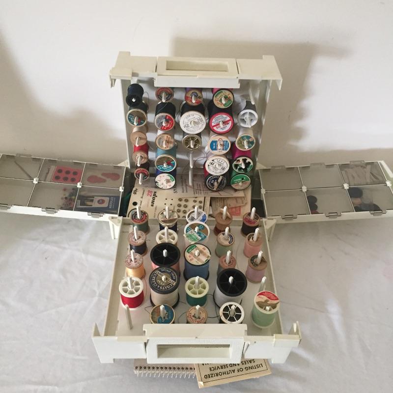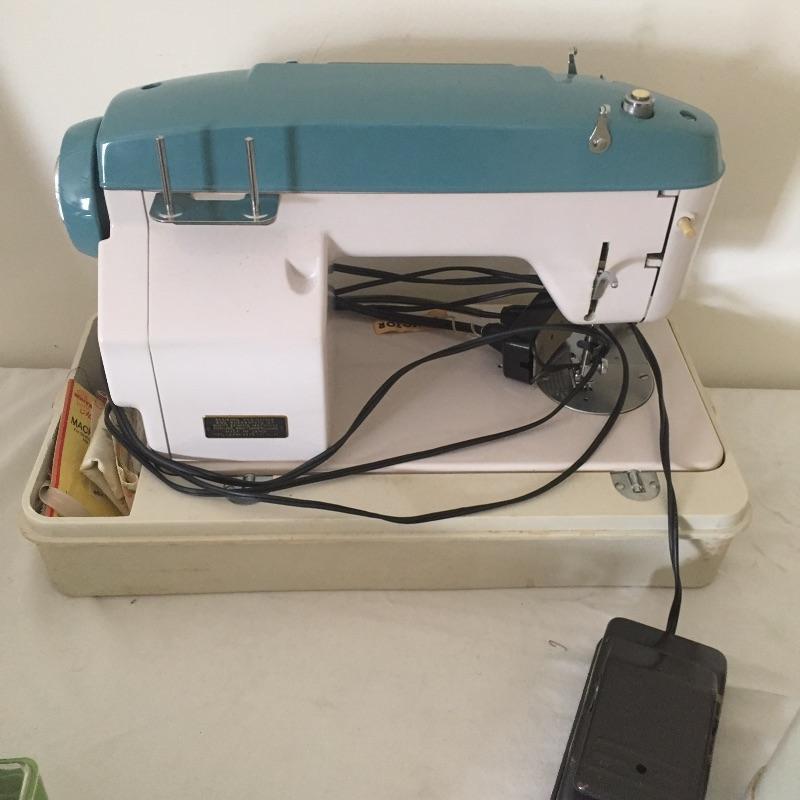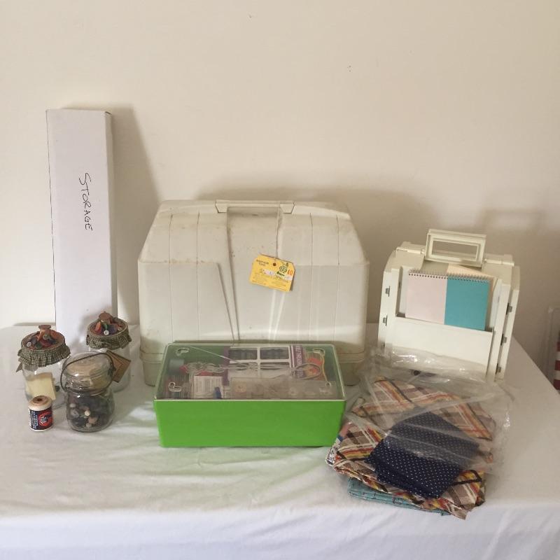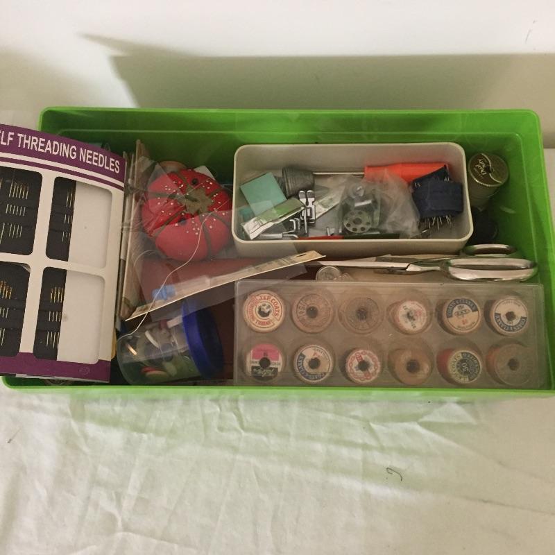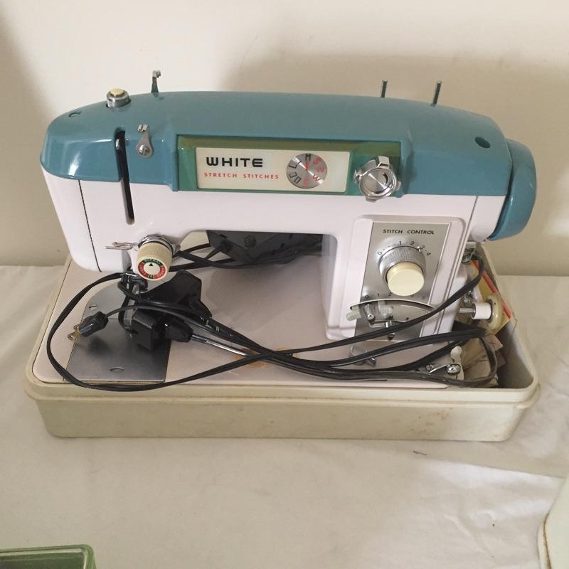 White brand sewing machine with case. Includes expandable carry case for your thread and other essentials. There is also a box with more essentials , fabric and a trio of storage jars.