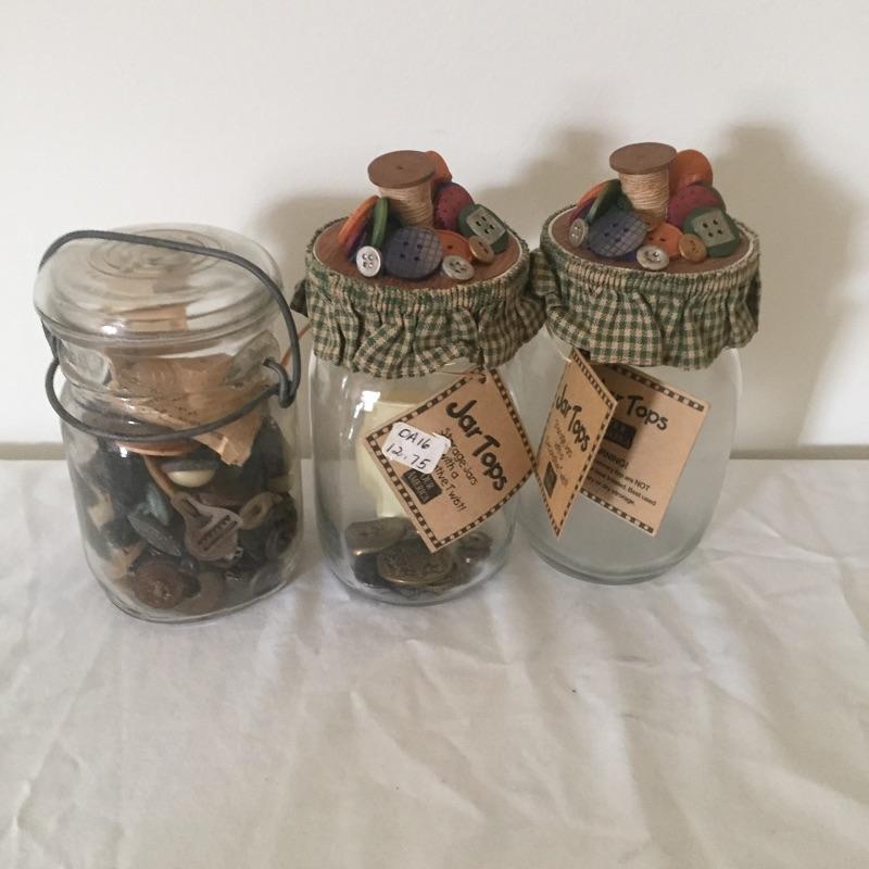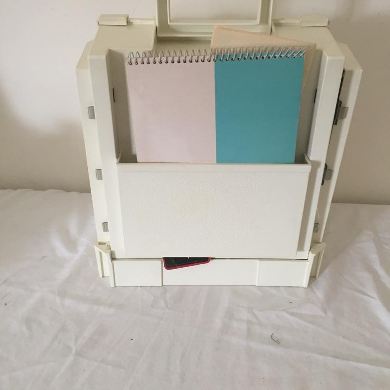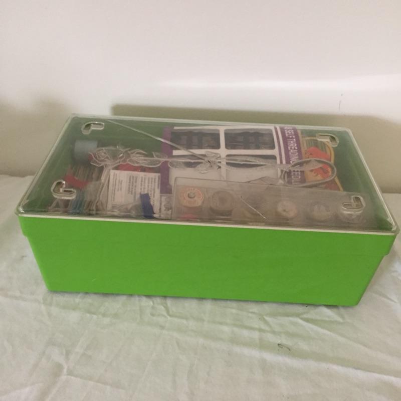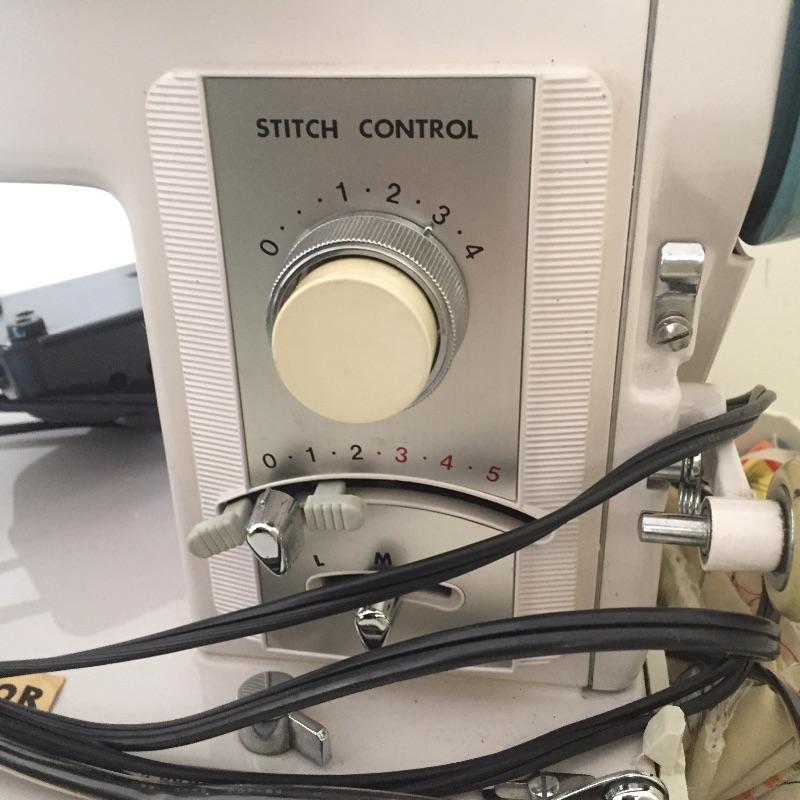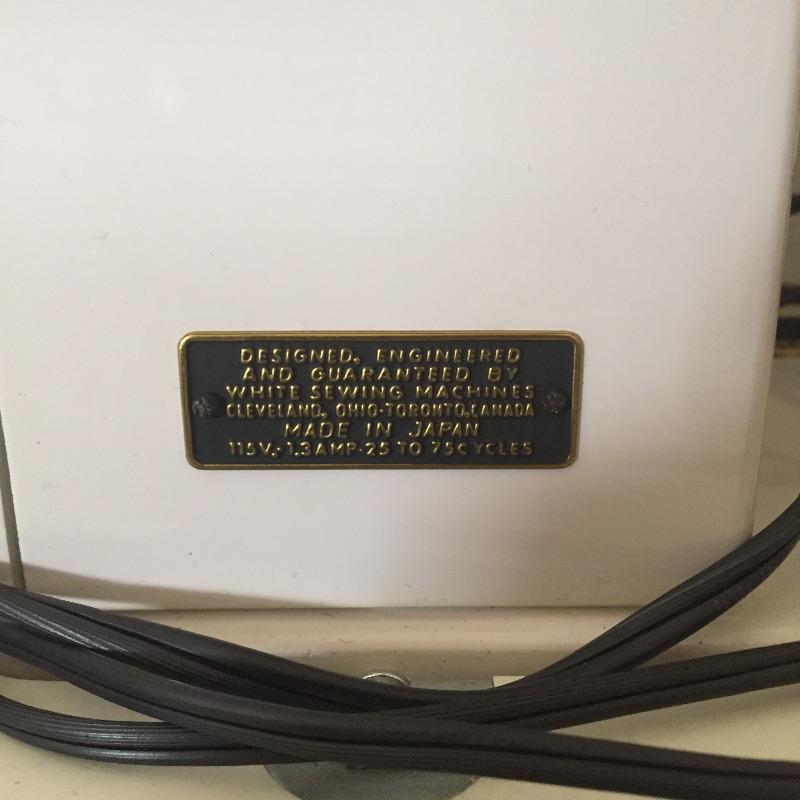 White brand sewing machine with case. Includes expandable carry case for your thread and other essentials. There is also a box with more essentials , fabric and a trio of storage jars.