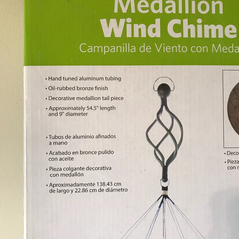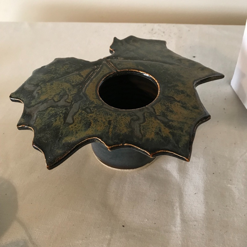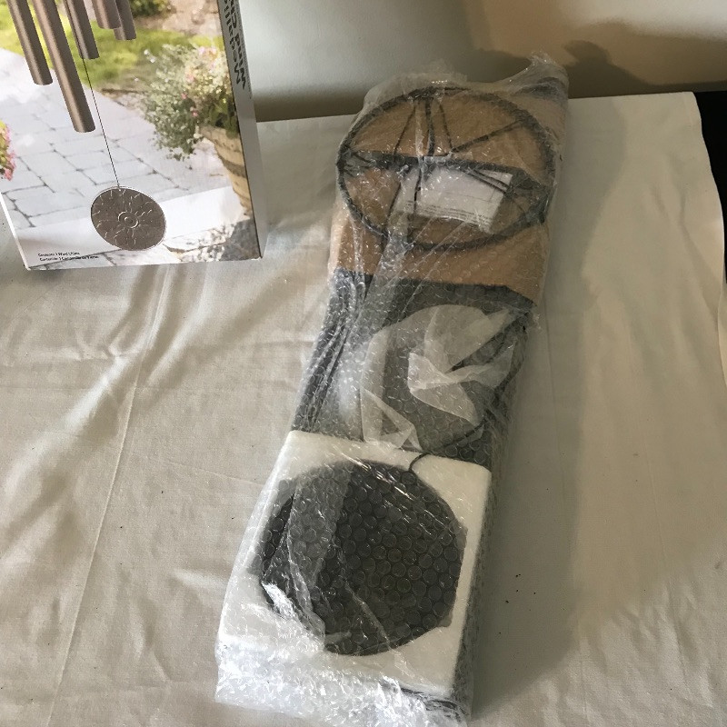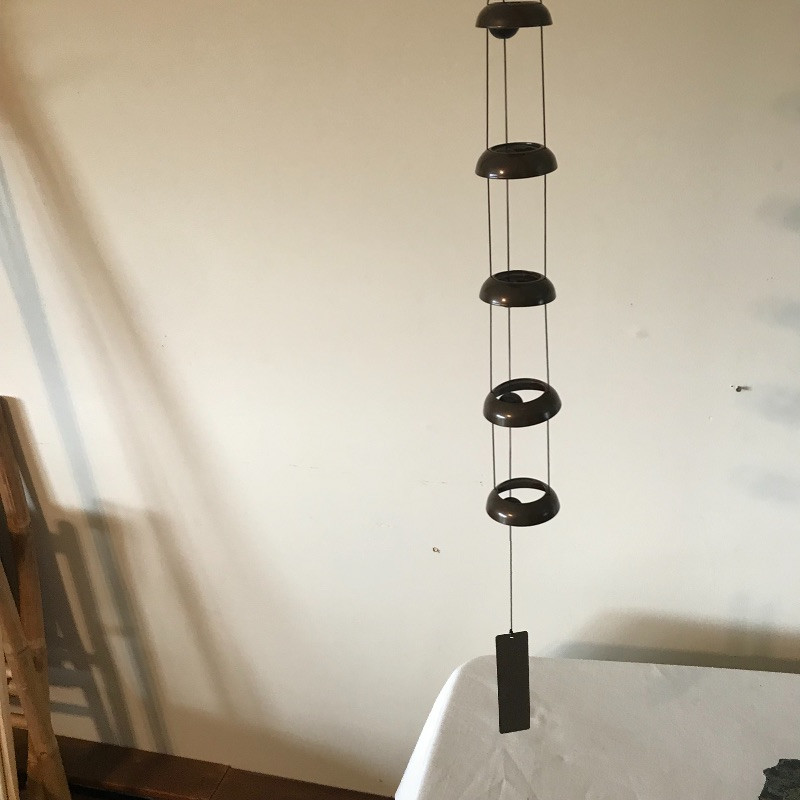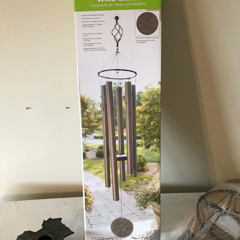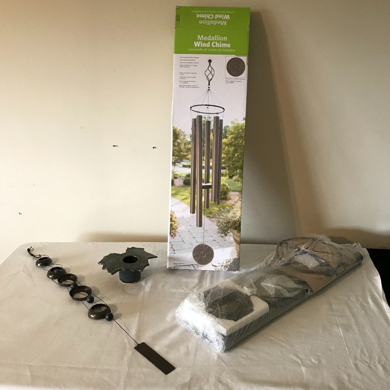 Two wind chimes with one still new in box. Both are metal with a bronze color to them. The largest hangs 54.5”. The leaf planter is made of clay and is signed and stands 3” tall. Local pick up only.