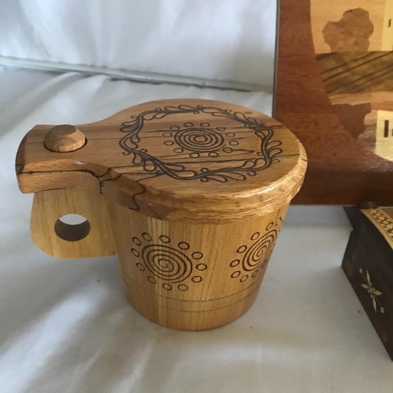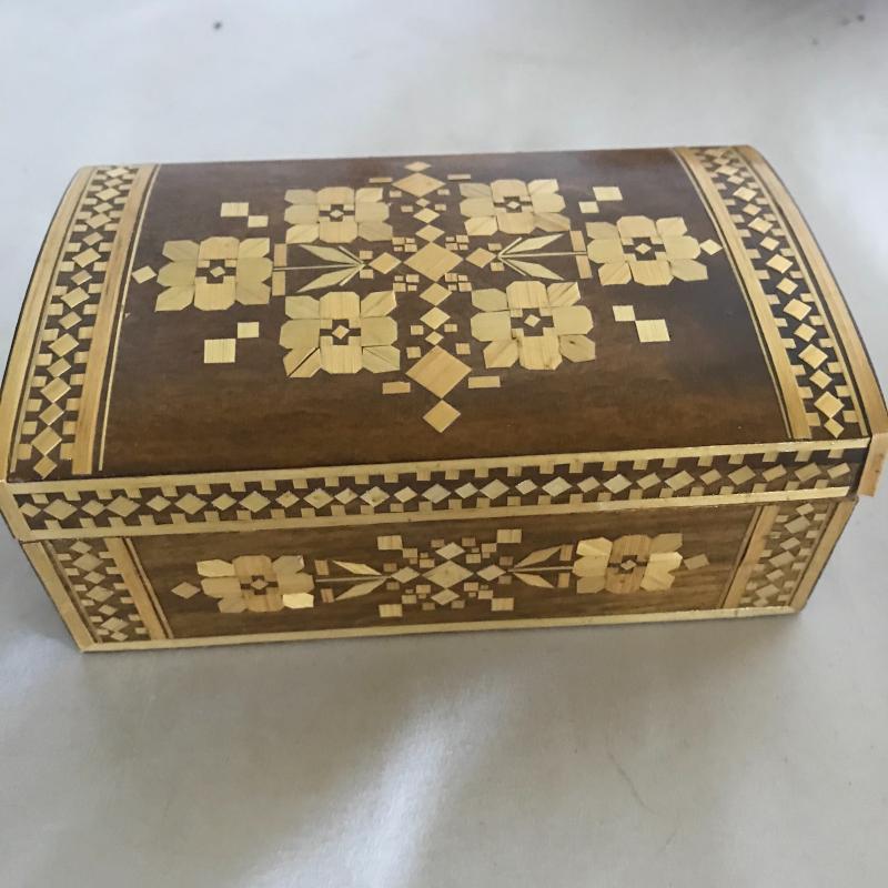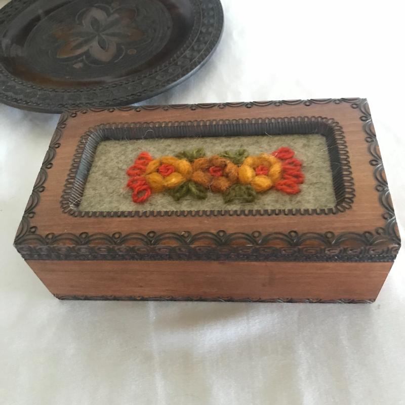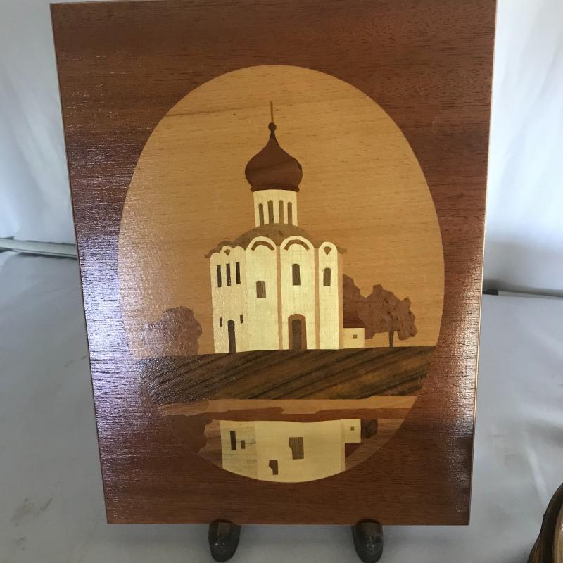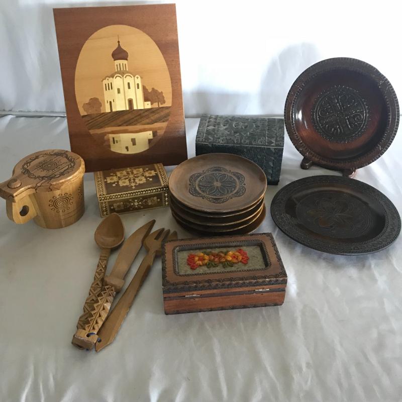 Strong Russian influence makes up this collection including wood inlay art piece measuring 12” x 9”. Three wood boxes. One has key, another has needle point top and last one has inlay work. Small five plate collection with each measuring 6.5”. Shipping available.