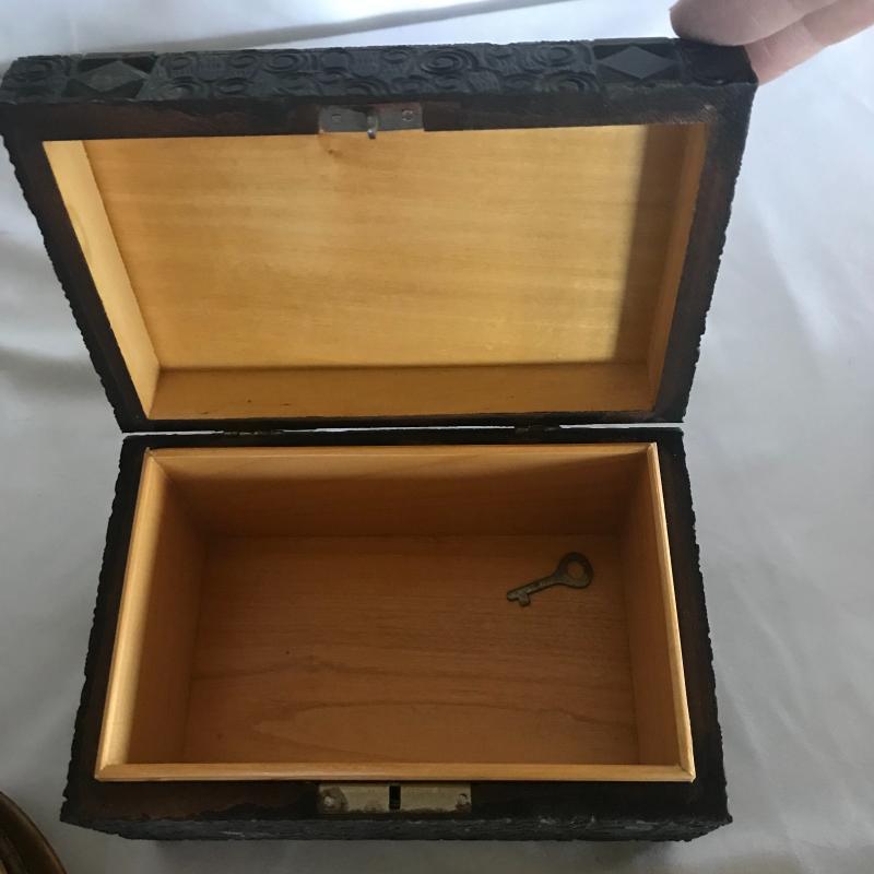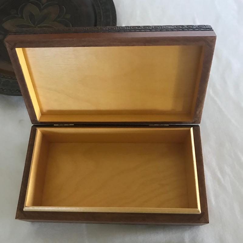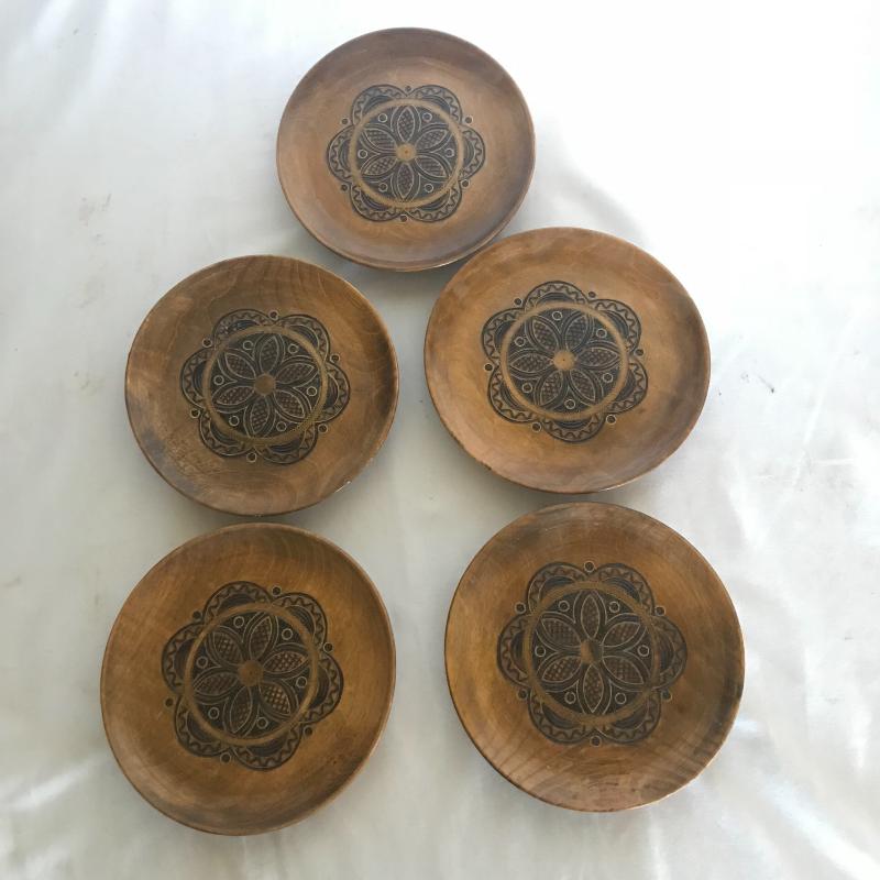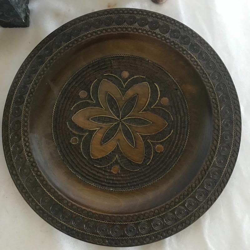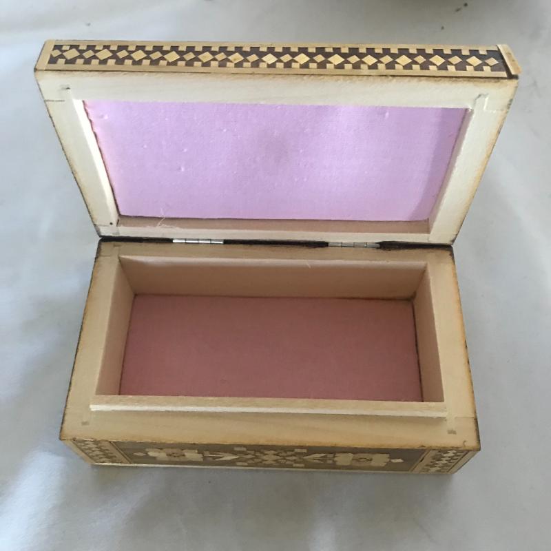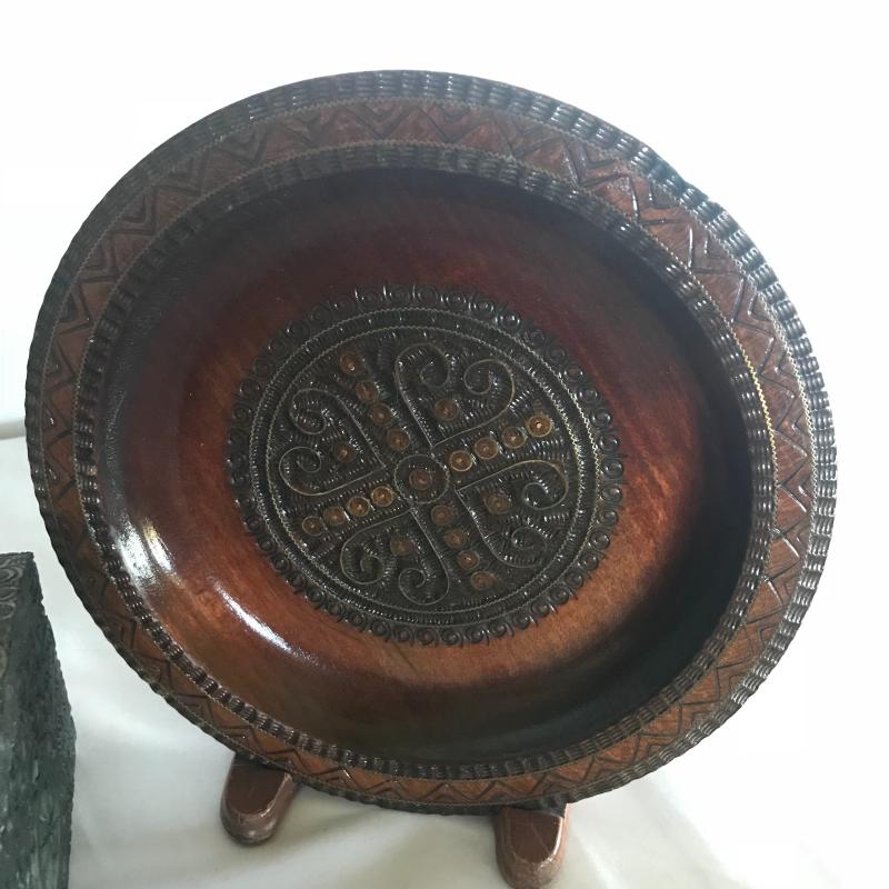 Strong Russian influence makes up this collection including wood inlay art piece measuring 12” x 9”. Three wood boxes. One has key, another has needle point top and last one has inlay work. Small five plate collection with each measuring 6.5”. Shipping available.
