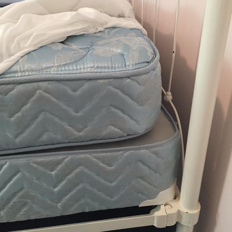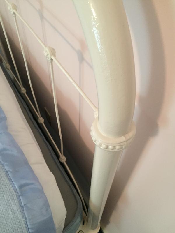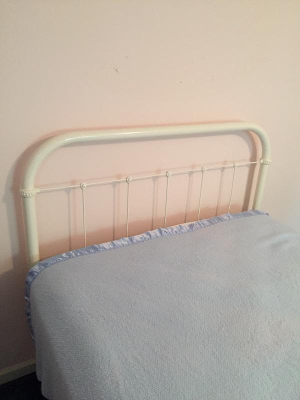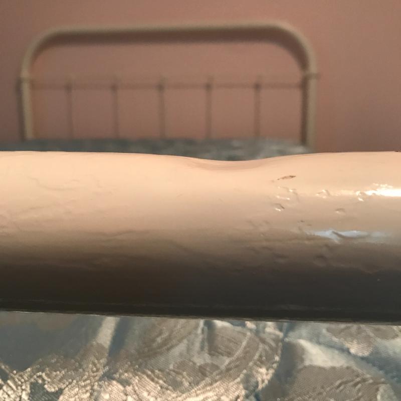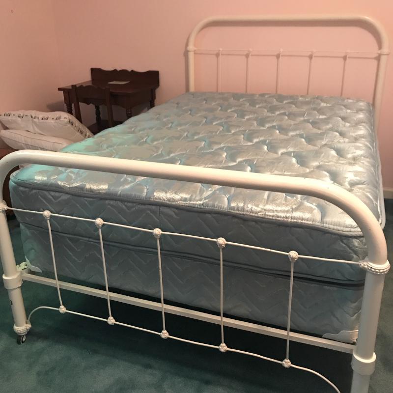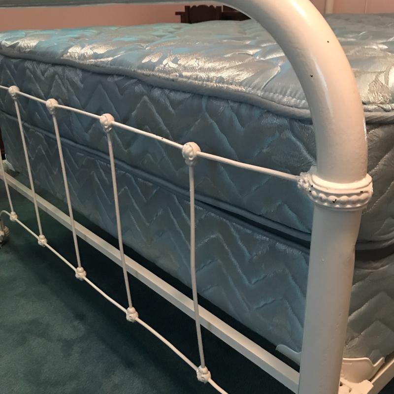 Painted Wrought Iron Full Size Bed has some chips on paint that a fresh coat could fix. Headboard Measures 49”Tall 54”Wide and Foot Measures 33”Tall 54”Wide. Small dent in footboard. Full Mattress and Box Spring are available for free to the buyer if interested. Local Pickup Only. Bring tools to dismantle and bring help to take down a flight of stairs.