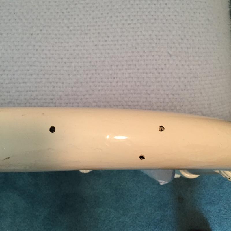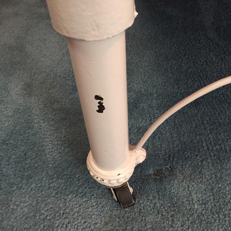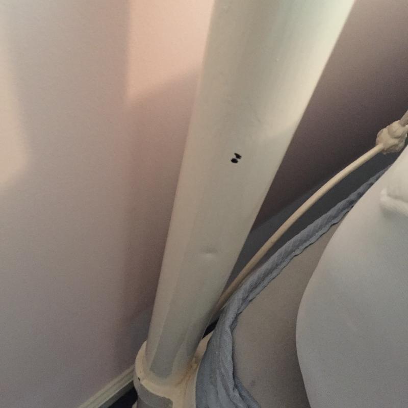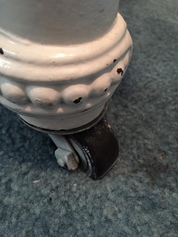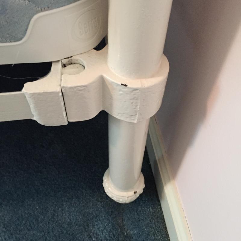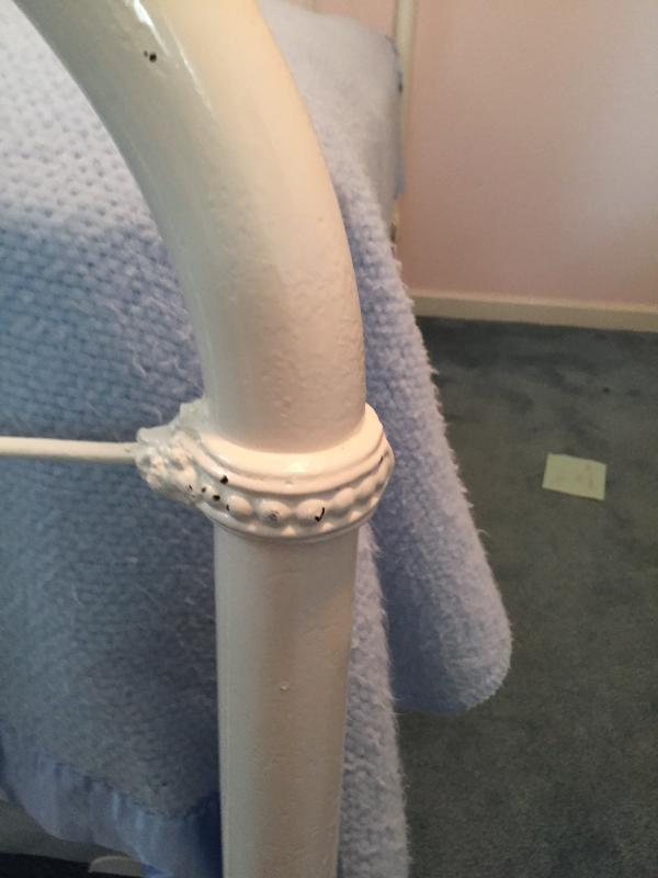 Painted Wrought Iron Full Size Bed has some chips on paint that a fresh coat could fix. Headboard Measures 49”Tall 54”Wide and Foot Measures 33”Tall 54”Wide. Small dent in footboard. Full Mattress and Box Spring are available for free to the buyer if interested. Local Pickup Only. Bring tools to dismantle and bring help to take down a flight of stairs.