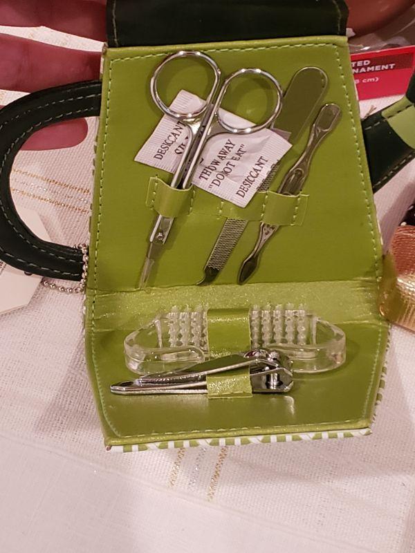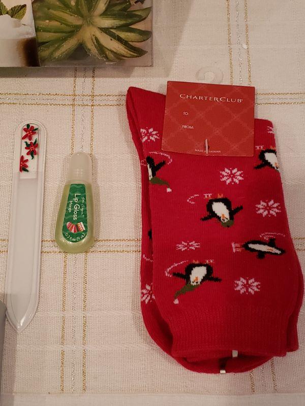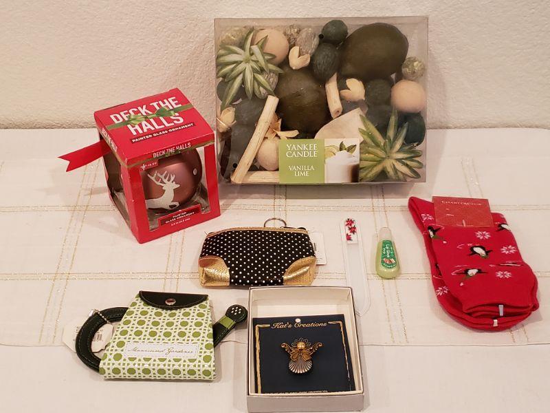 Lot 900: NEW Ornament, Manicure Set, Angel Brooch, Holiday Socks, Lip Gloss, Coin Purse and Yankee Candle Potpourri