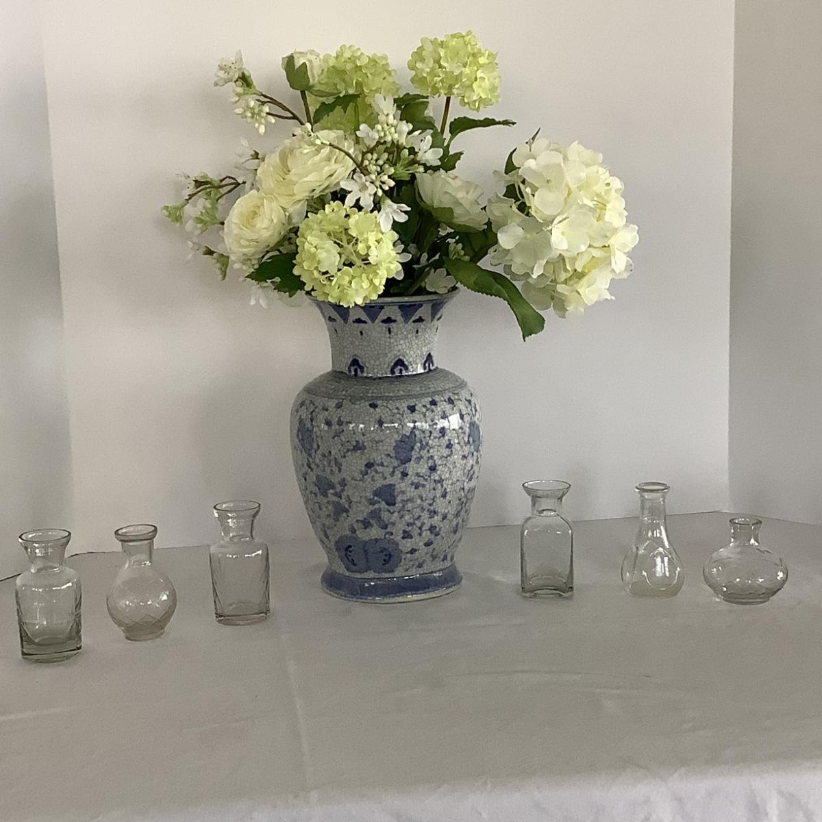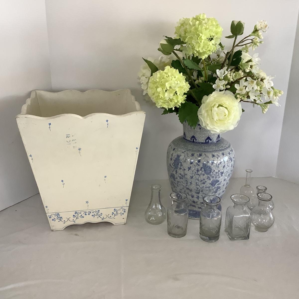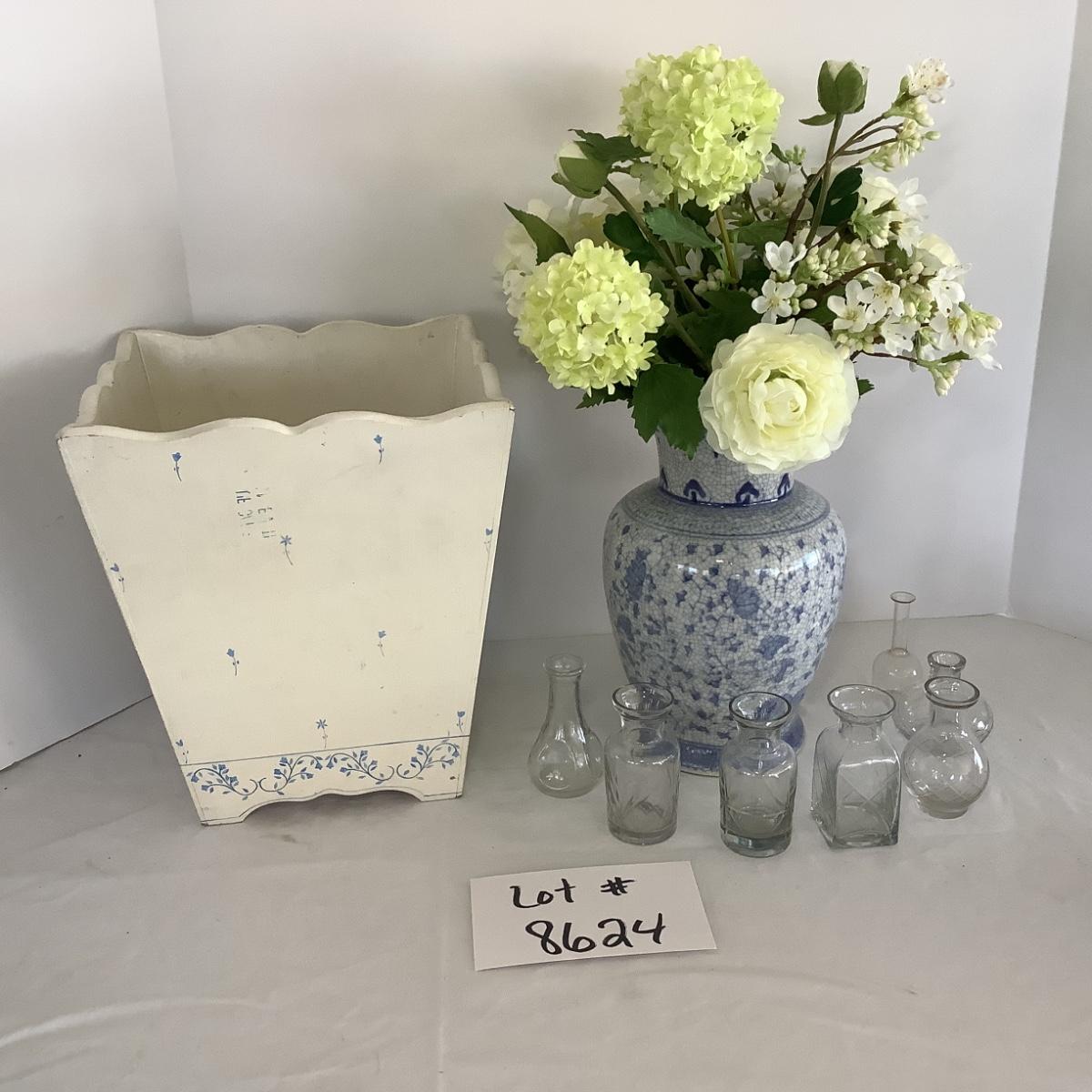 Lot 9004  Faux Floral Arrangement in Blue/White Porcelain Vase, Mini Bud Vases, Blue/White Waste Can