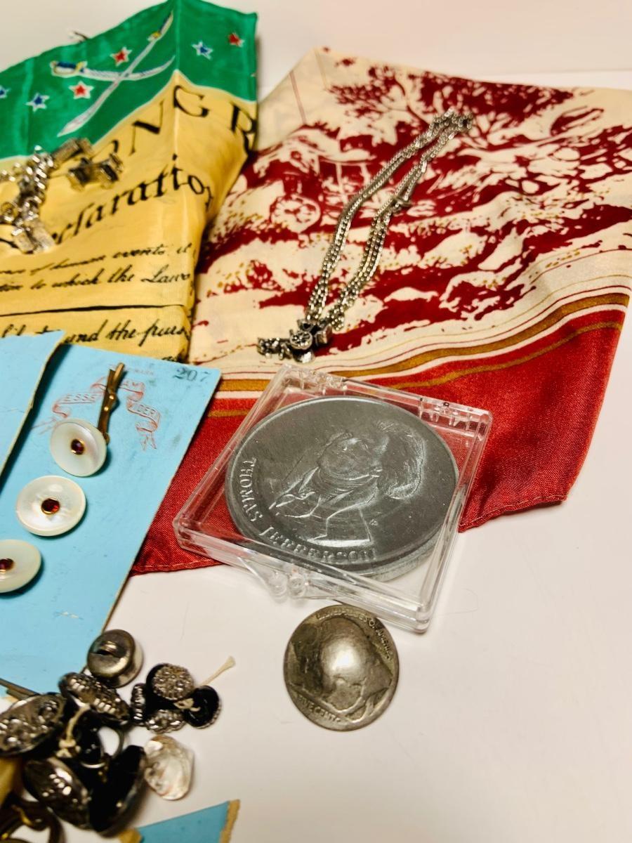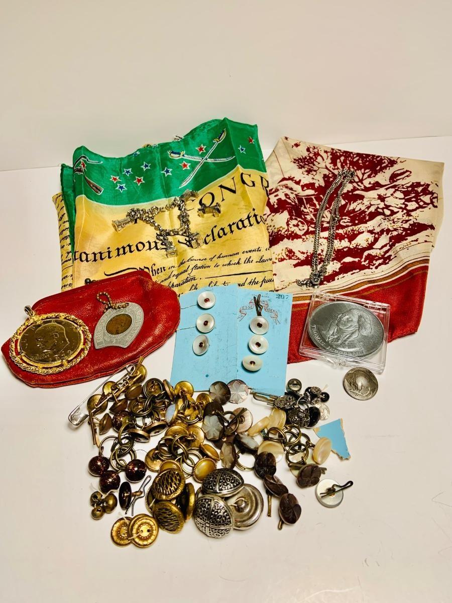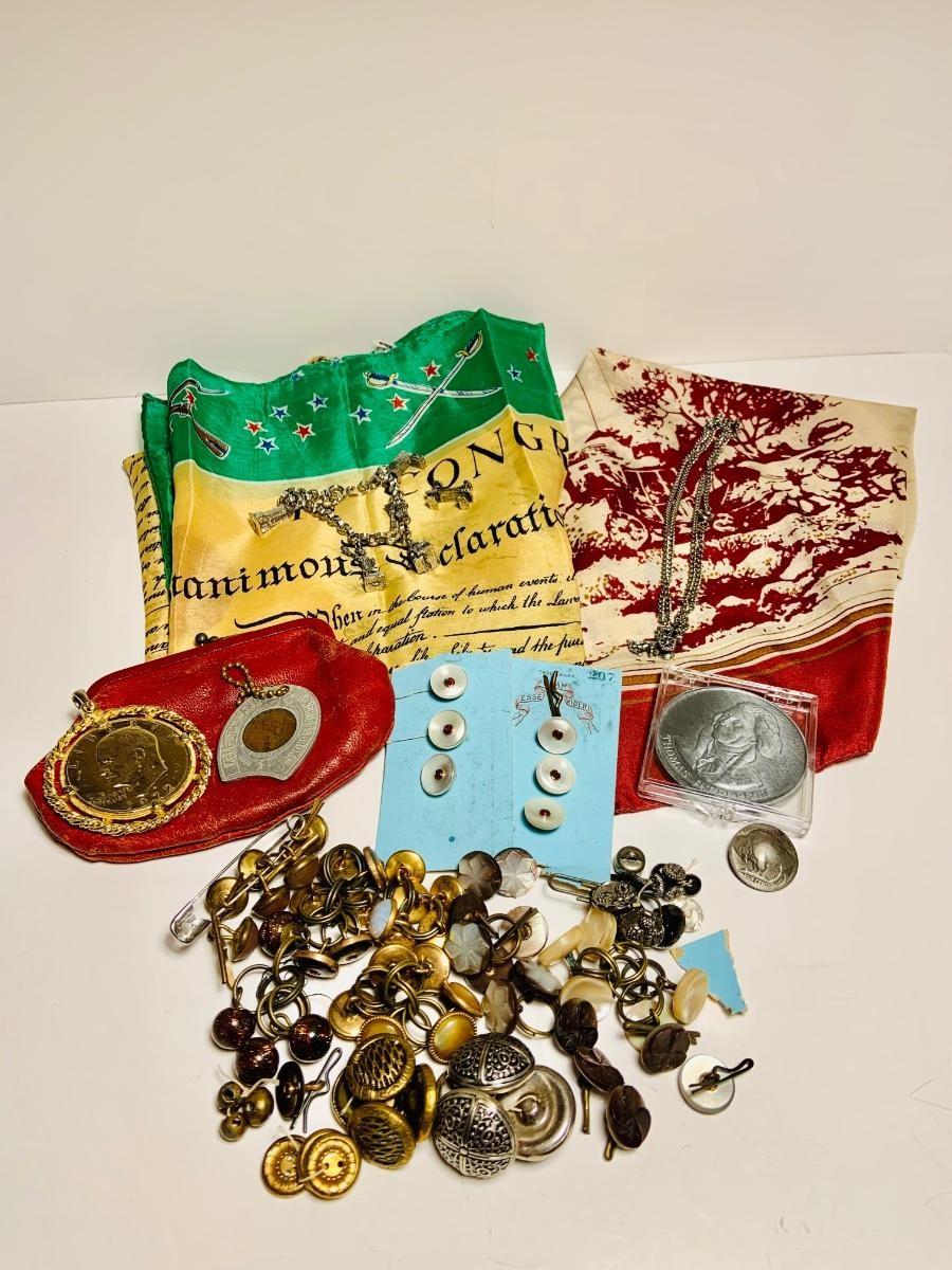 LOT 157: Collection of Vintage Buttons Including a Unique Buffalo Nickel Button: Coin and Coin Jewelry, Change Purse and American Scarves