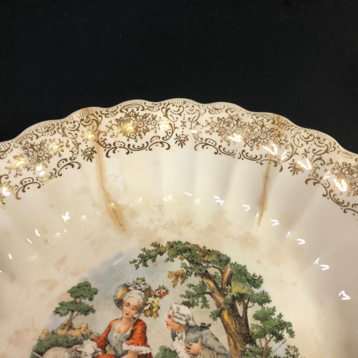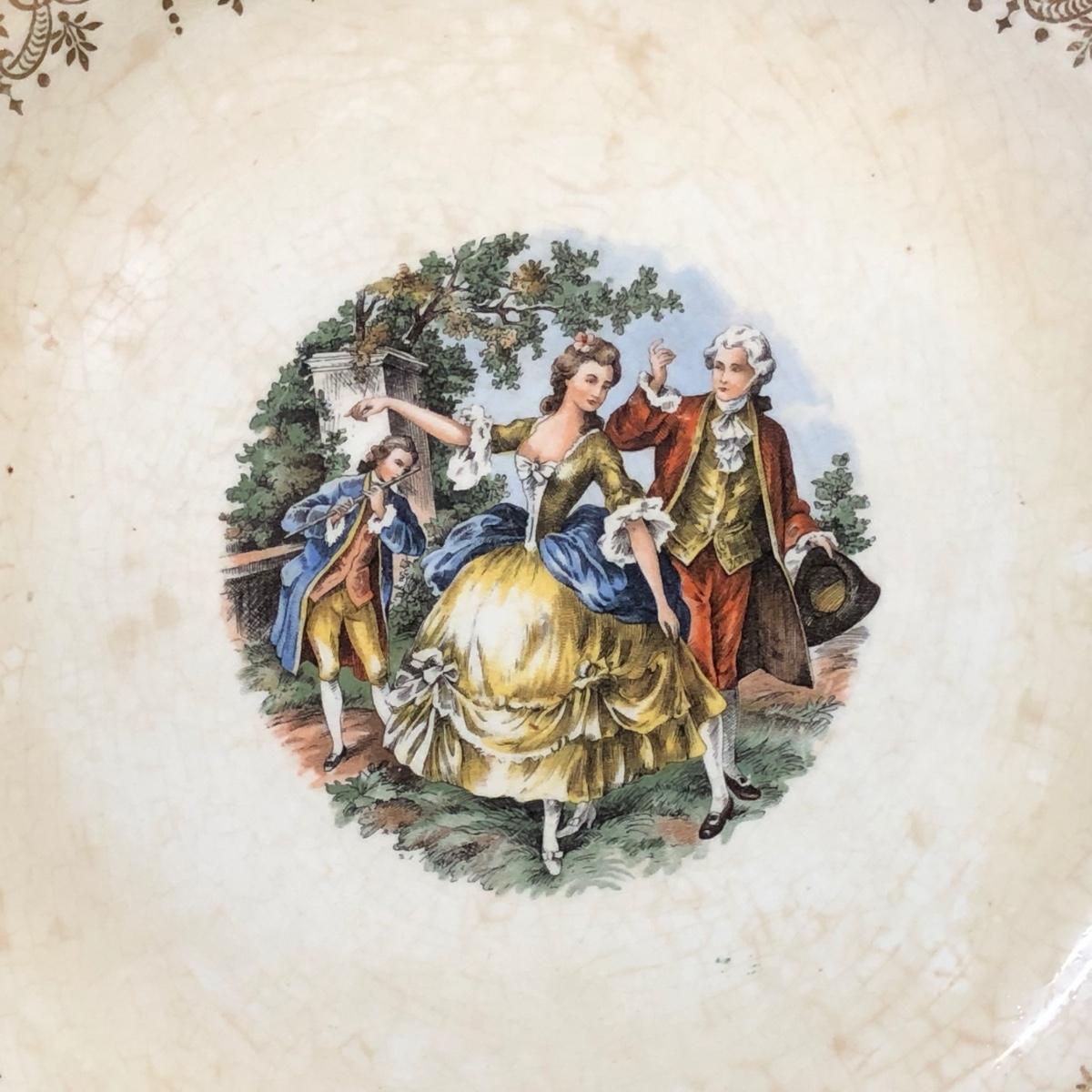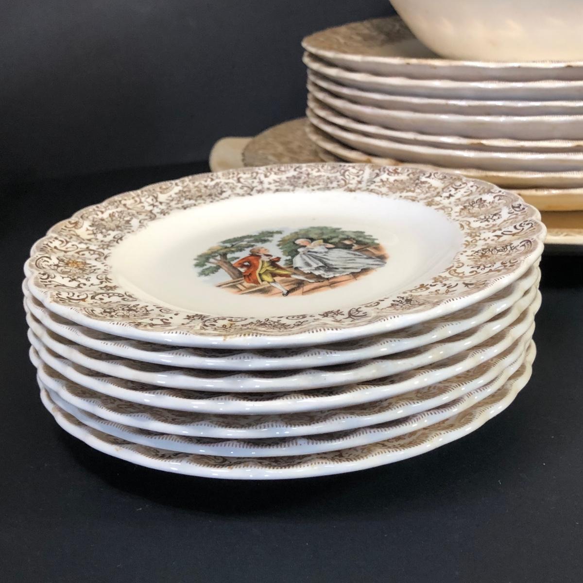 Includes serving platter, medium plates, dessert plates, saucers, tea cups, sugar bowl, creamer, and 2 sizes of serving bowls.
