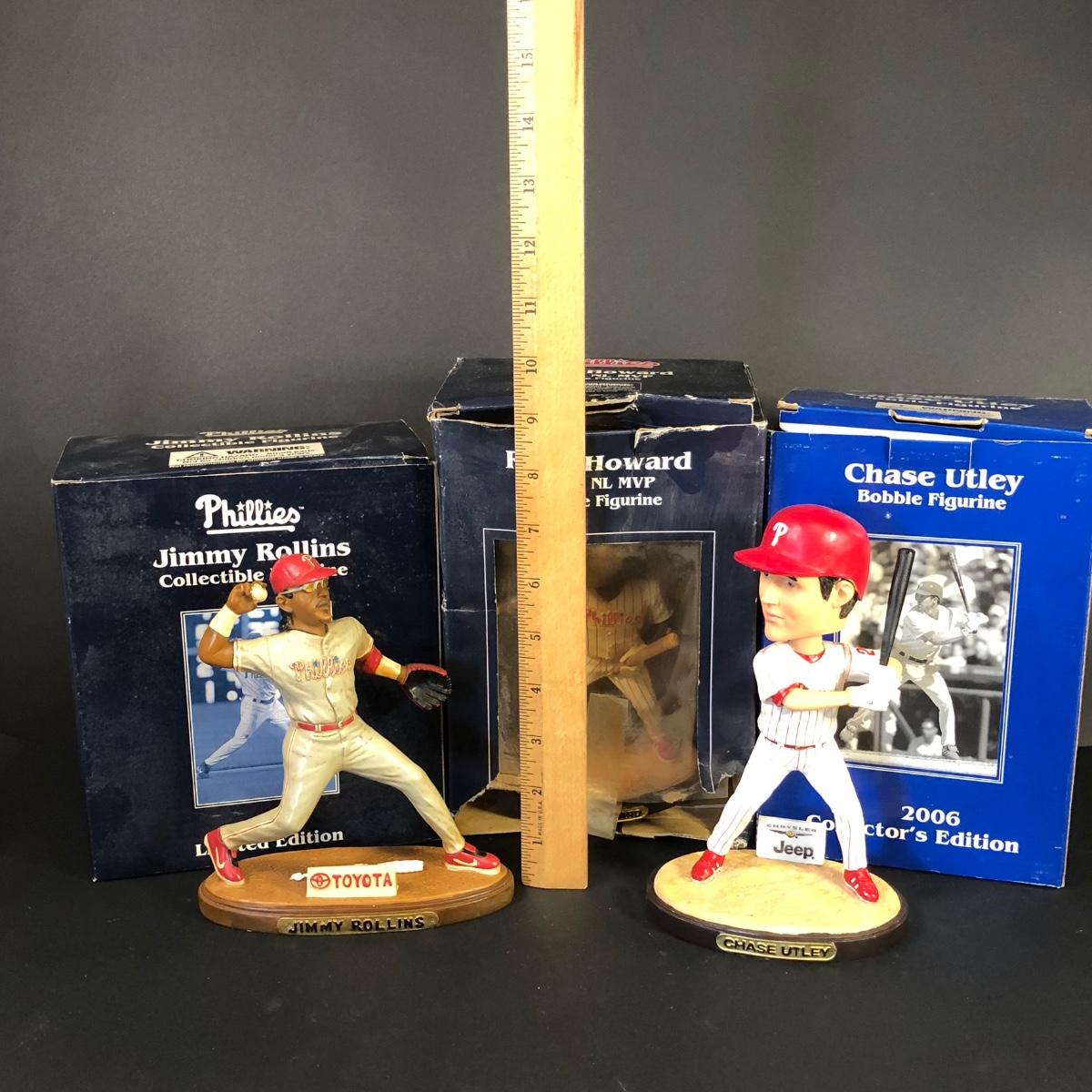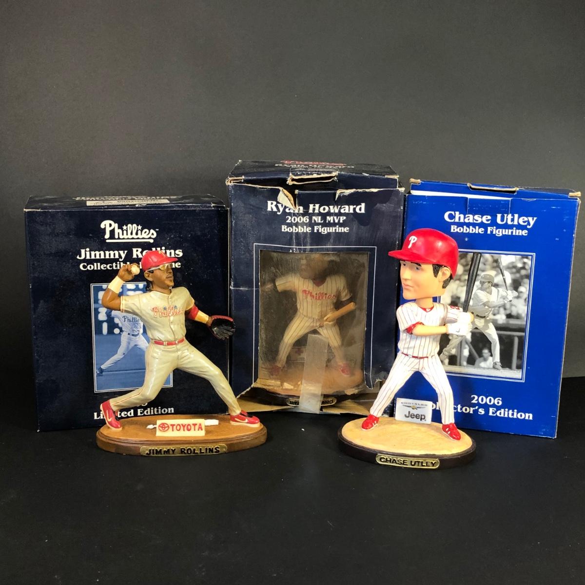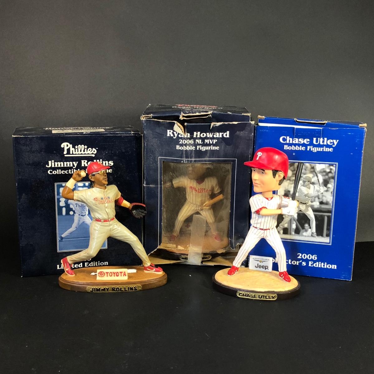 LOT 17M: Phillies Toyota Jimmy Rollins Collectible Figurine (2005), Phillies Jeep Chase Utley Bobble Figurine (2006) & Phillies Toyota Ryan Howard 2006 NL MVP Bobble Figurine (2007)