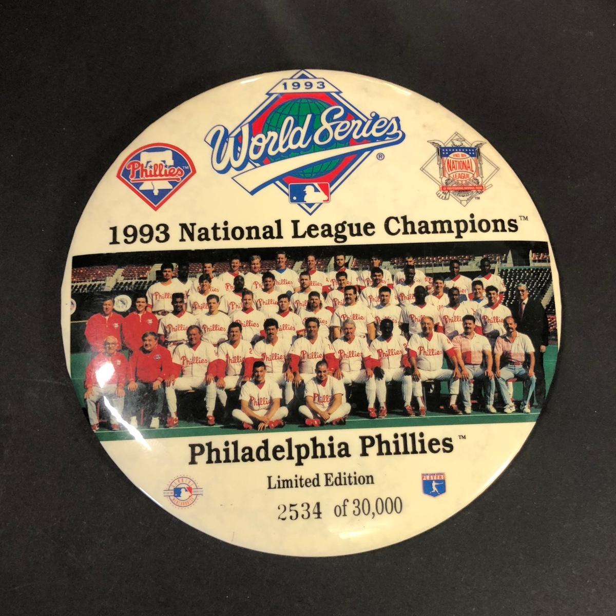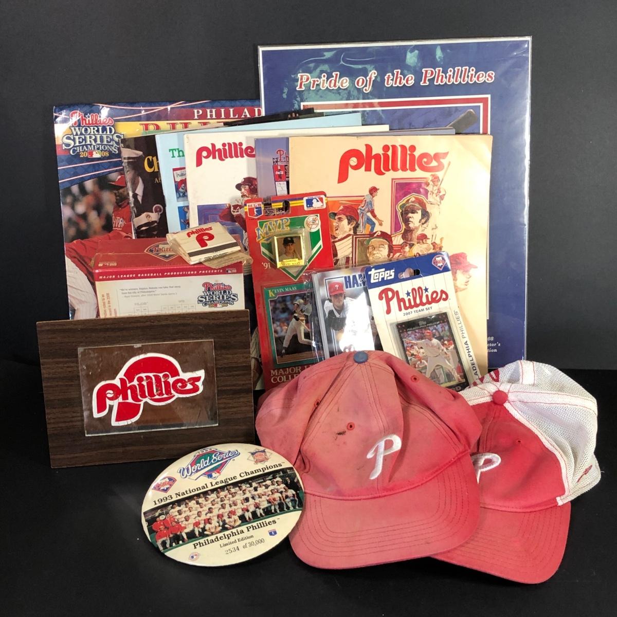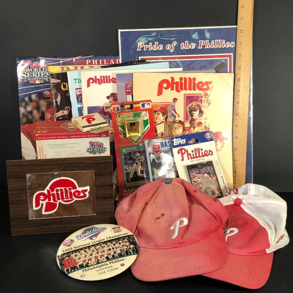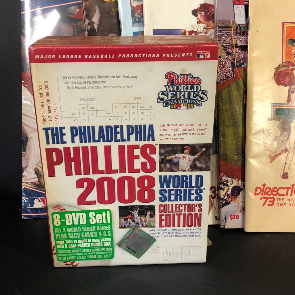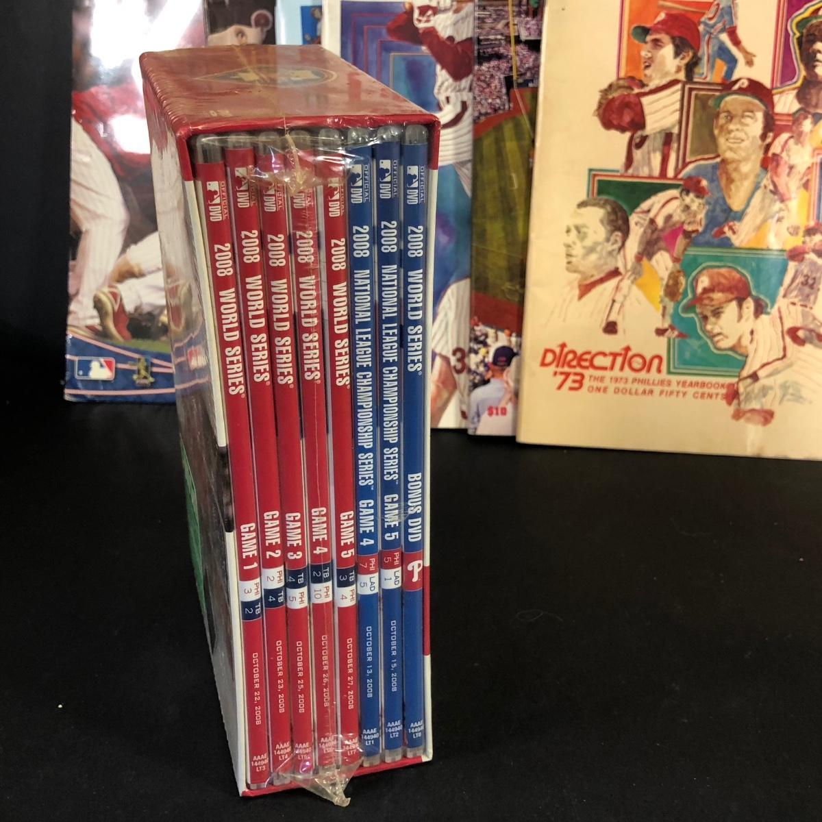LOT 24M: Sealed Phillies 2008 World Series Collector's Edition 8-DVD Set, Phillies Sealed Topps Cards, 1993 National League Button, Programs, Posters, Hats & More