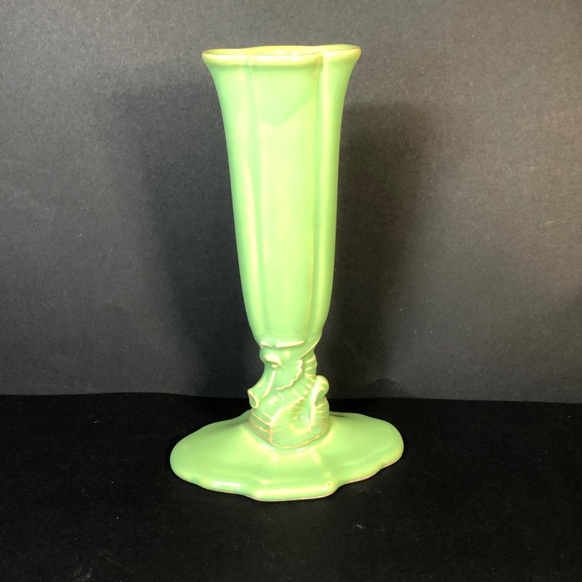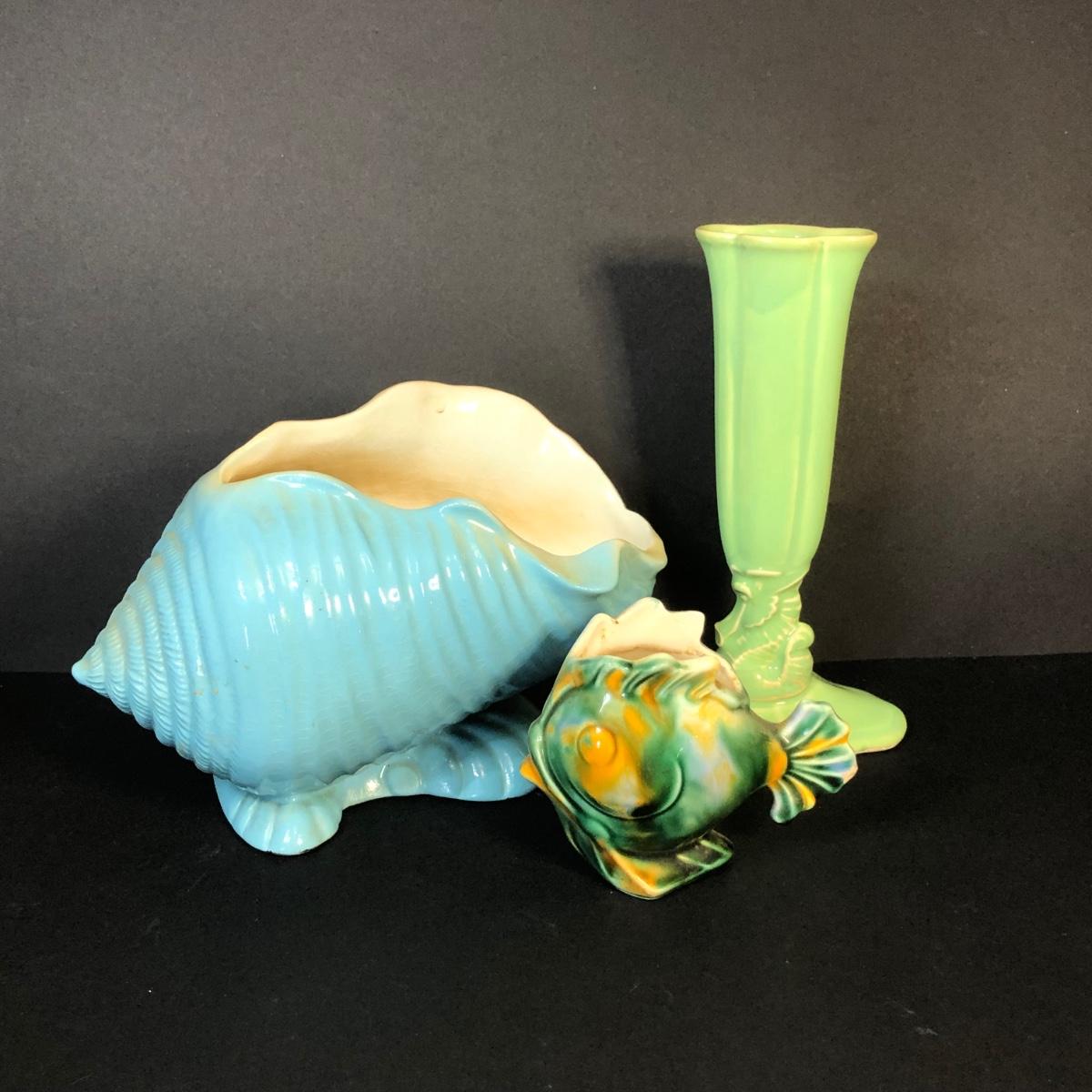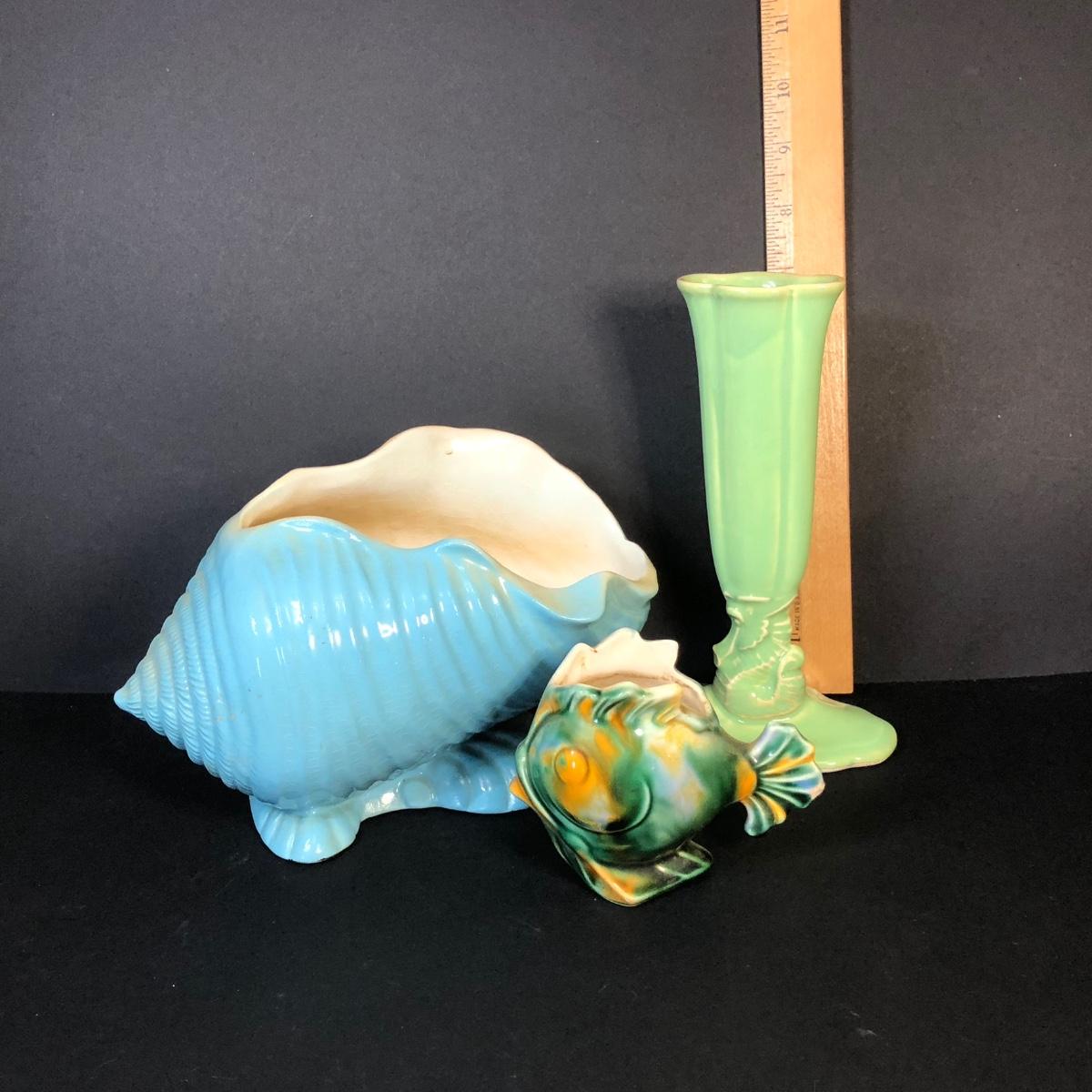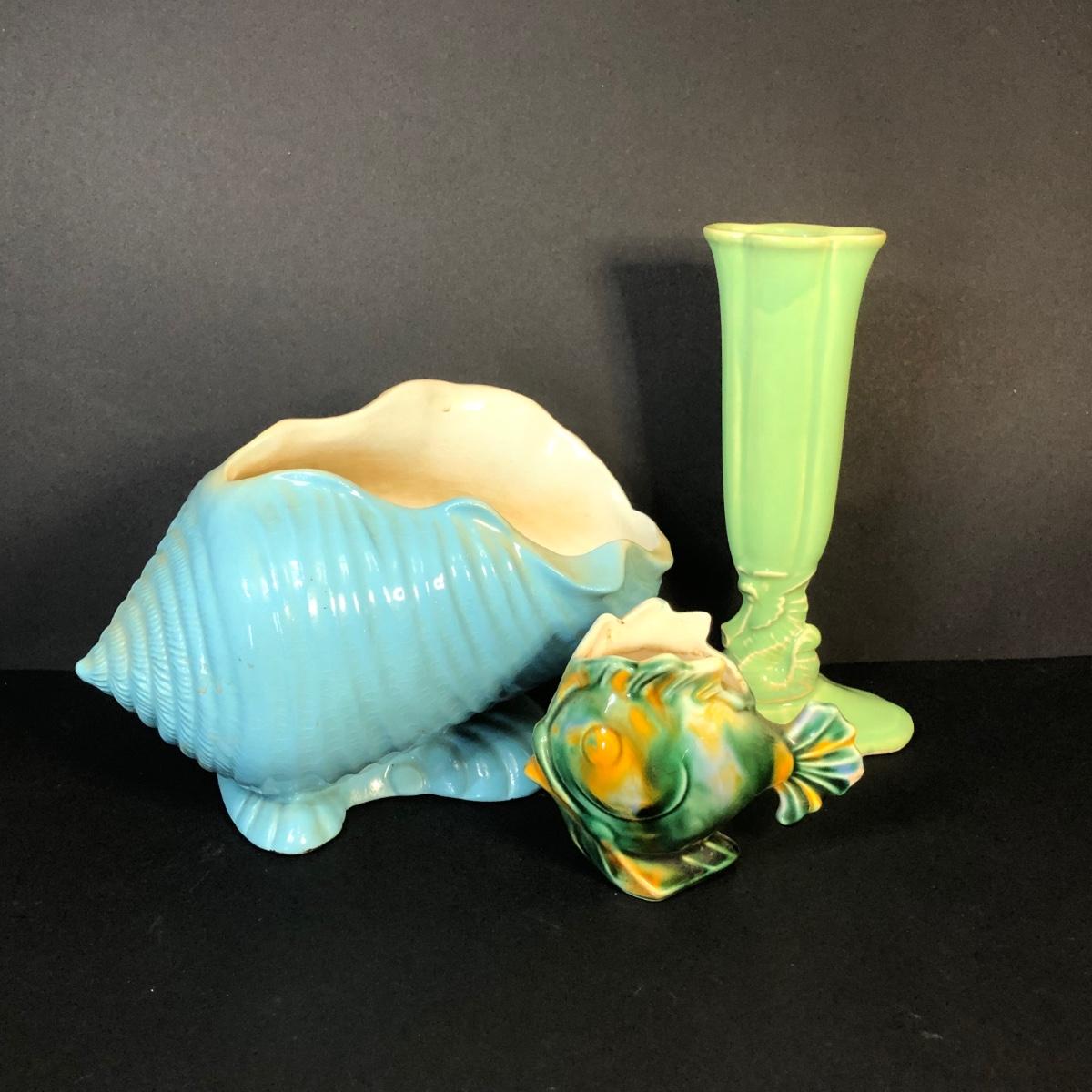LOT 40M: Roosville Pottery Blue Shell, Cowan Pottery Seahorse Vase & Colorful Pottery Fish