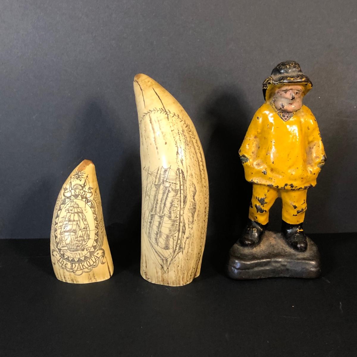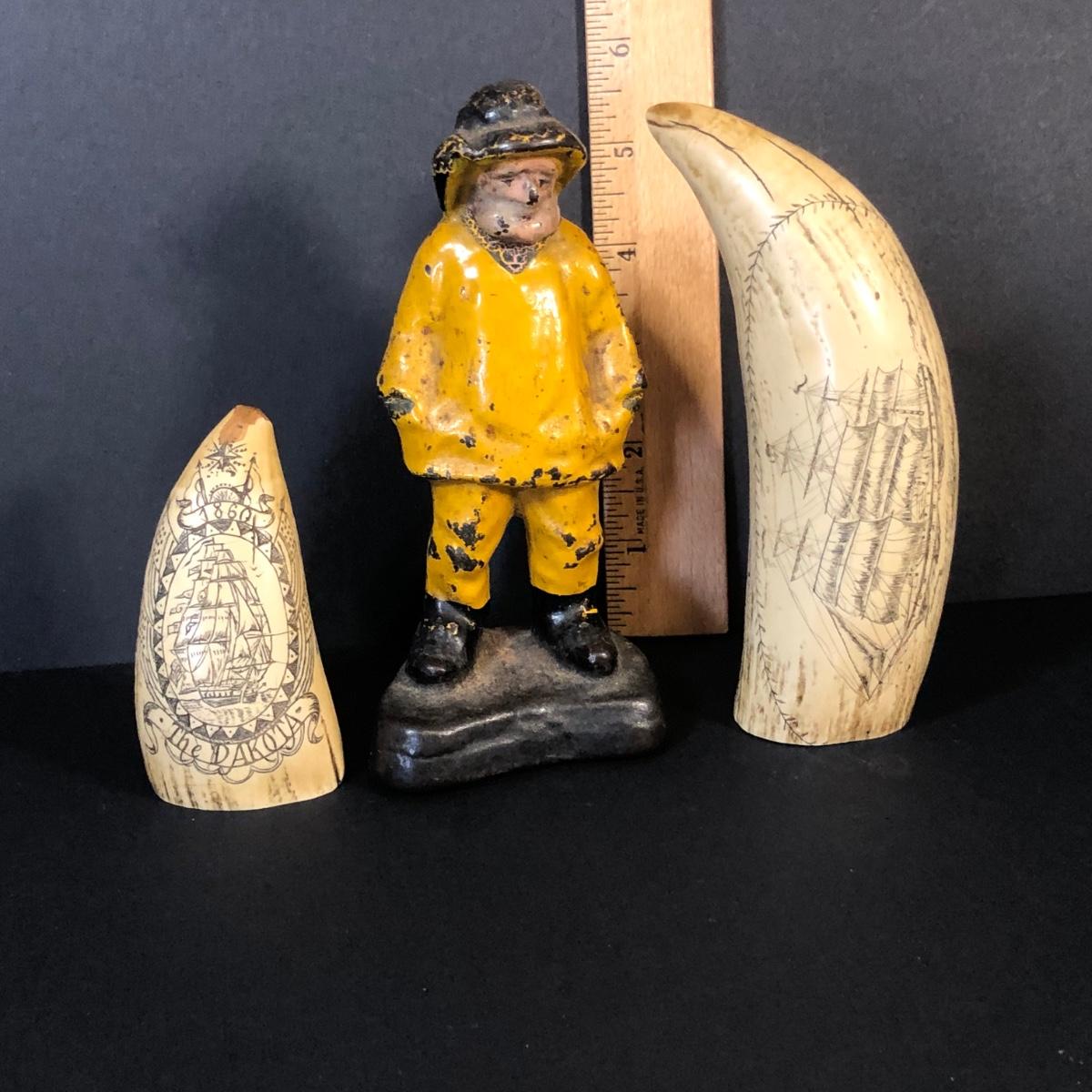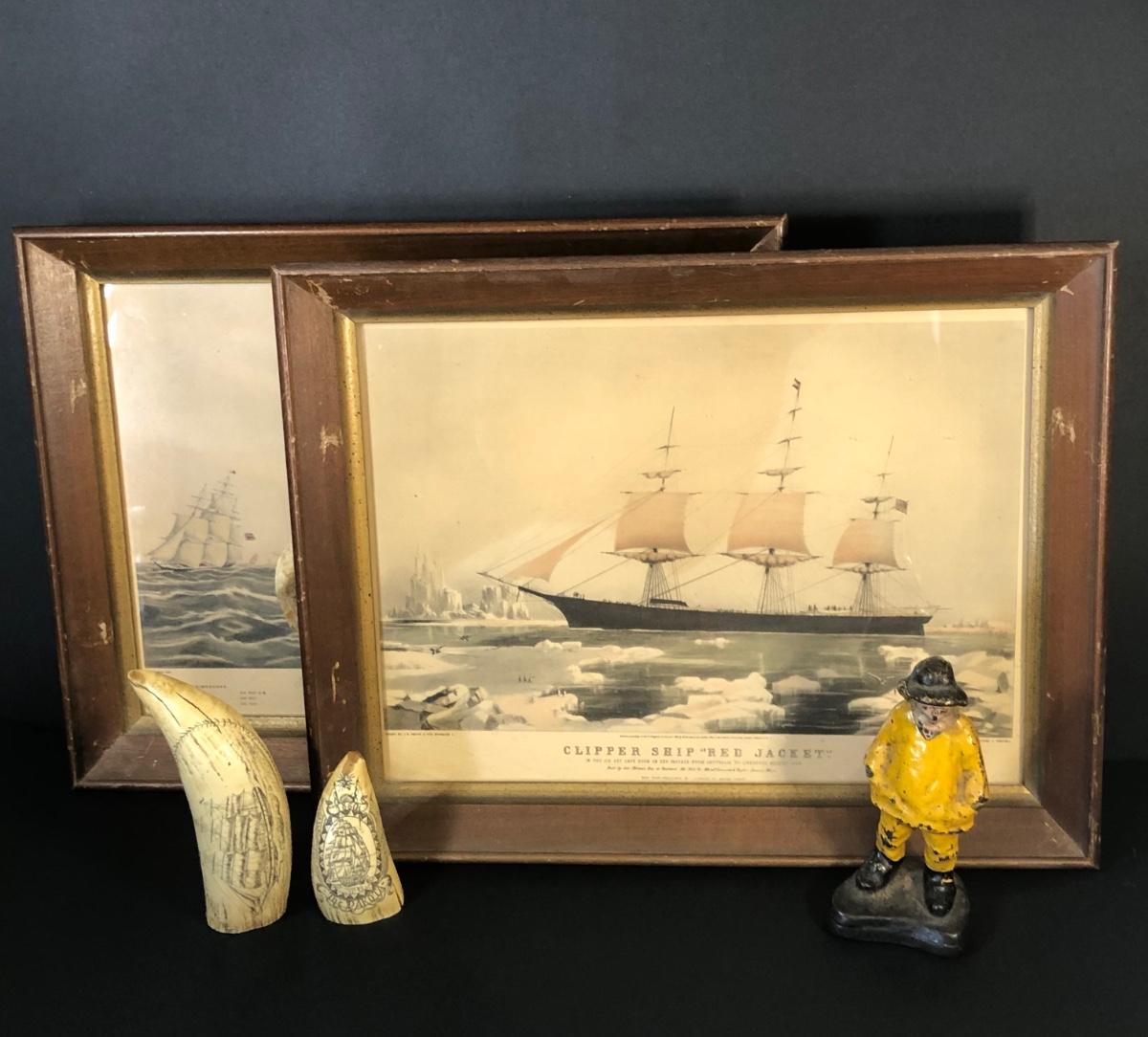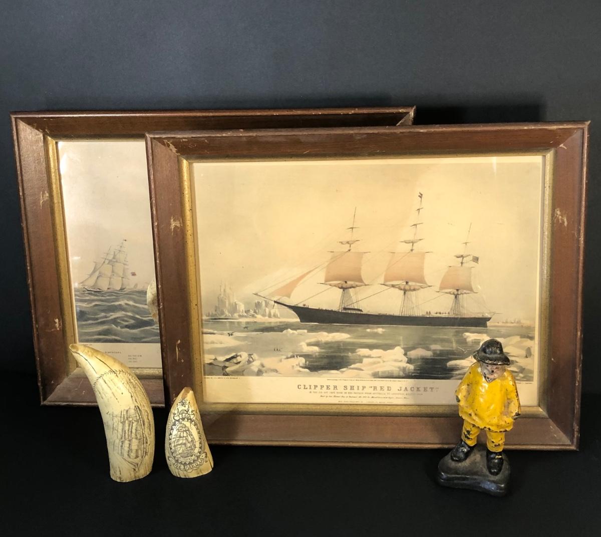 LOT 45M: Nantucket Scrimshaw Reproductions, Heavy Metal Old Salt Figure & Framed Clipper Ship Posters