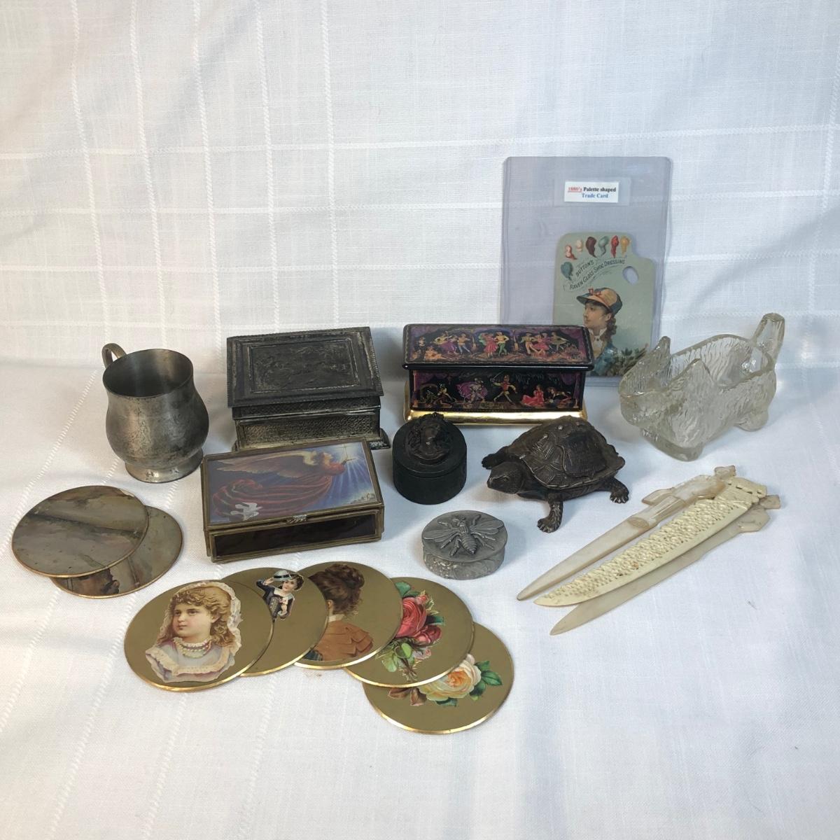 LOT 49M: Trinket Boxes, Vintage Collector Cards, Scottie Candy Dish, Pewter Cup & More