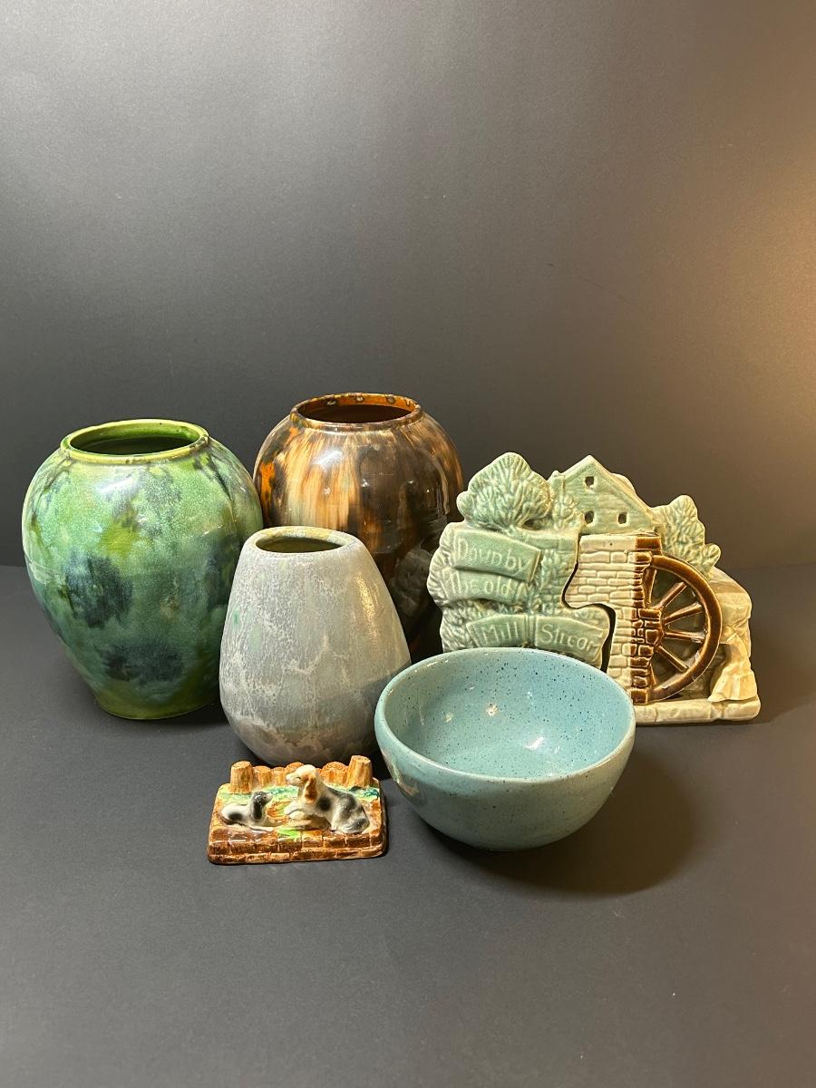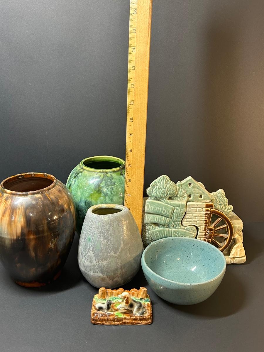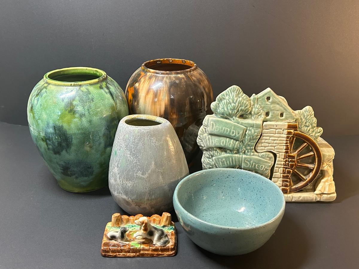 Three Pottery Vases, bowl, occupied Japan dog figurine and McCoy Millstream.