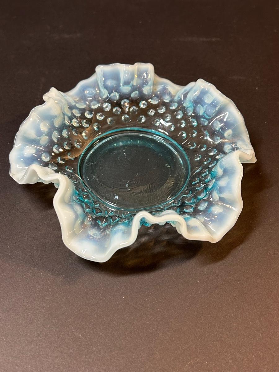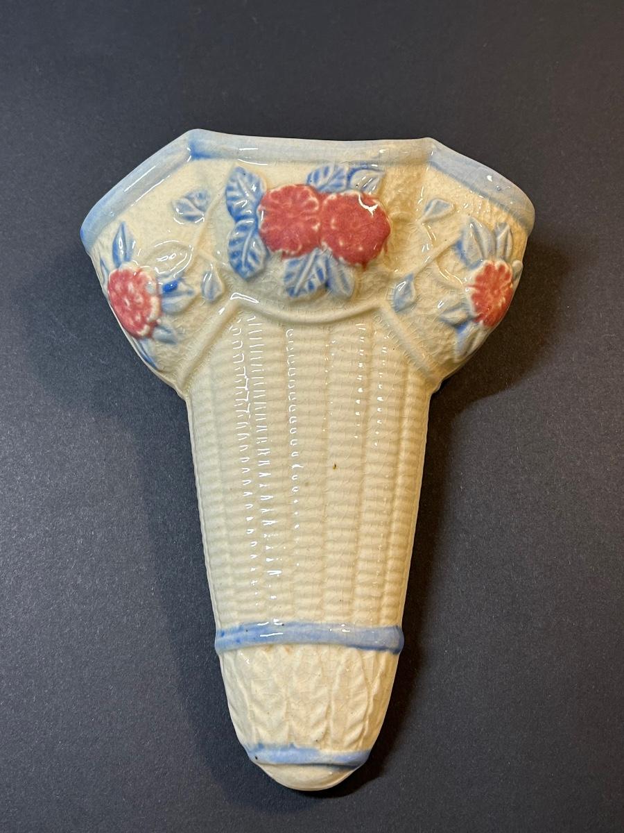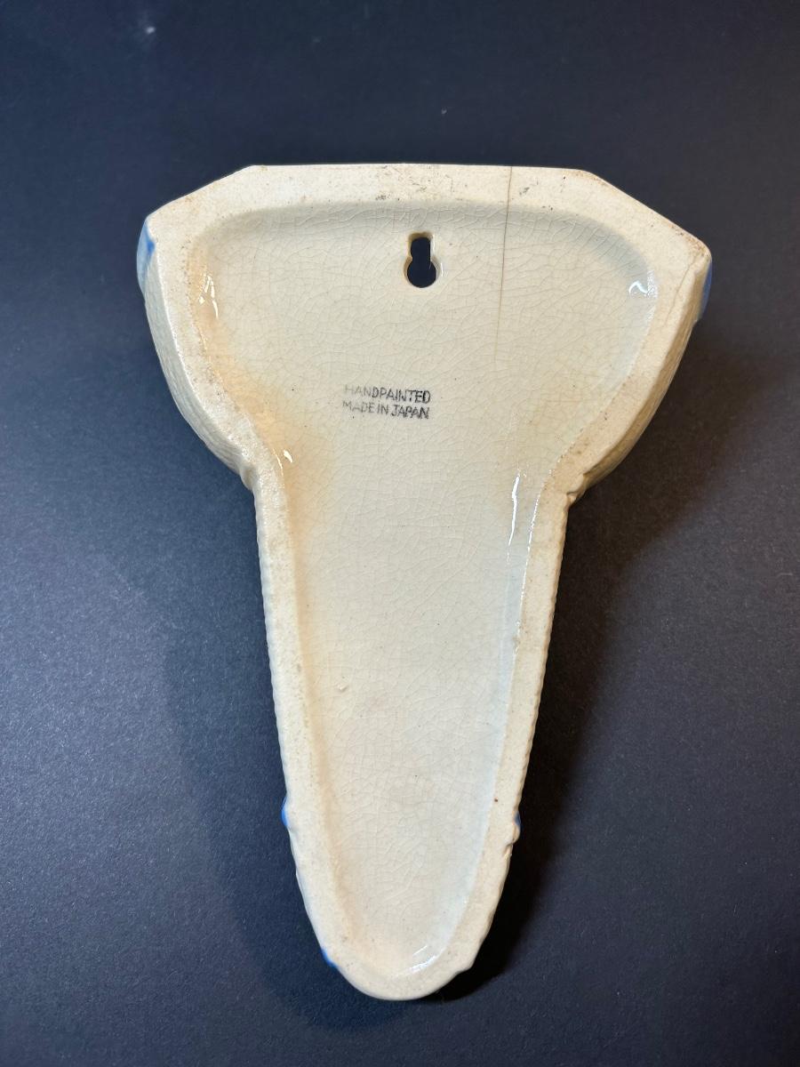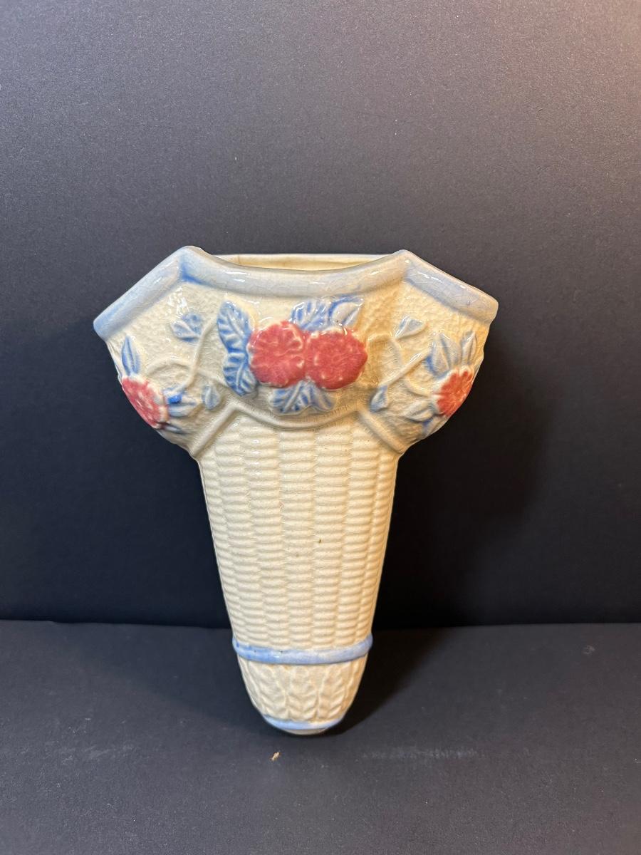 McCoy pottery, wall flower vase, signed decorative bird, pink glass and dish and blue trinket dish.