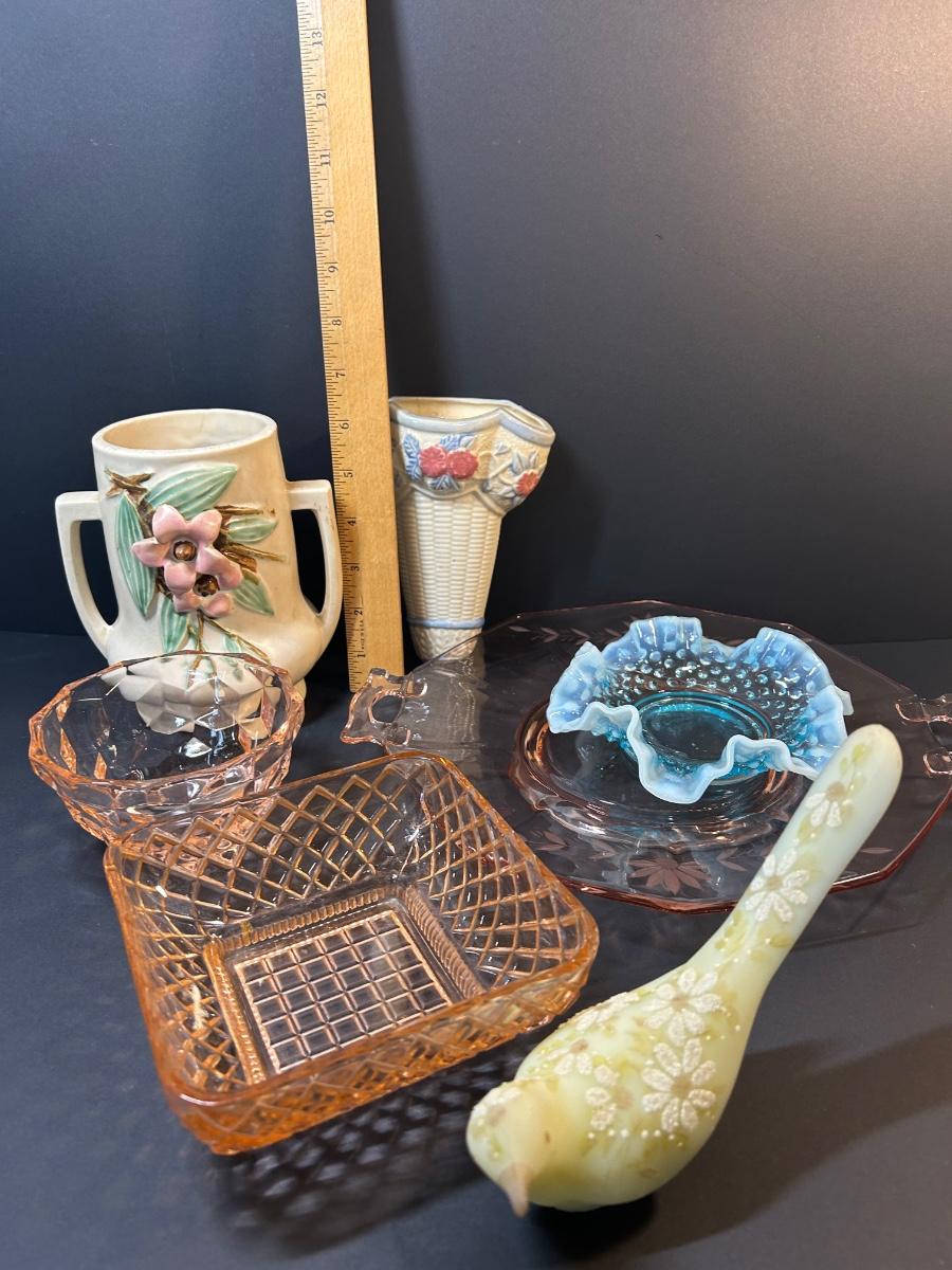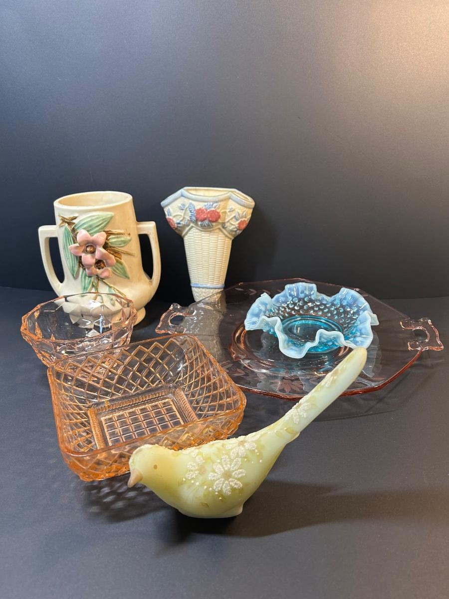 LOT 85: McCoy Pottery, Signed Bird, Pink Depression Glass & More