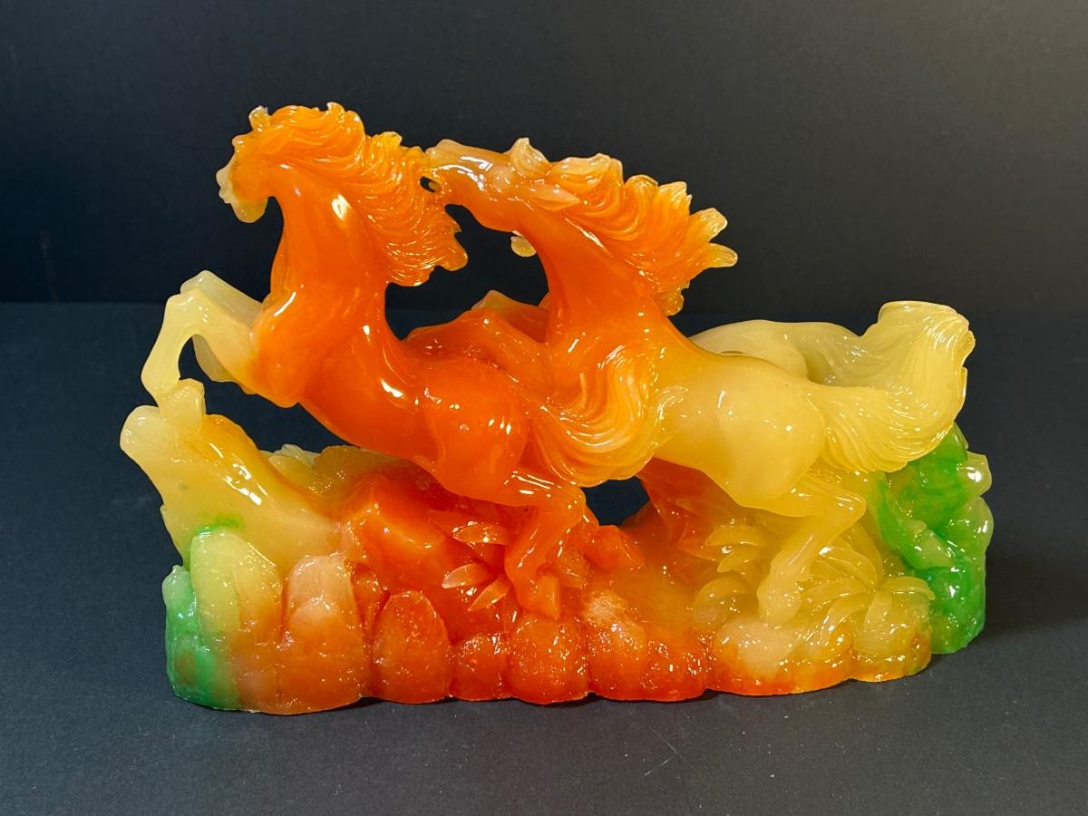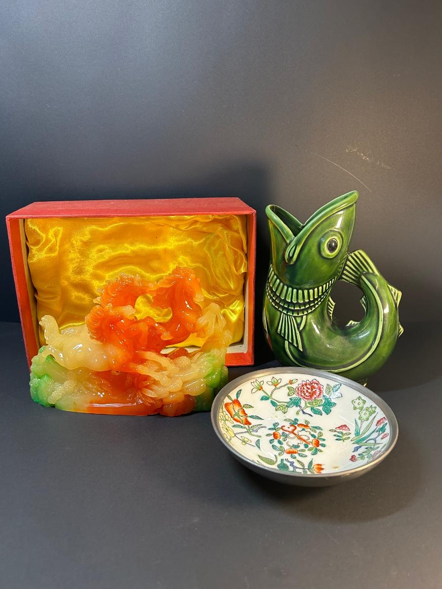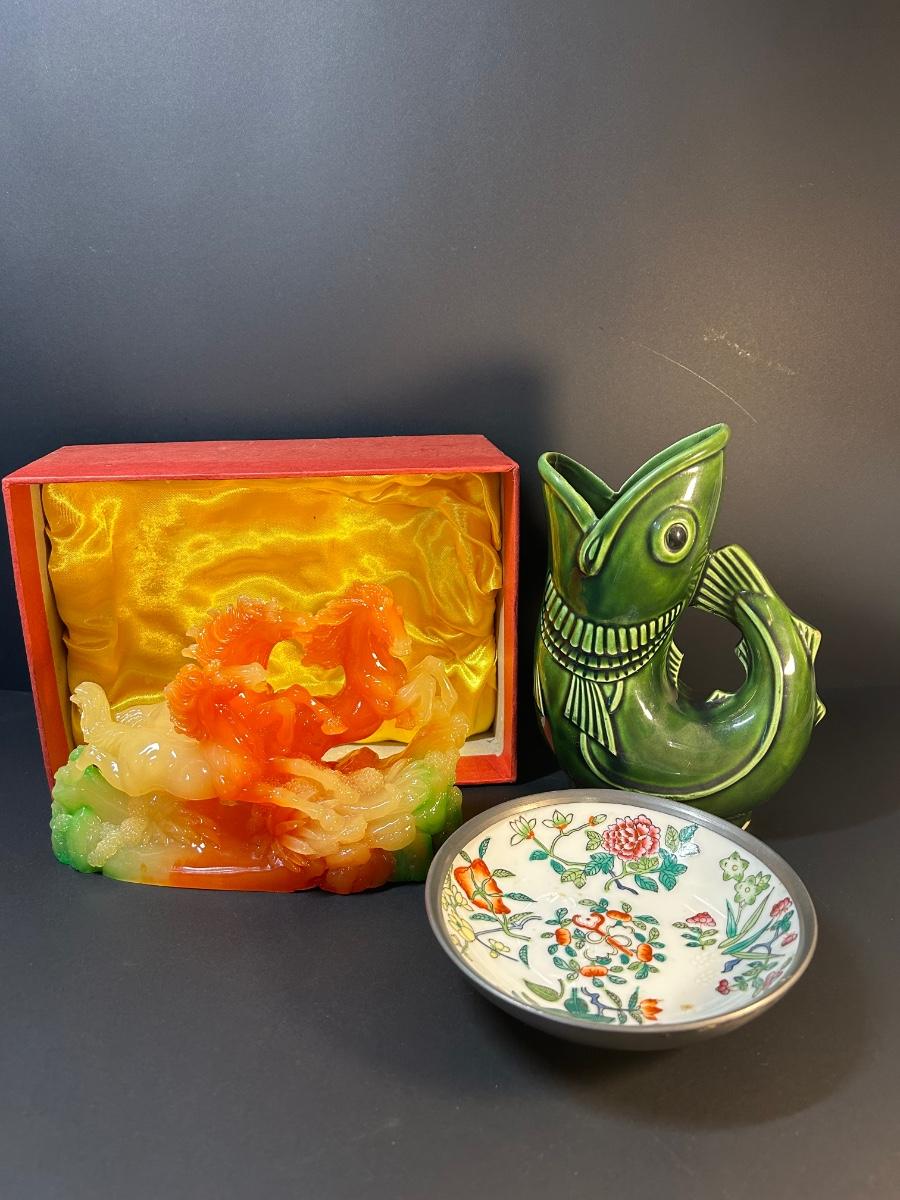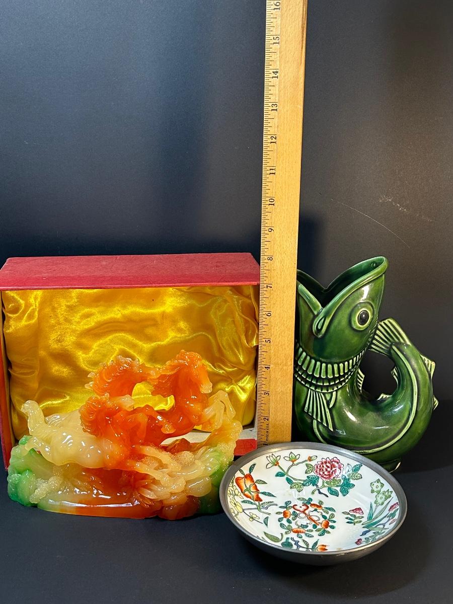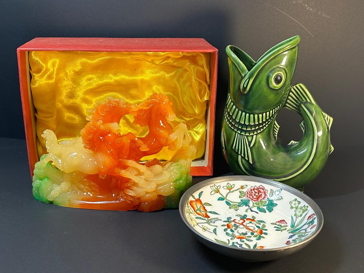 LOT 87: Fiery Bright Great Gift: Three Wild Horses Figurine, Japanese Porcelain Ware & Green Multi-Purpose Fish  Jug