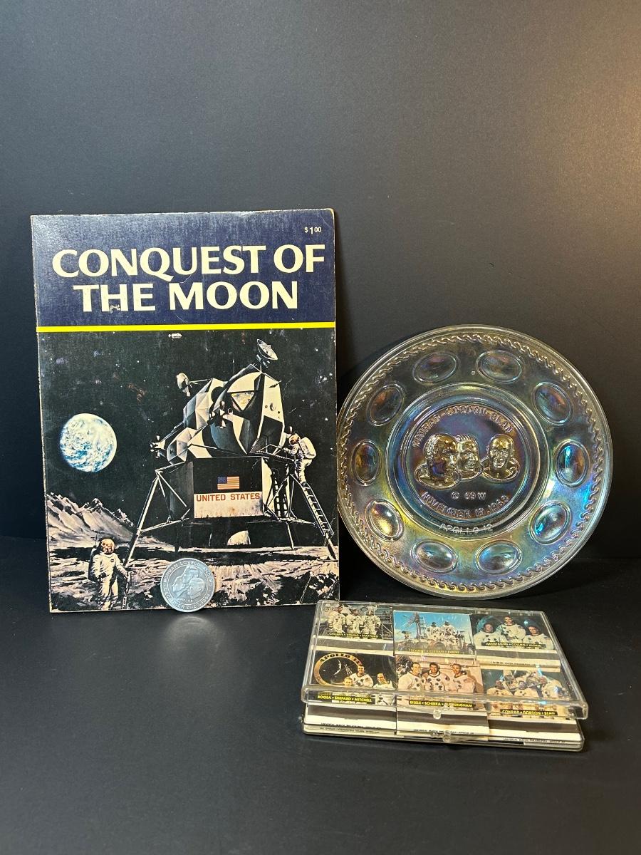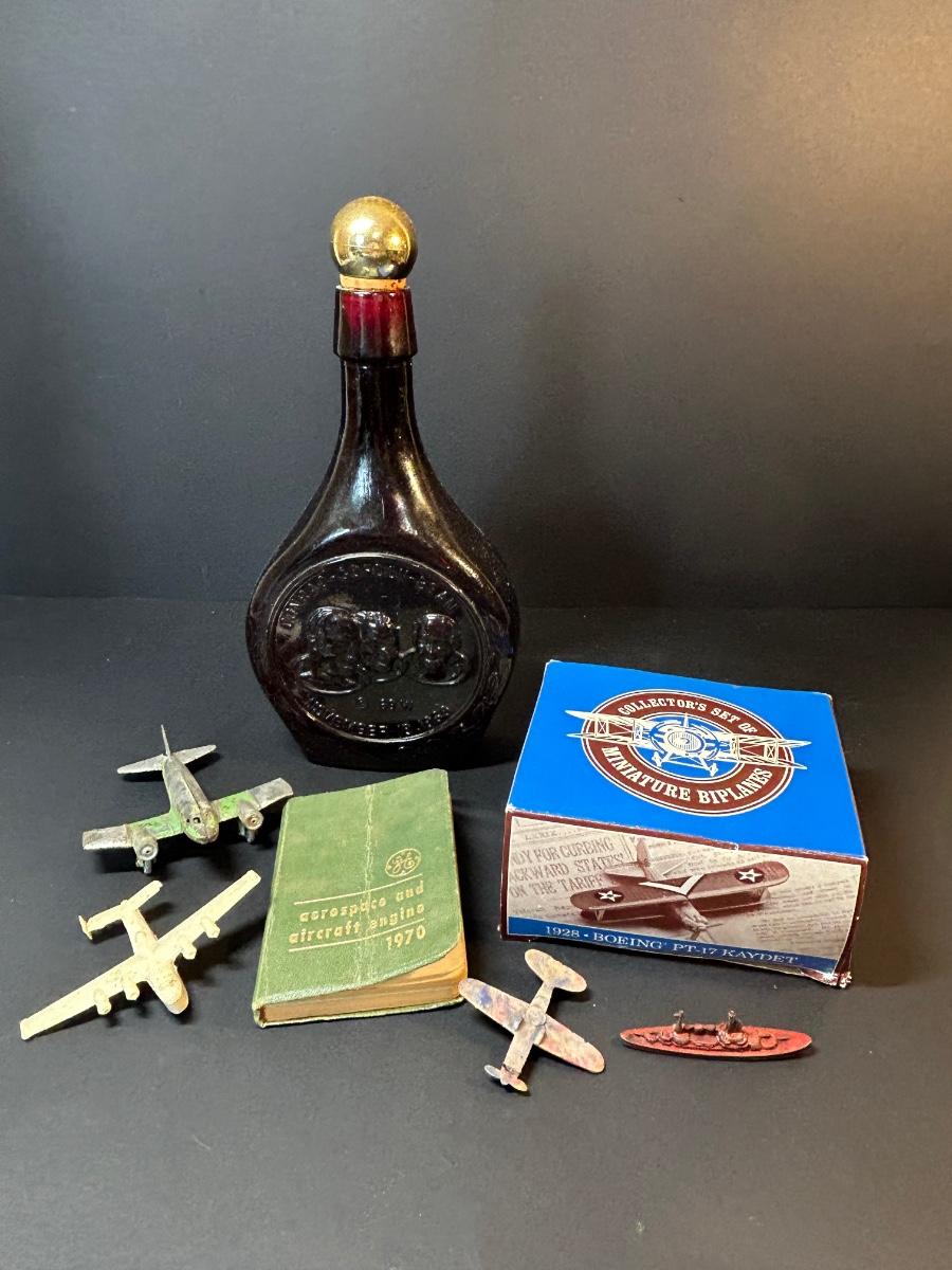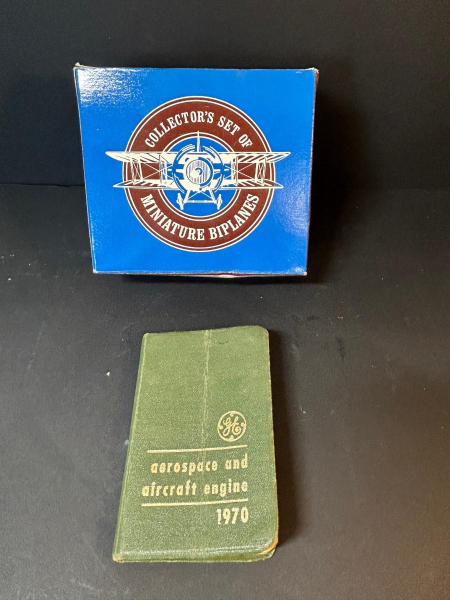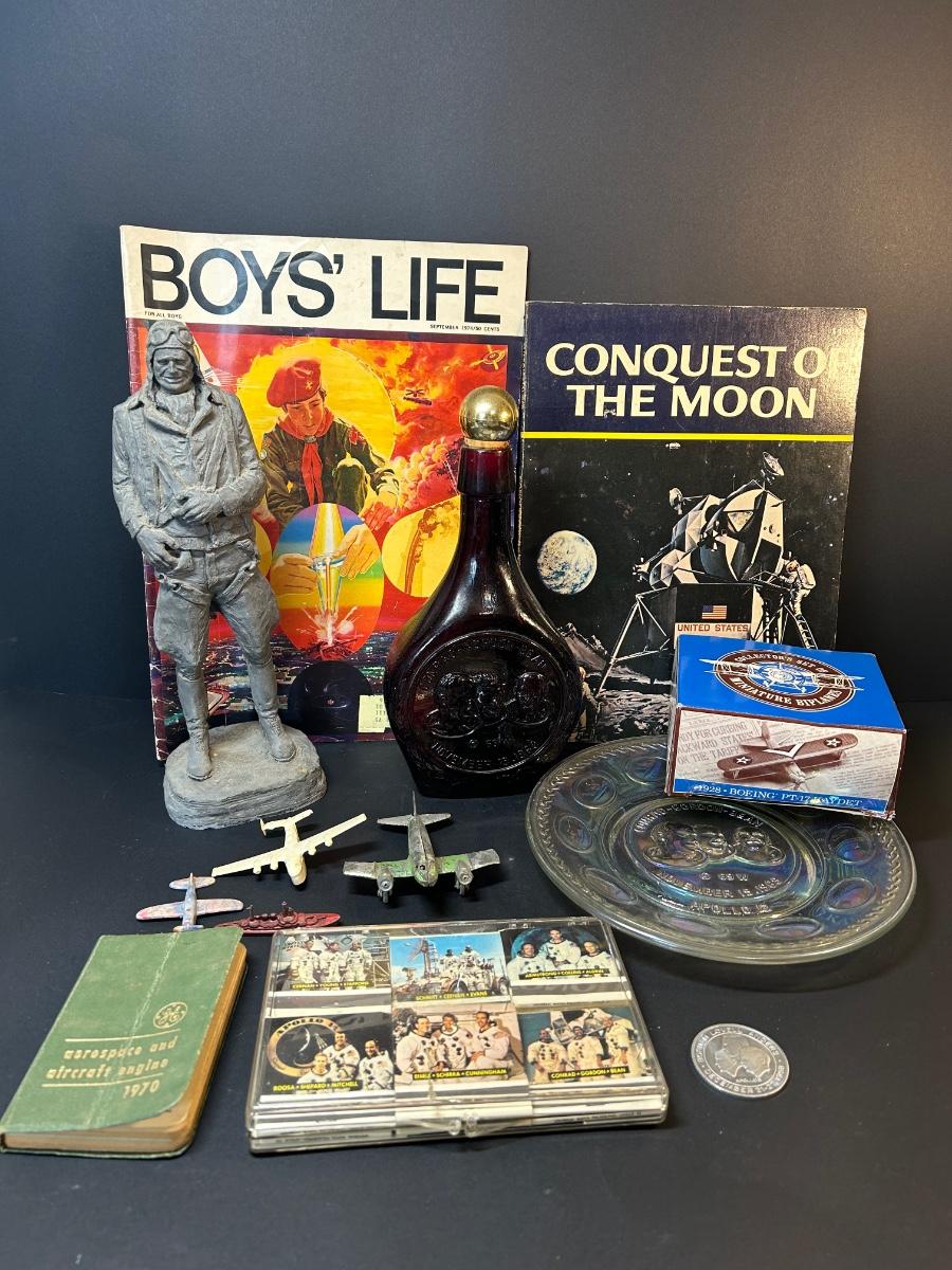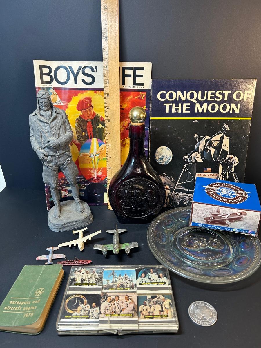 Vintage books including 1979 aerospace and aircraft engines book by GE. Apollo II bottle and match books. Signed pilot statue and more.