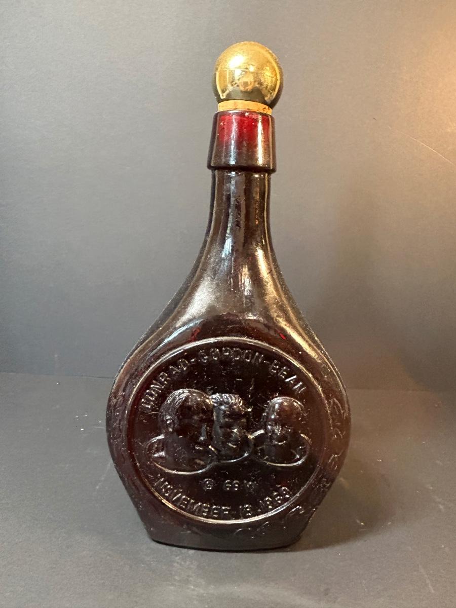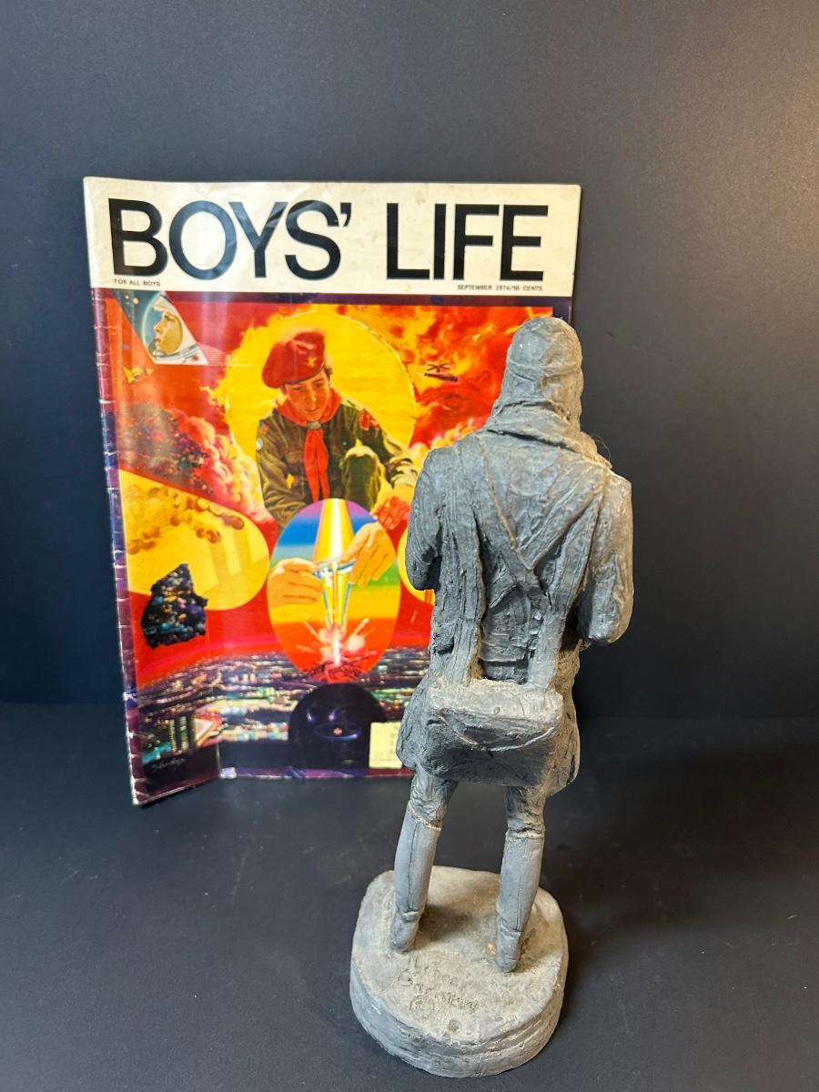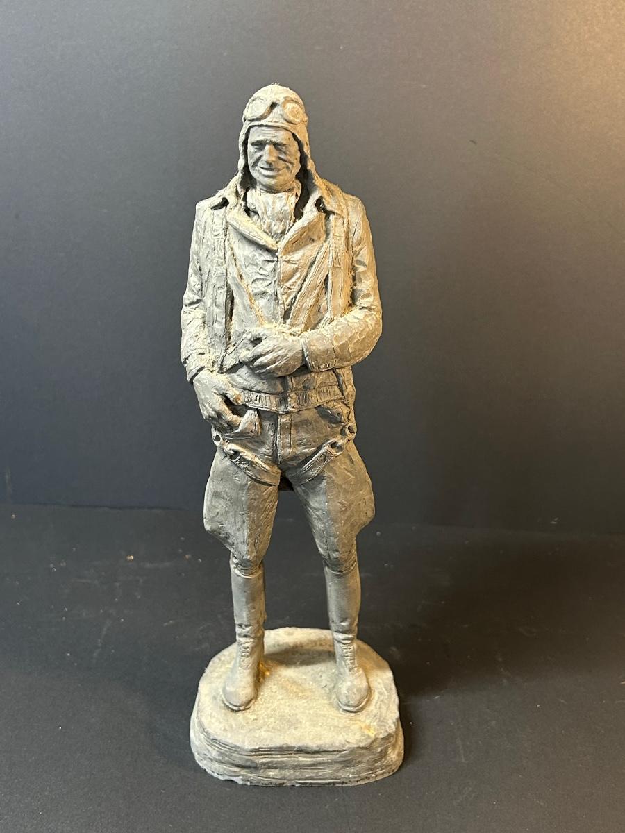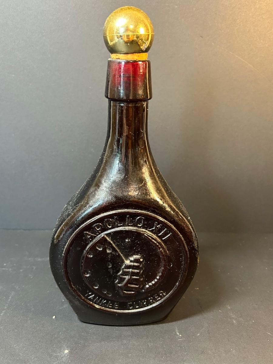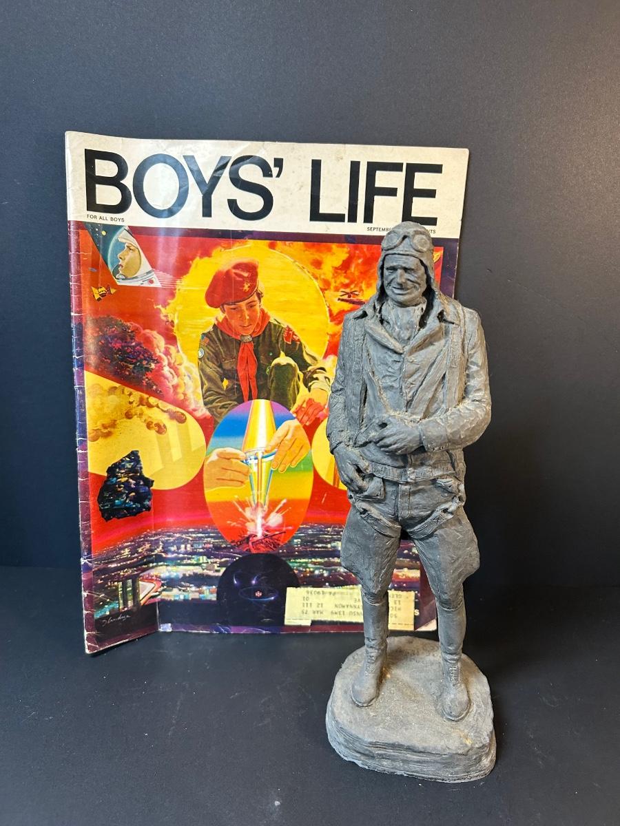 Vintage books including 1979 aerospace and aircraft engines book by GE. Apollo II bottle and match books. Signed pilot statue and more.