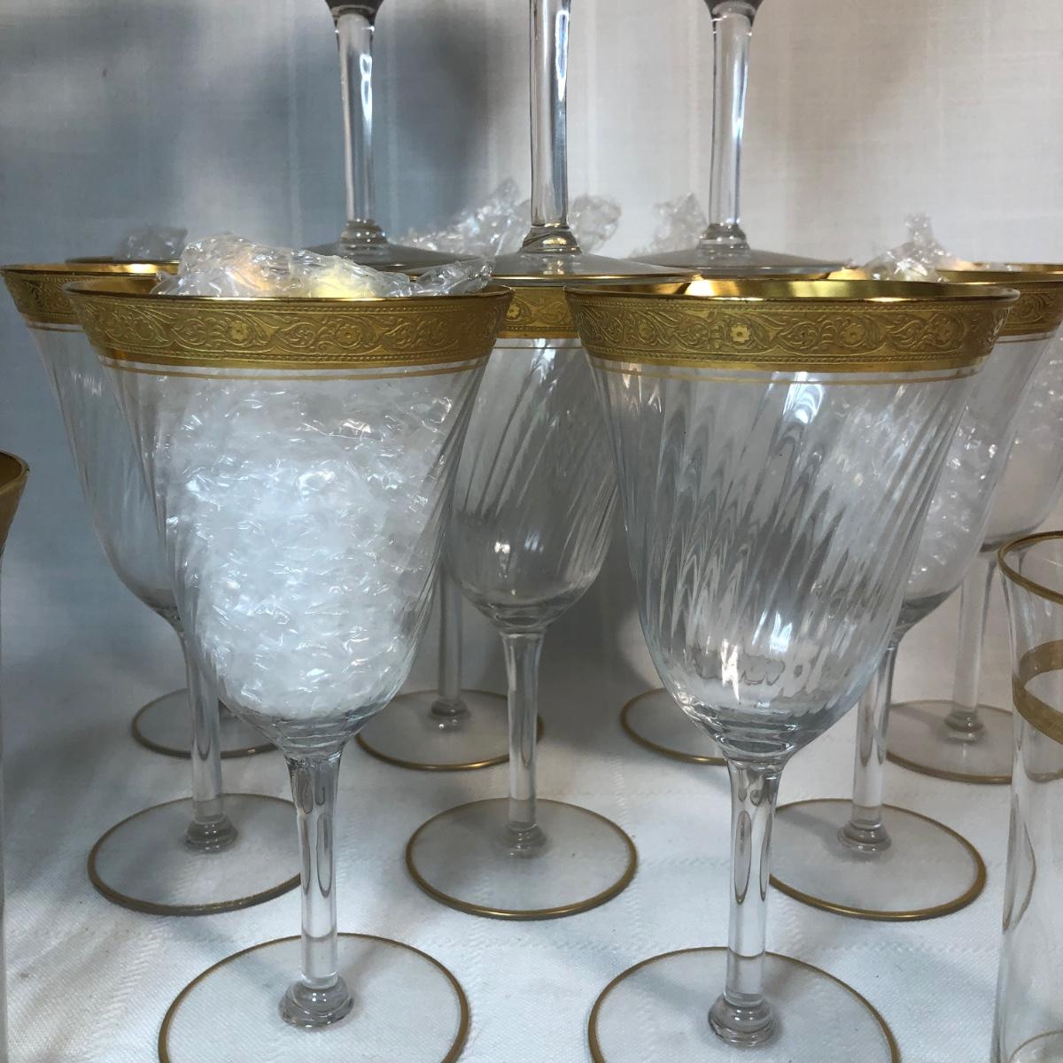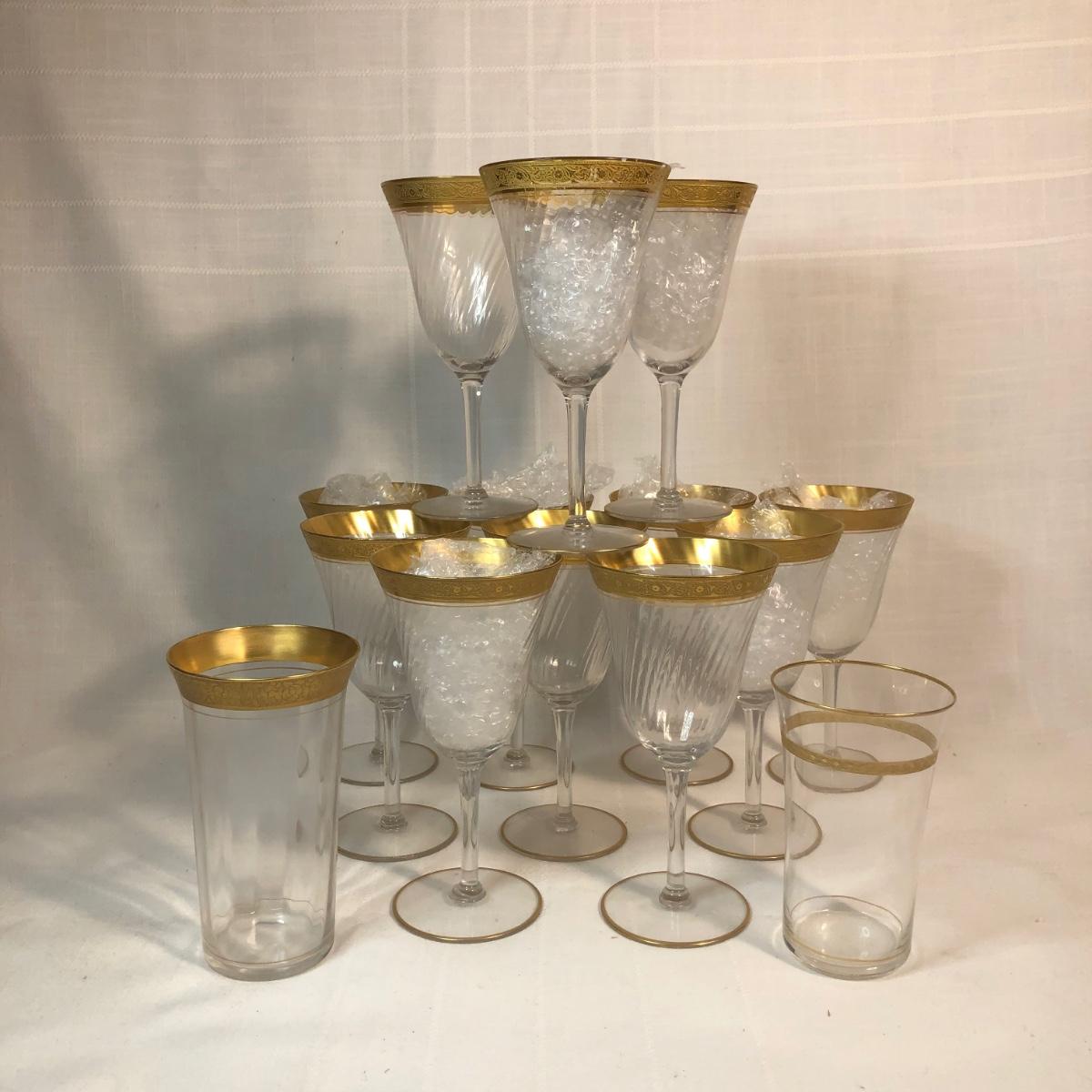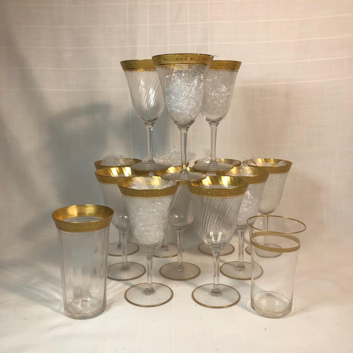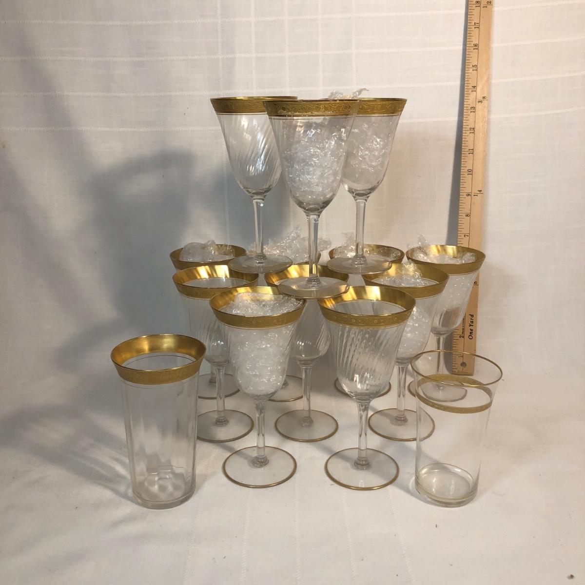 Few glasses have condition issues. 12 stemmed glasses included. 2 unique glasses w/ matching patterns included as well.