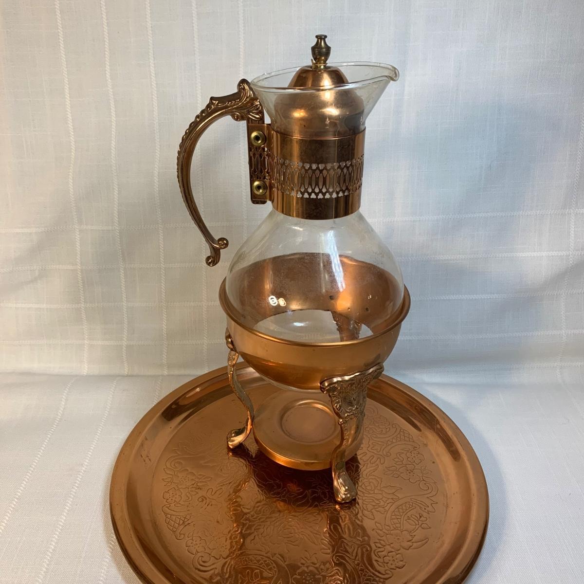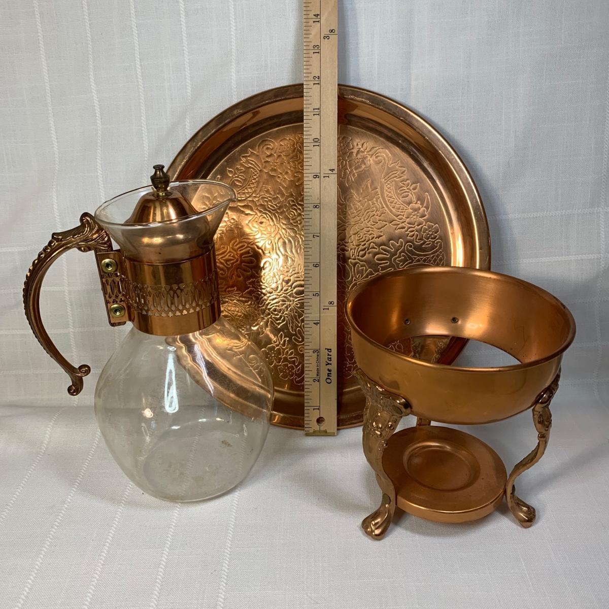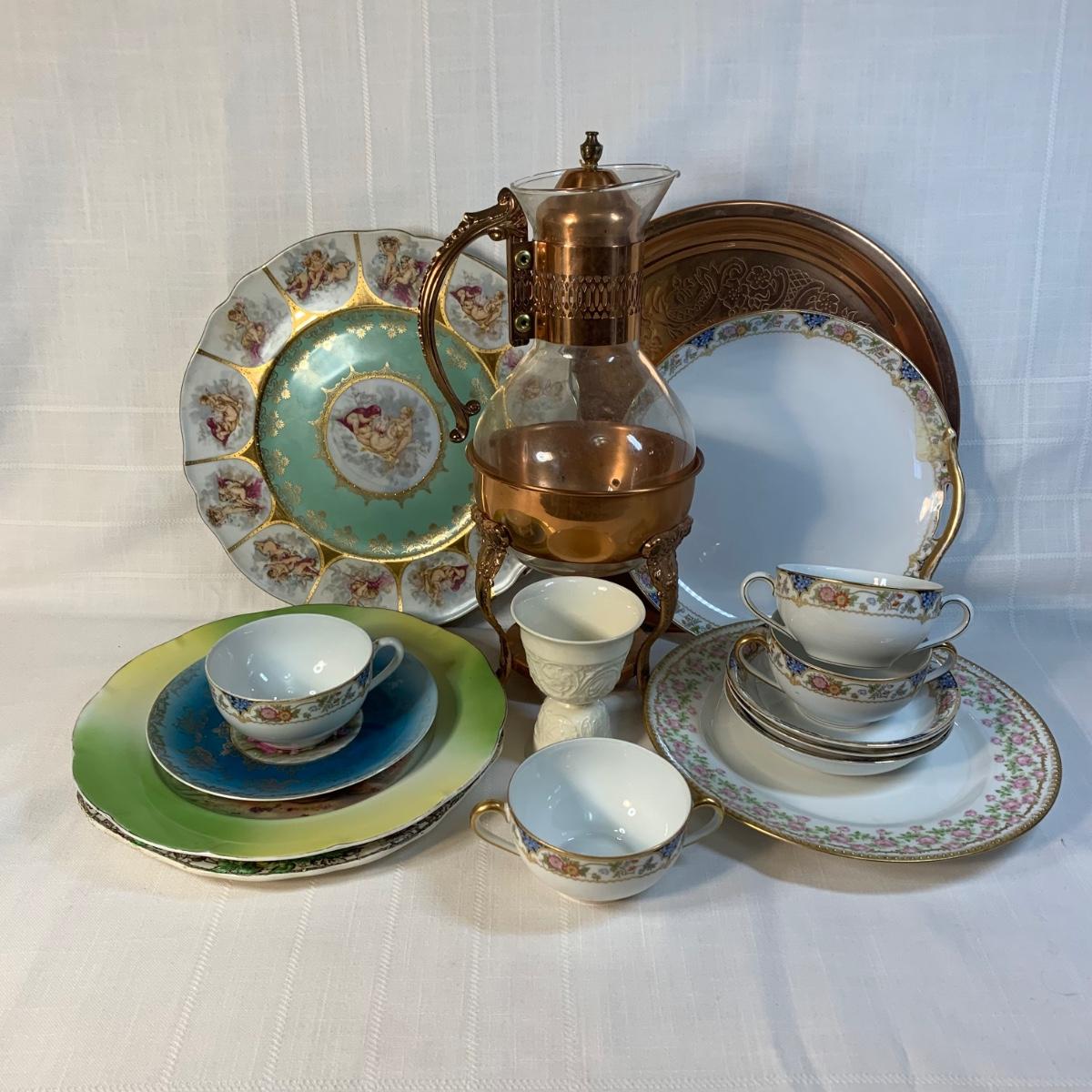 LOT 146: Copper Tea Server w/Warmer Base & Serving Tray & Vintage Spode, Limoge, JK Carlsbad & Noritake