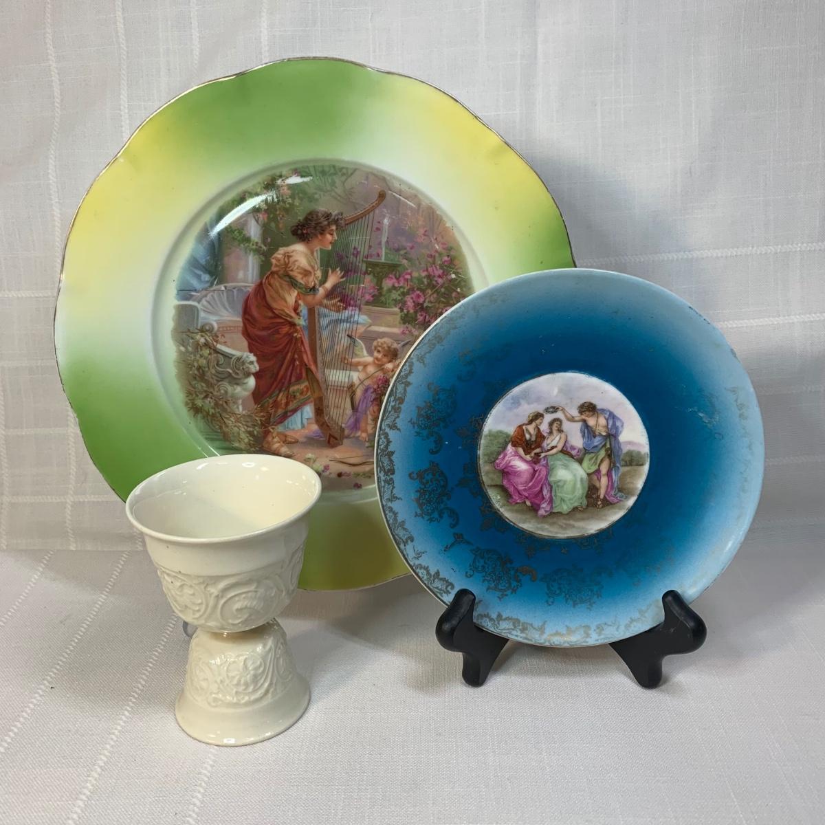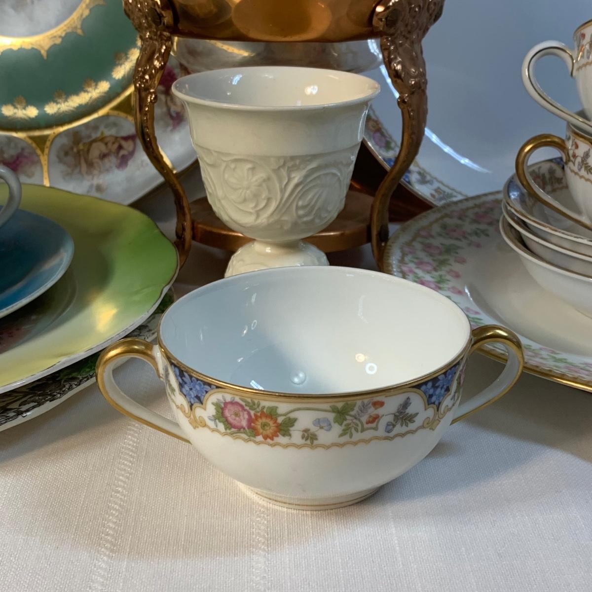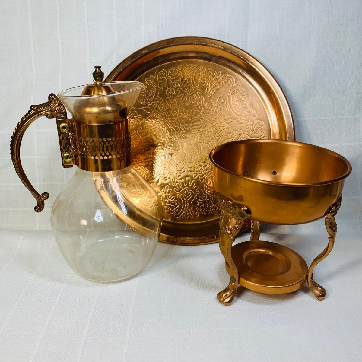 LOT 146: Copper Tea Server w/Warmer Base & Serving Tray & Vintage Spode, Limoge, JK Carlsbad & Noritake