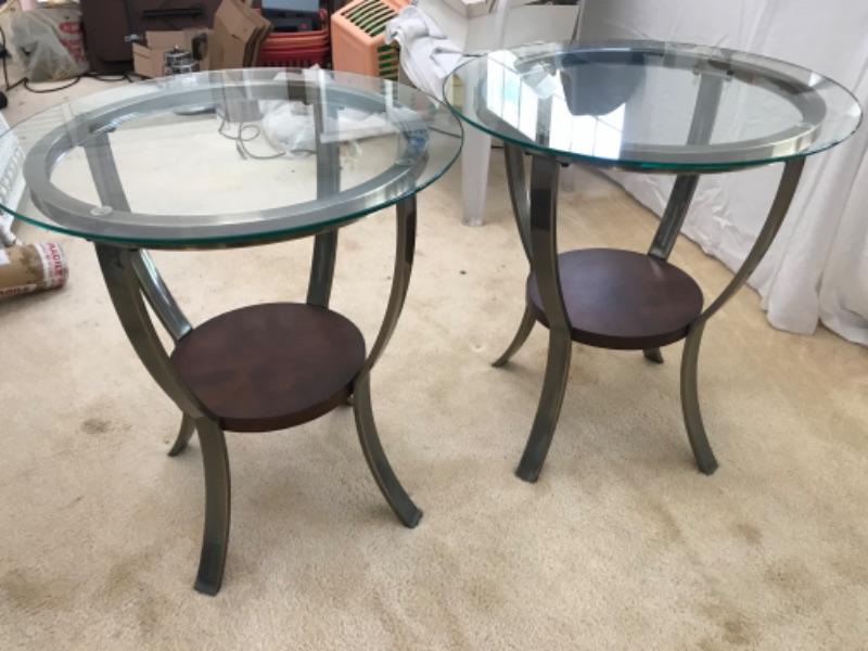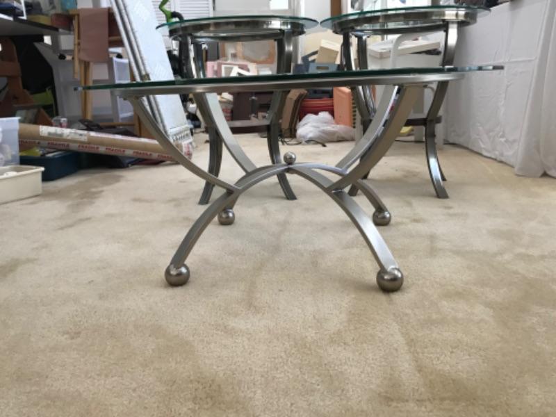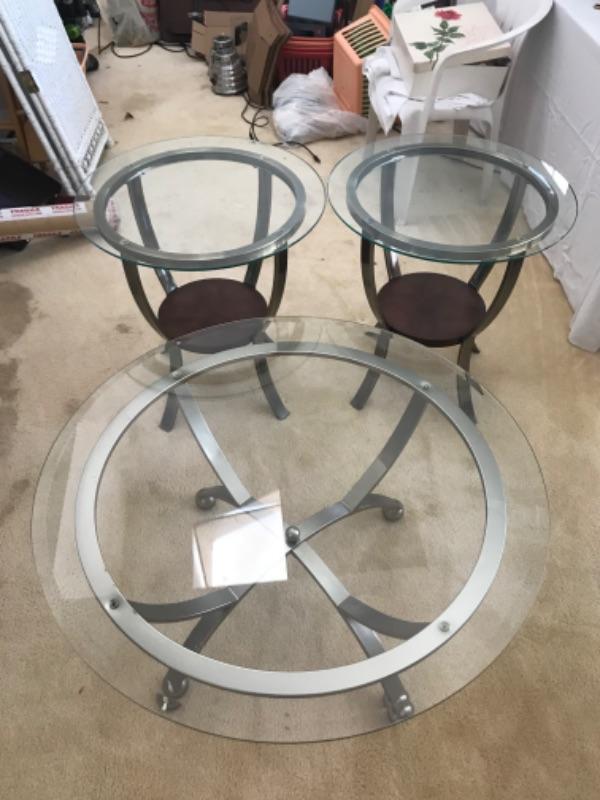 3 pc set of glass top coffee table and two end tables Small glass tables measure 23 1/2 inches round the large glass table measures 37 1/2 inches round