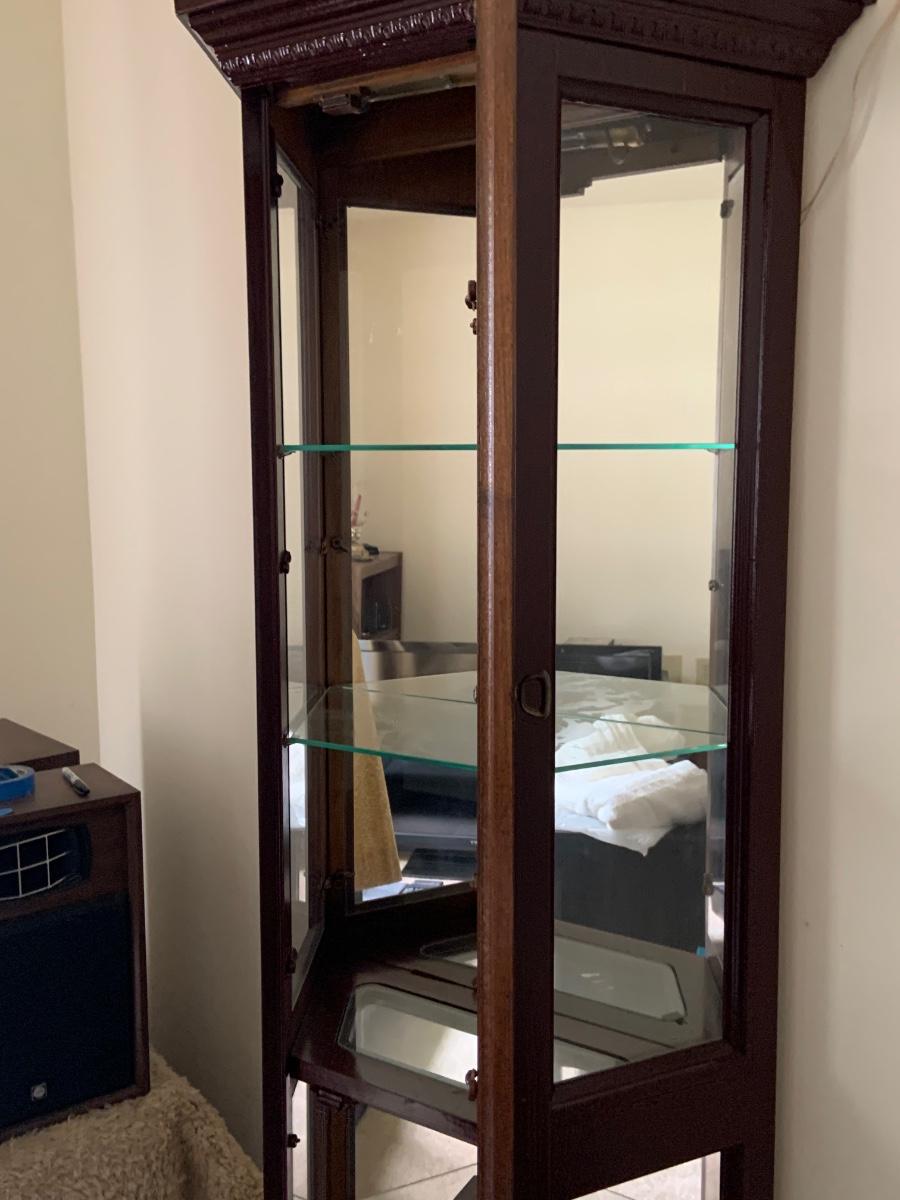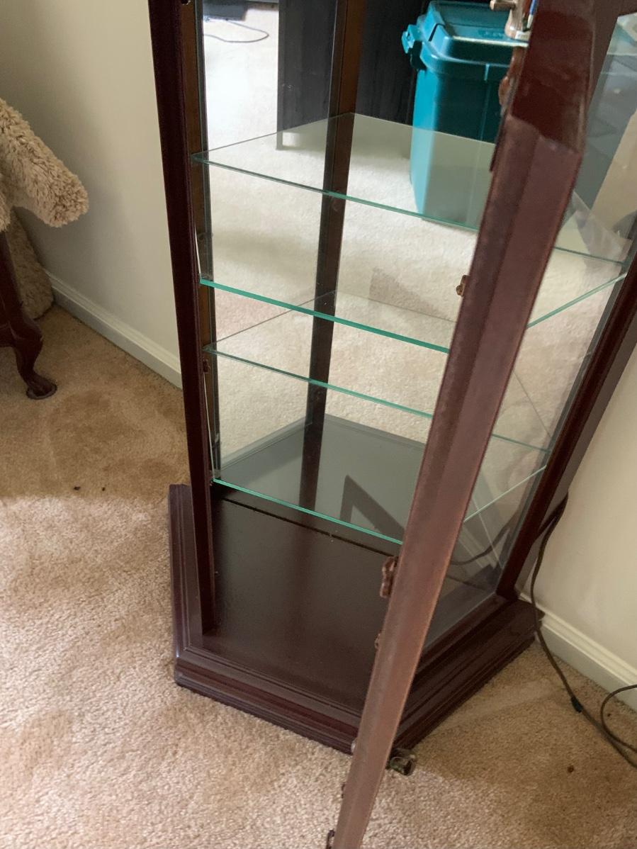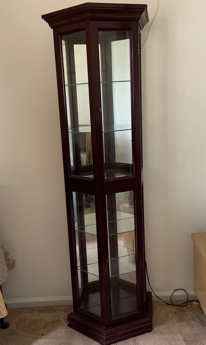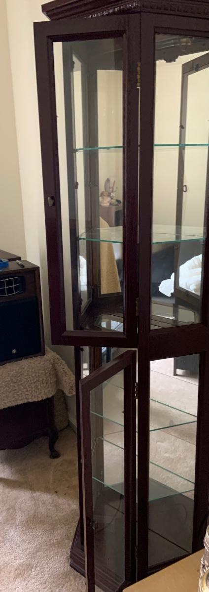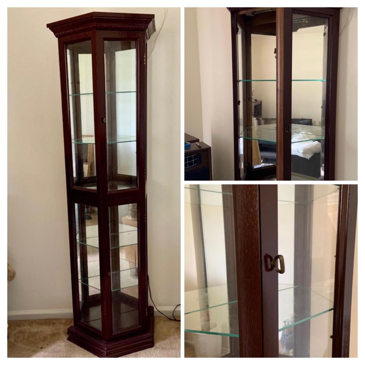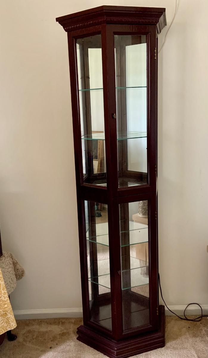 LOT:109G: Mirrored Tall Wooden Curio Cabinet with Glass Shelves