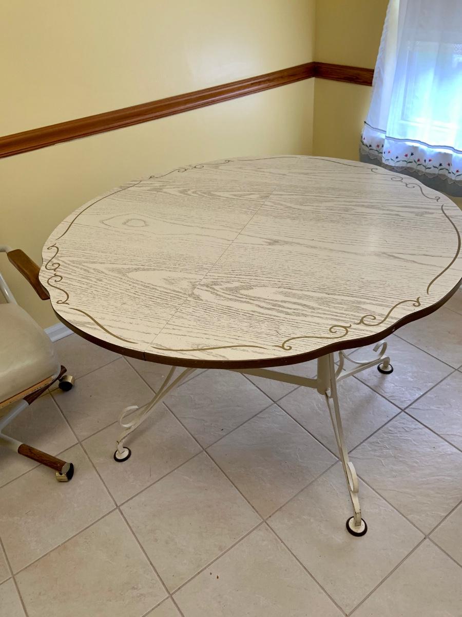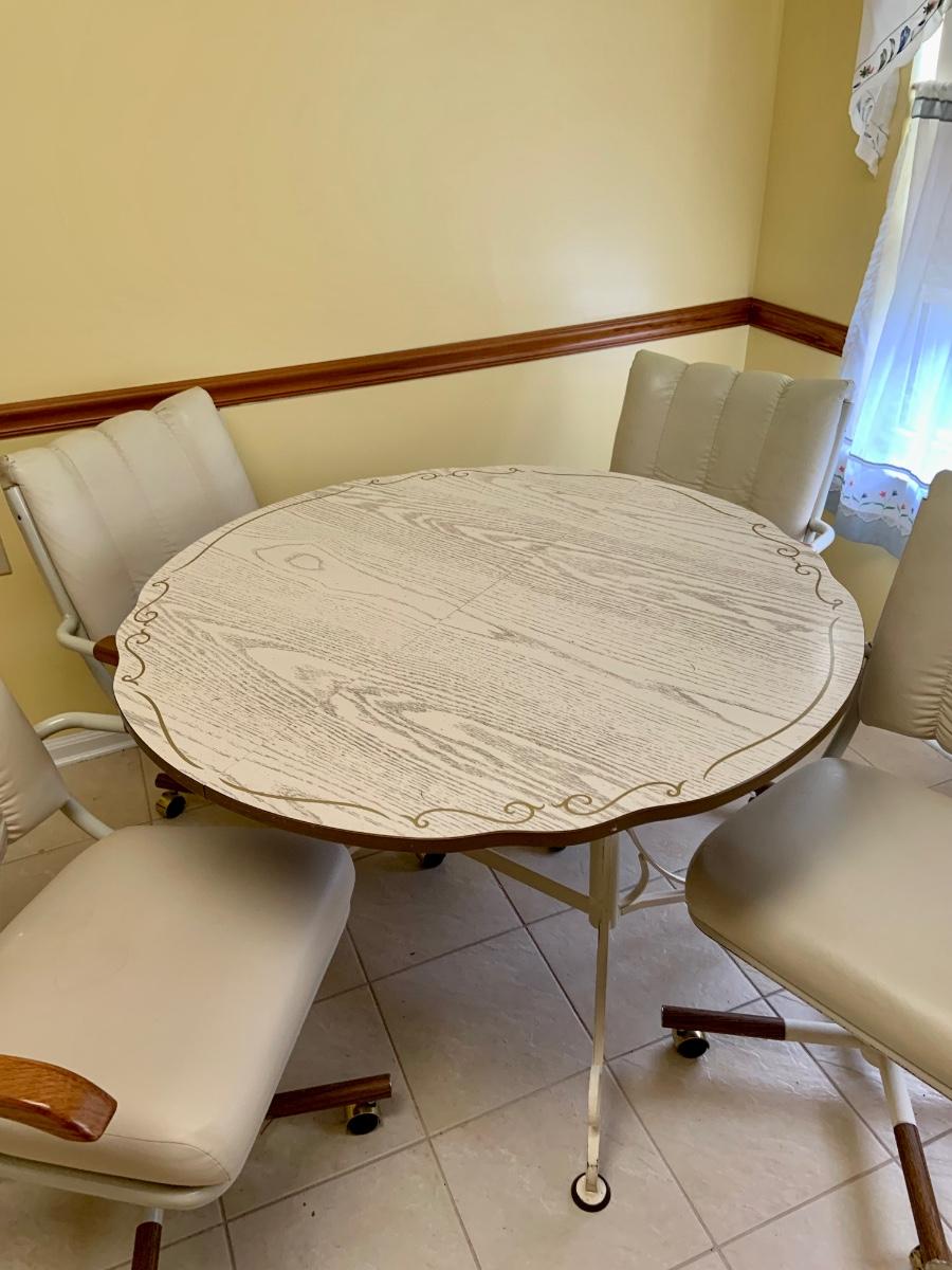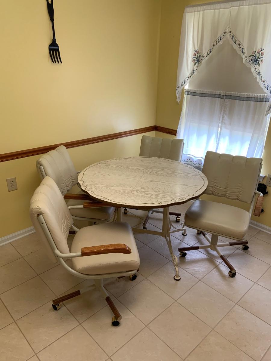 It is a 42" round Table. and the Chairs Measure 24" x 17" x 34". Please see all pictures as they are the best representation of the items. The pictures show condition, measurements if taken, and what is included in the lot. Due to the large amount that we photograph and the time frame, we are not always able to take measurements. All items unless noted, are pre-owned and have been used. If you purchased furniture, you must bring help. We do not allow one person to carry large furniture out on their own. Bring help, tools and a truck for the safety of our client’s homes, and your personal safety. Any damages that result to the property including walls, and floors due to moving of the furniture will be charged to the buyer. Company policy. Thank you.