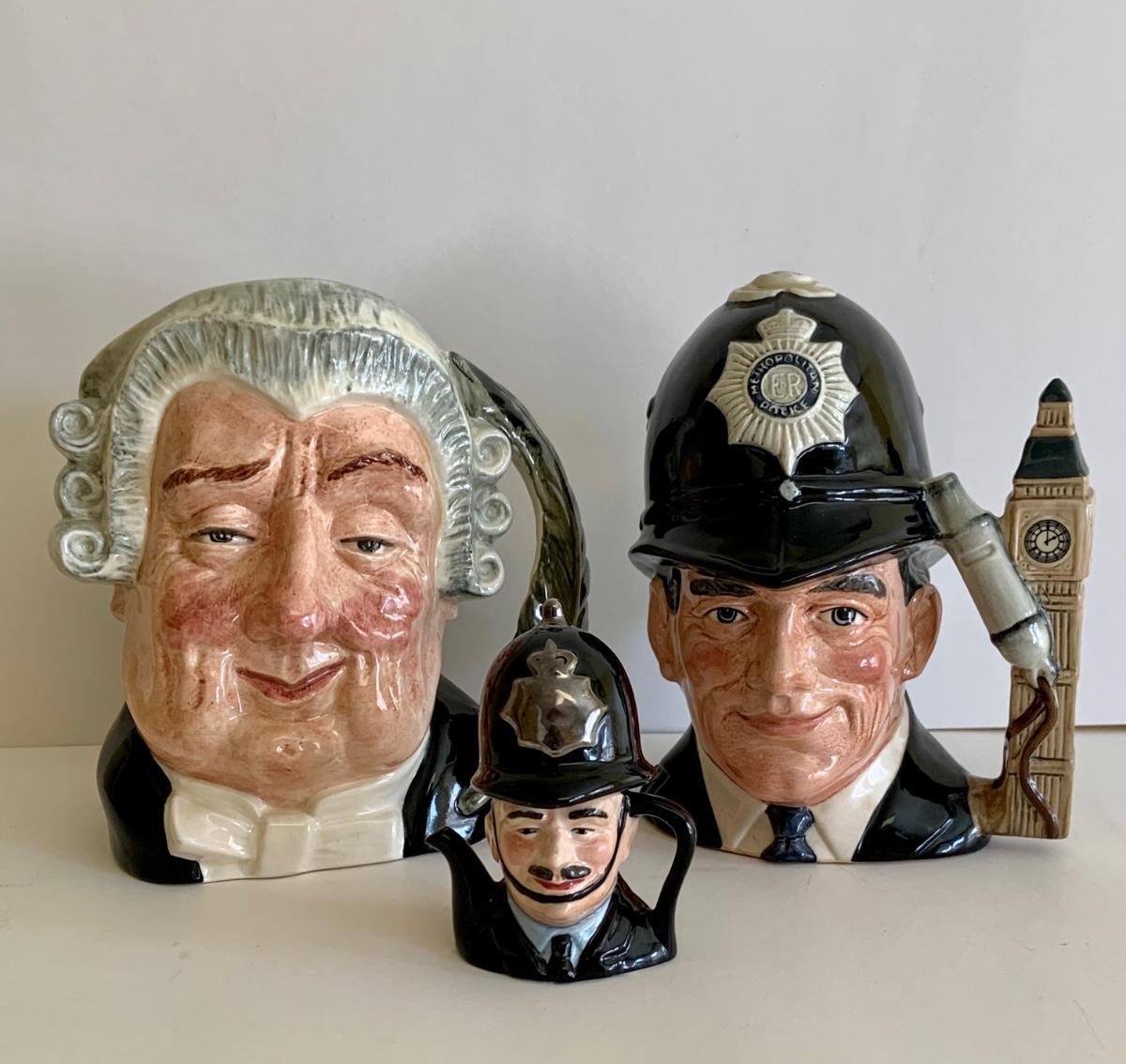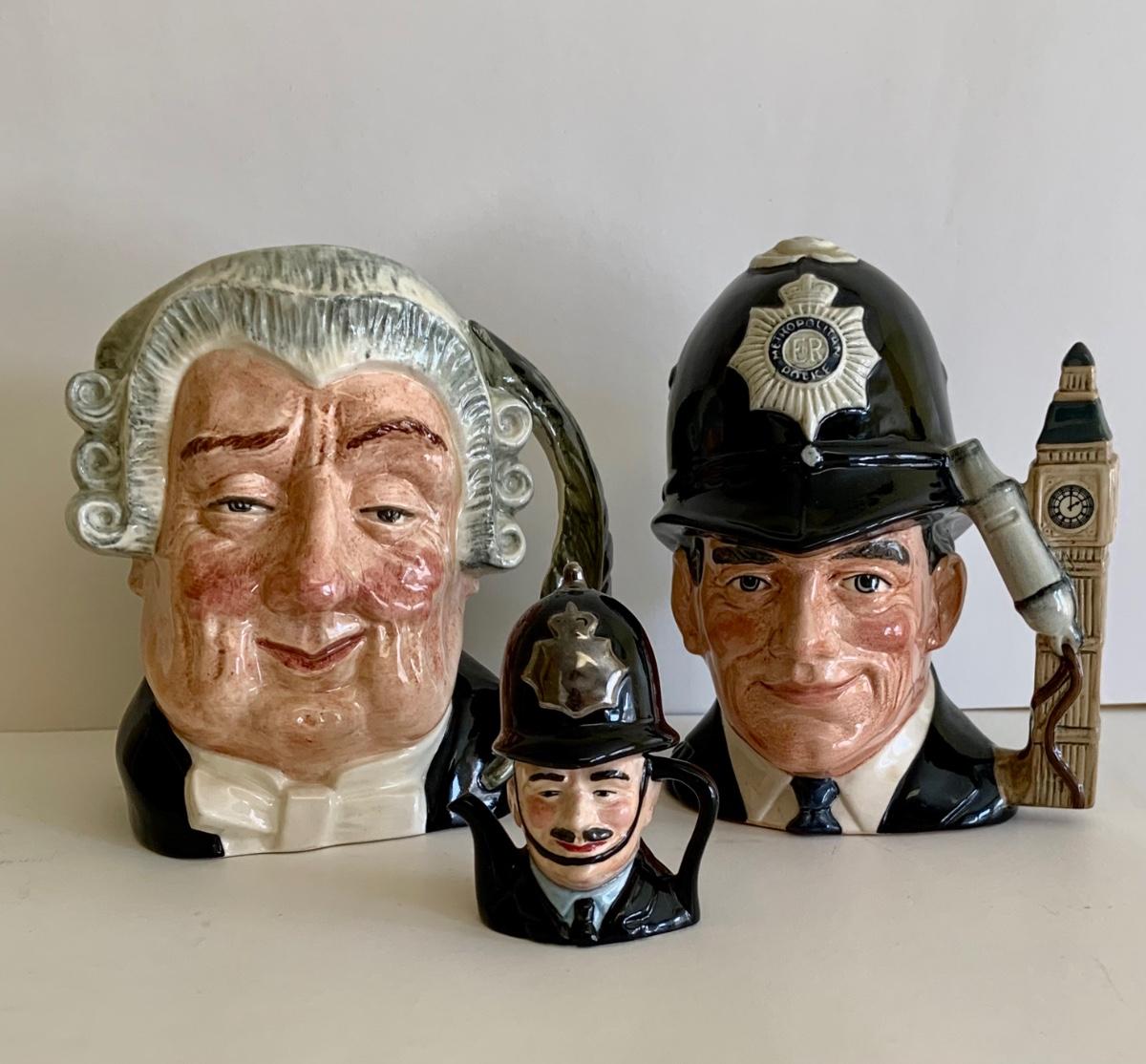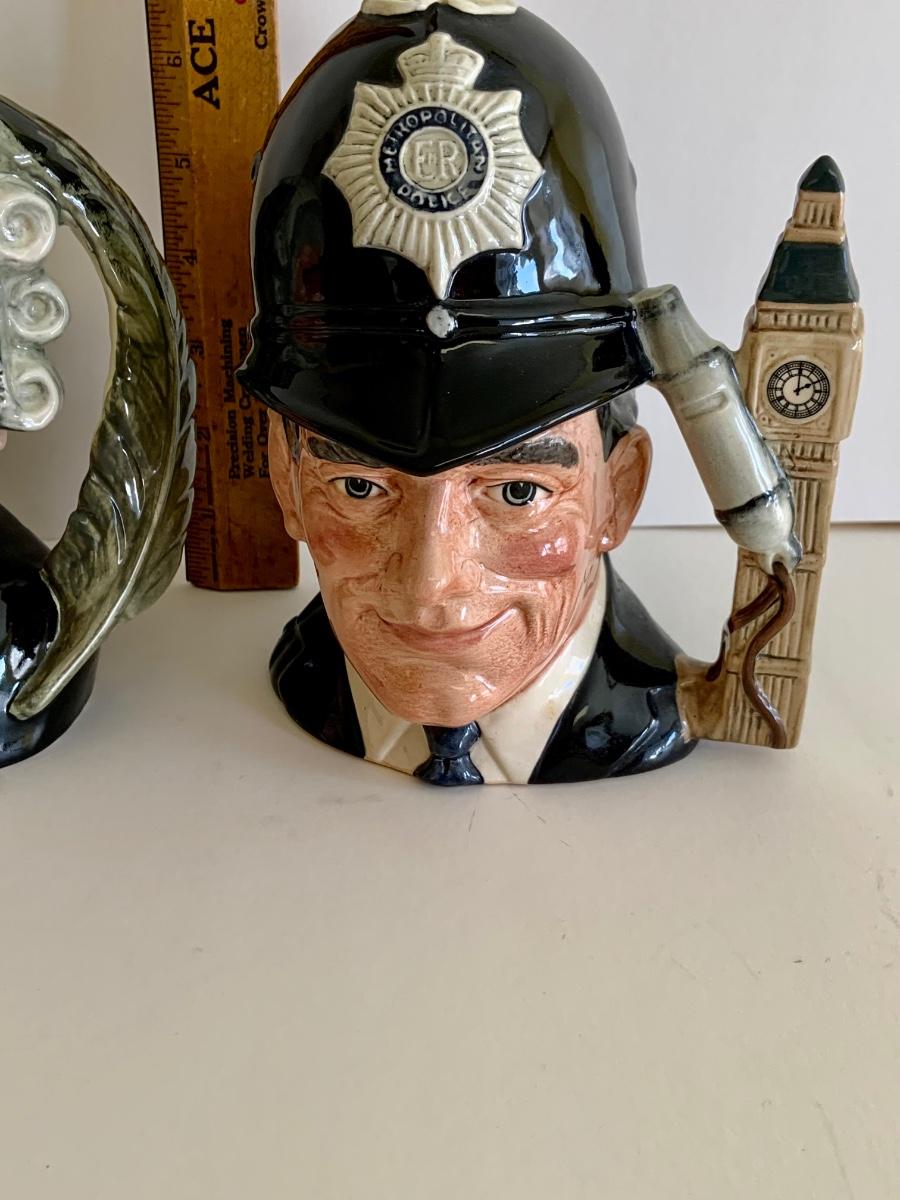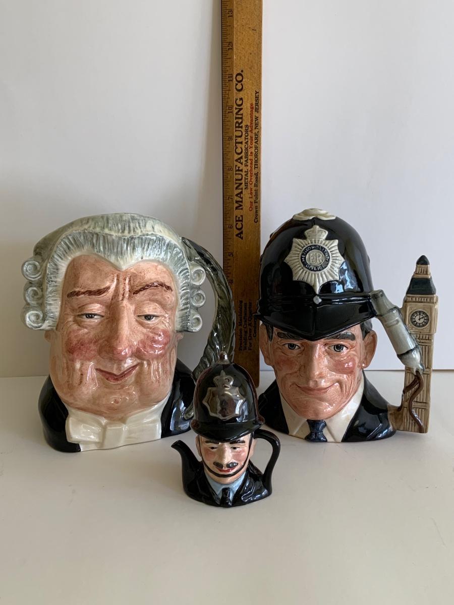 LOT:118G: Large 7" Royal Doulton Toby Mugs - 1984 Stanley James Taylor's The London Bobby & The Lawyer Mug; with Artone Bobby Mini Teapot