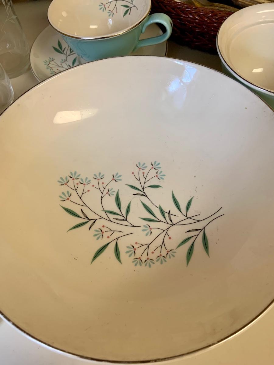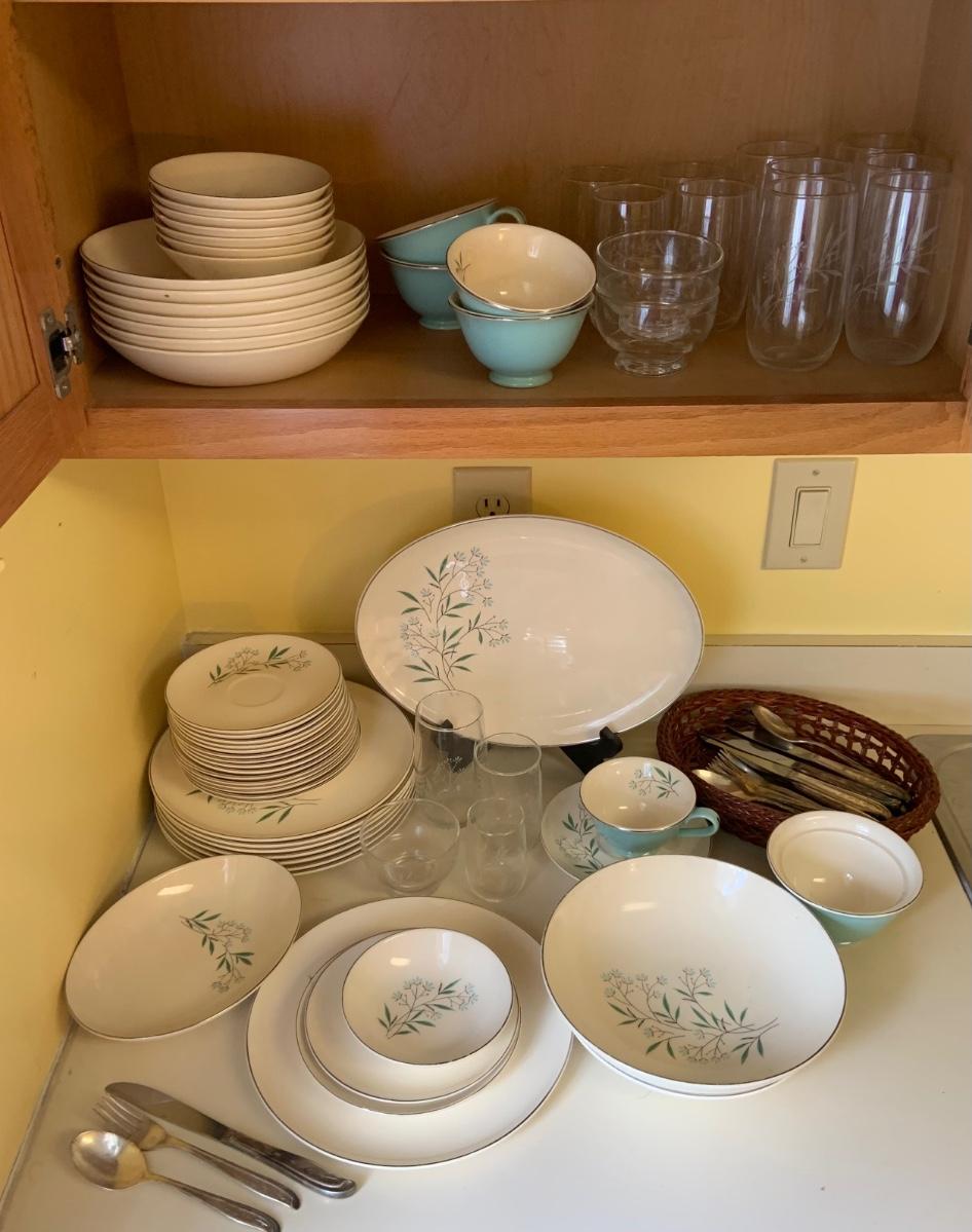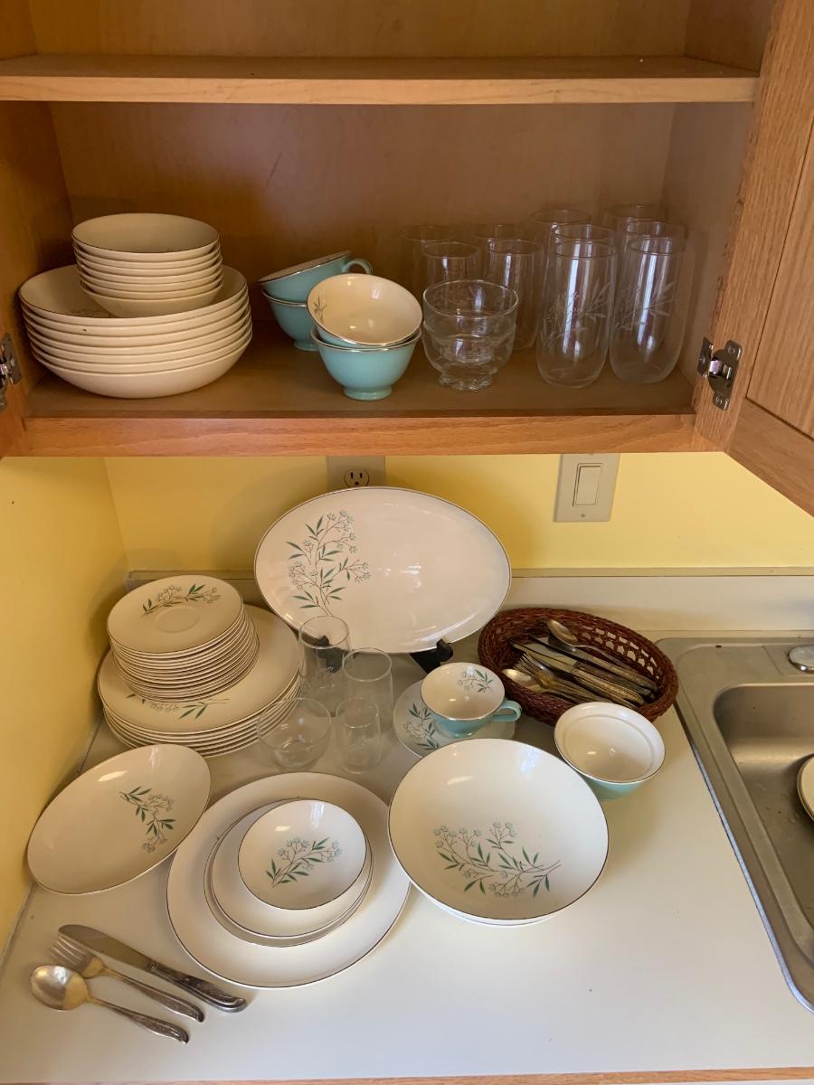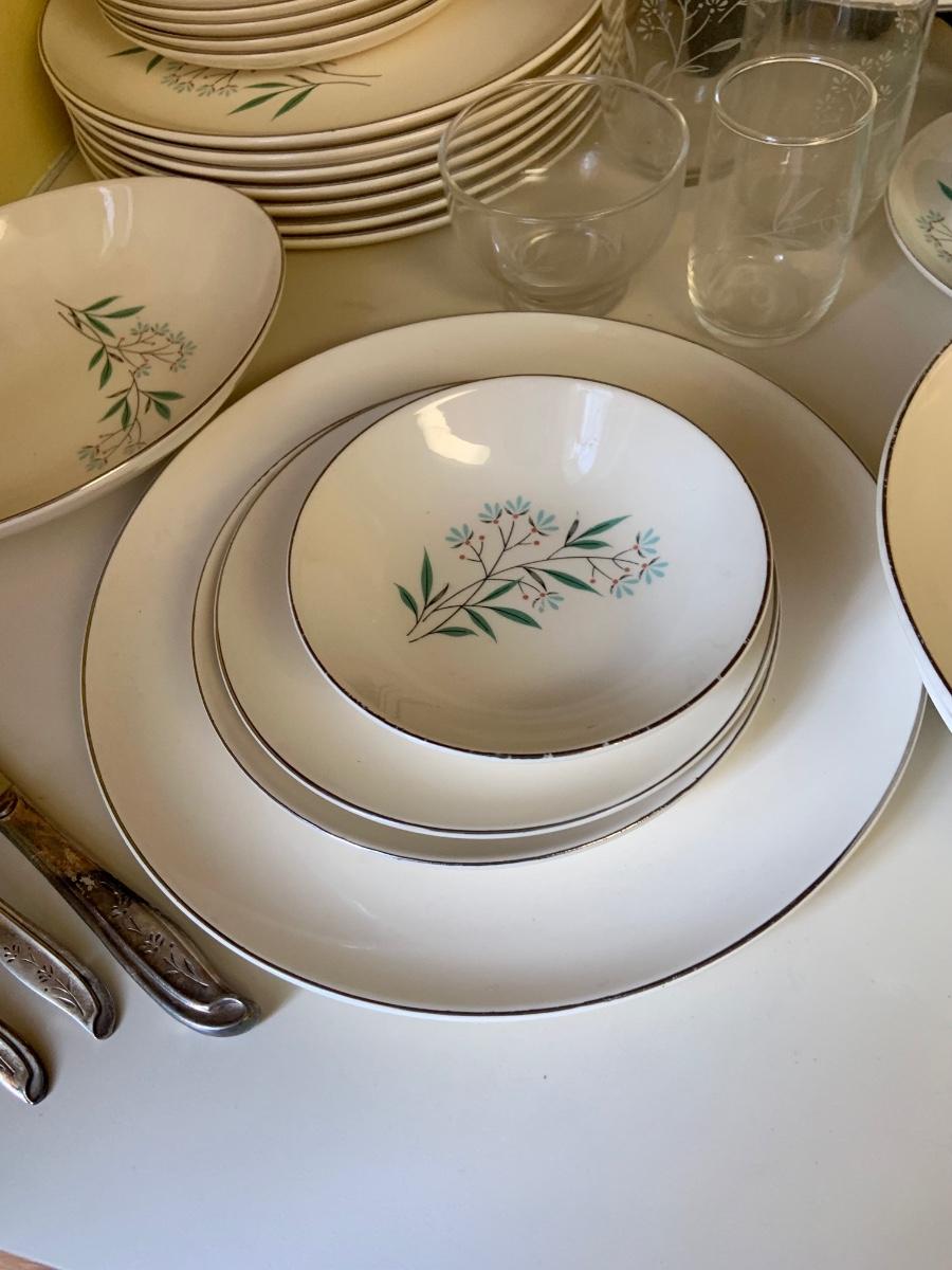 LOT:126G: Taylor Smith Taylor - Petal Lane 1959 Homemaker Set (Not Complete) Includes Dishes Bowls, Cups Glasses and Flatware. 46 Pieces of China, 16 Pieces of Glassware and 16 Pieces of Flatware
